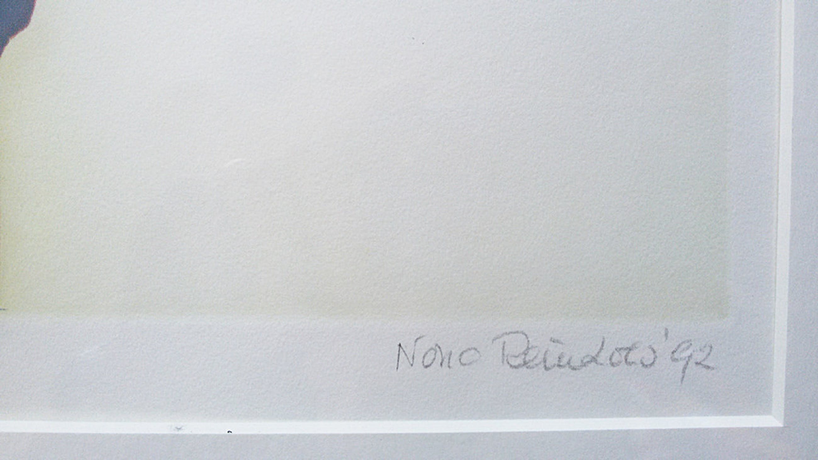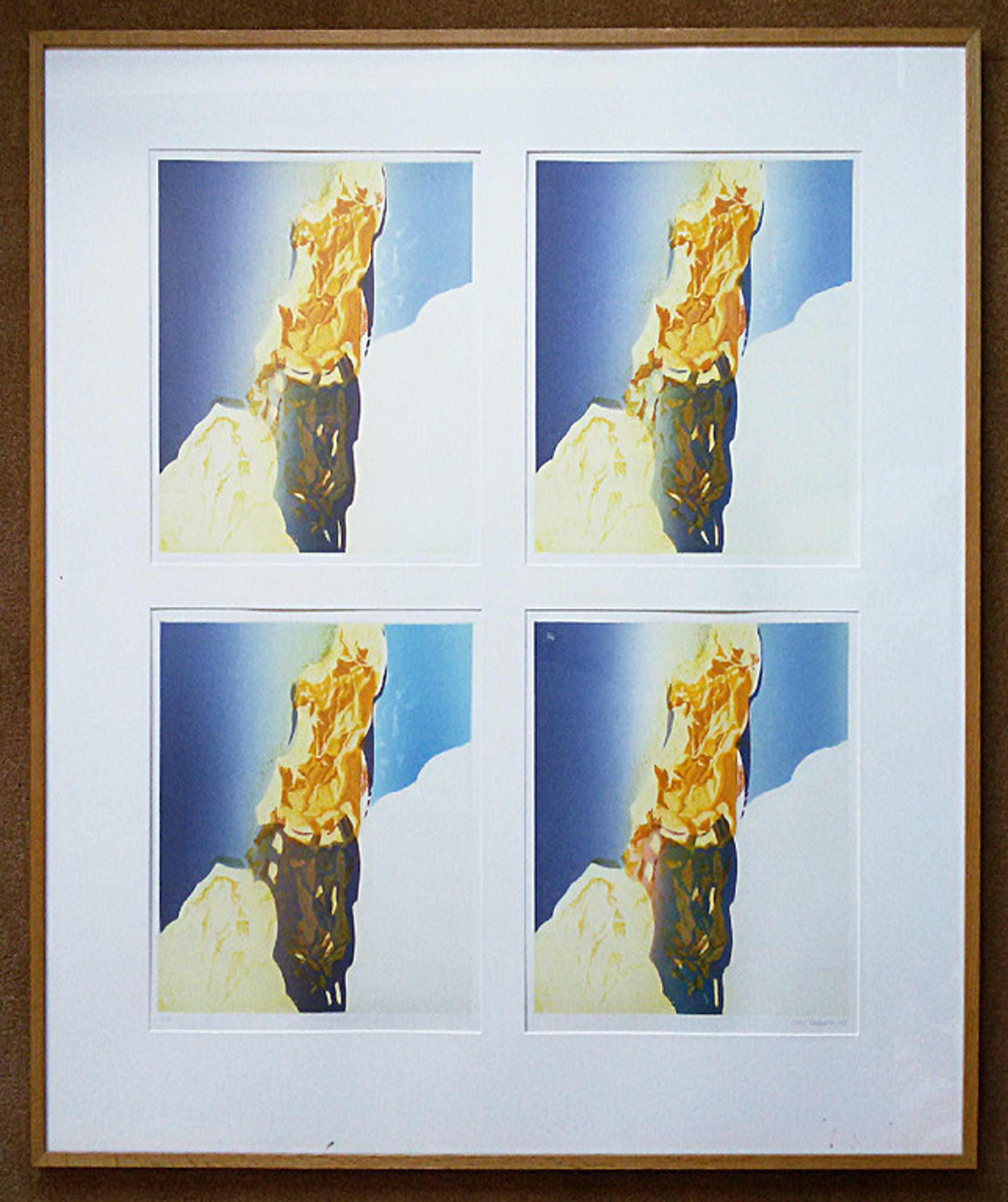Betoverend, groot werk van Nono Reinhold in houten lijst, achter glas en passe-partout. Een vierluik van dezelfde ets met misschien kleine nuances, rechtsonder met potlood gesigneerd en gedateerd (’92) en linksonder genummerd (nummer 1 uit een oplage van slechts 3 exemplaren). Afkomstig uit de kunstcollectie van ABNAMRO. Alles in zeer goede staat, al moet het geheel even uit elkaar gehaald worden om oneffenheden tussen de glasplaat en het passe-partout te verwijderen (relatief eenvoudig).