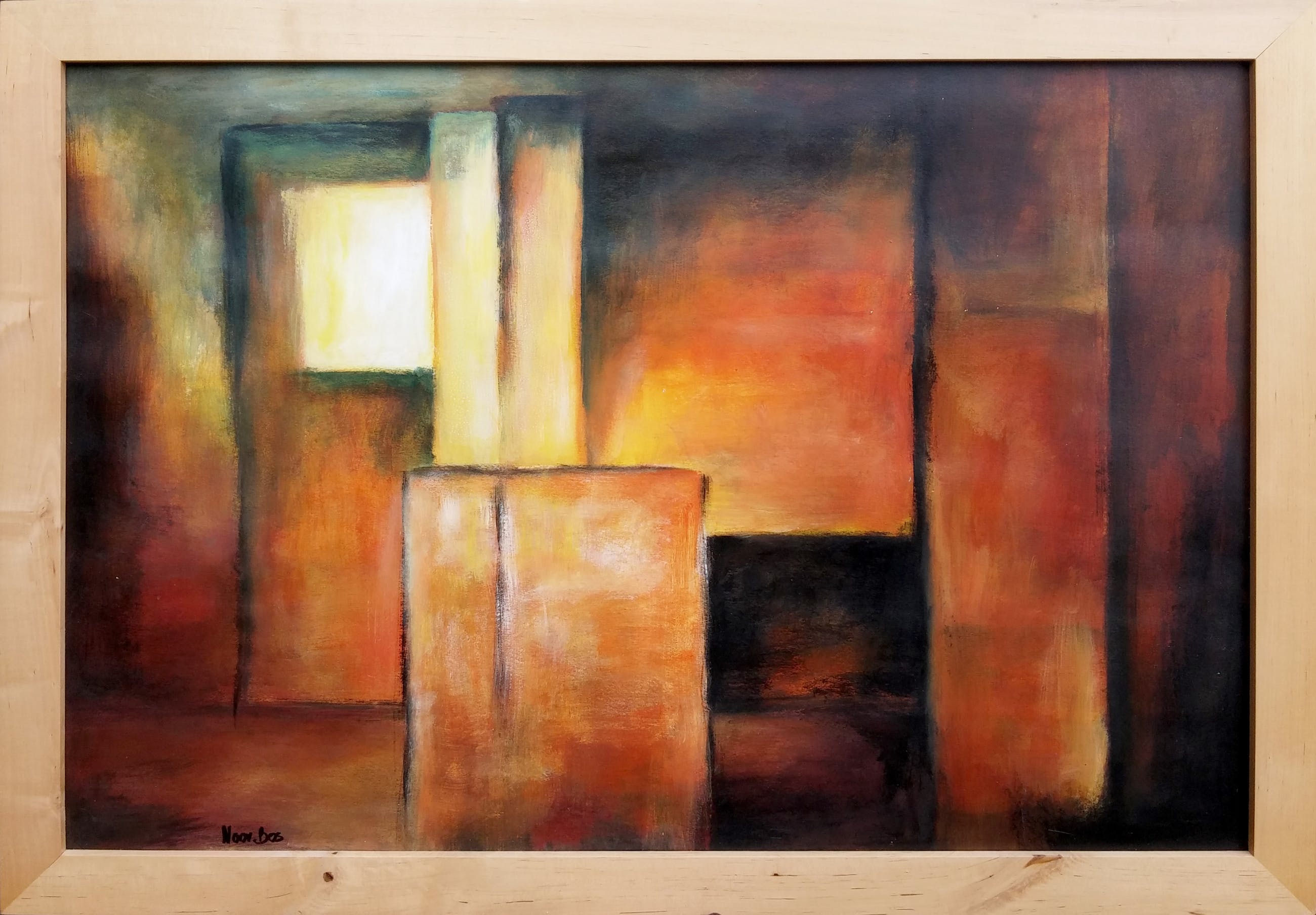 Abstract schilderij van Noor Bos getiteld 'Verkade'. Omlijst met een blank houten lijst.