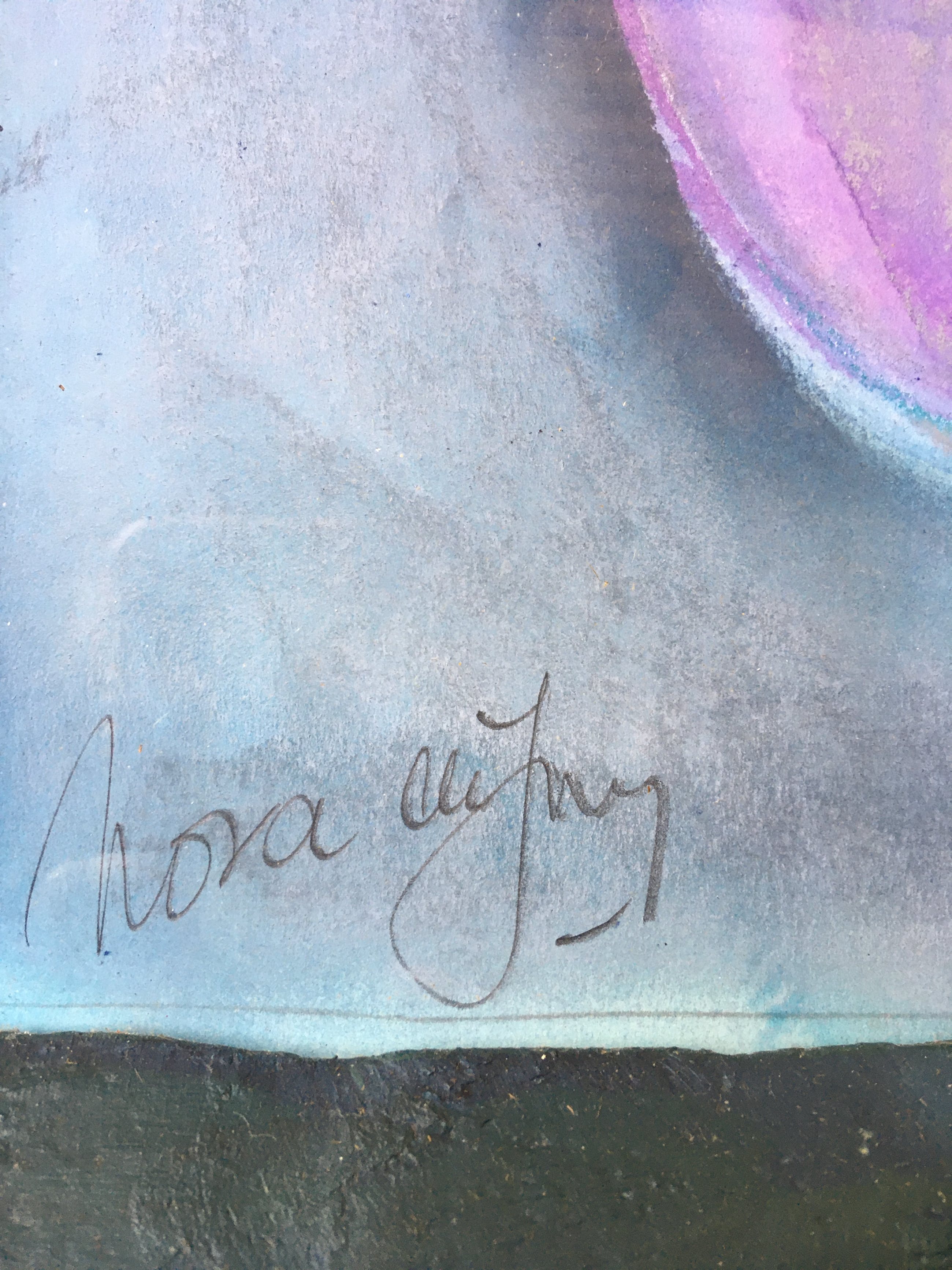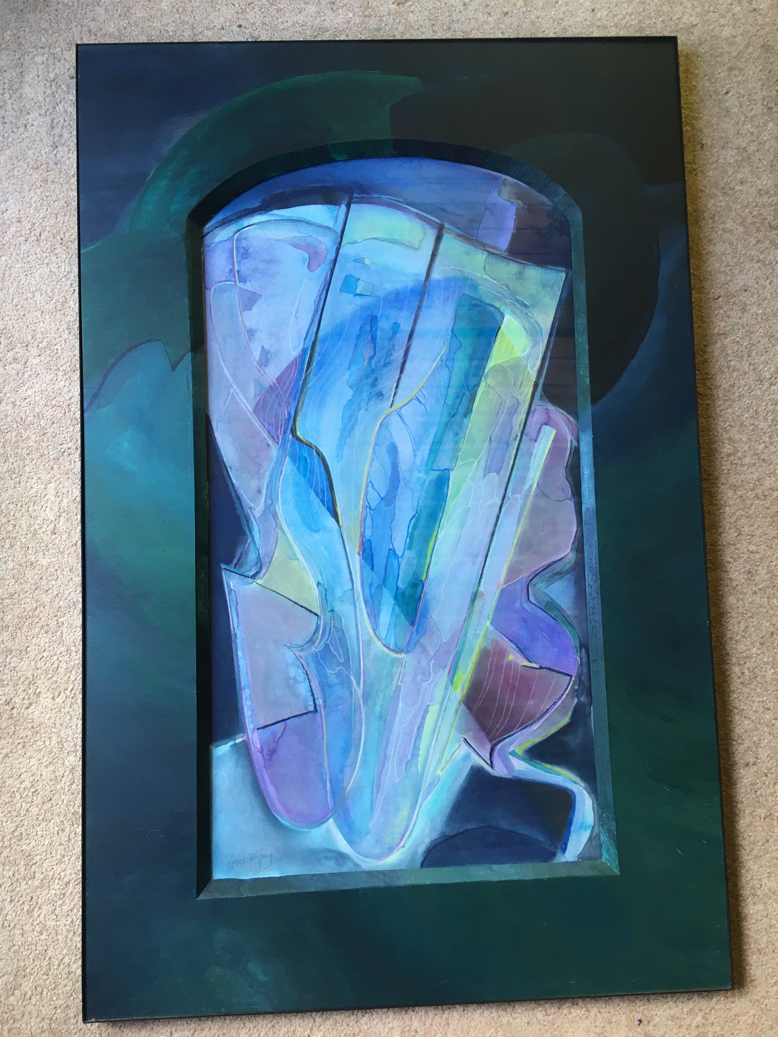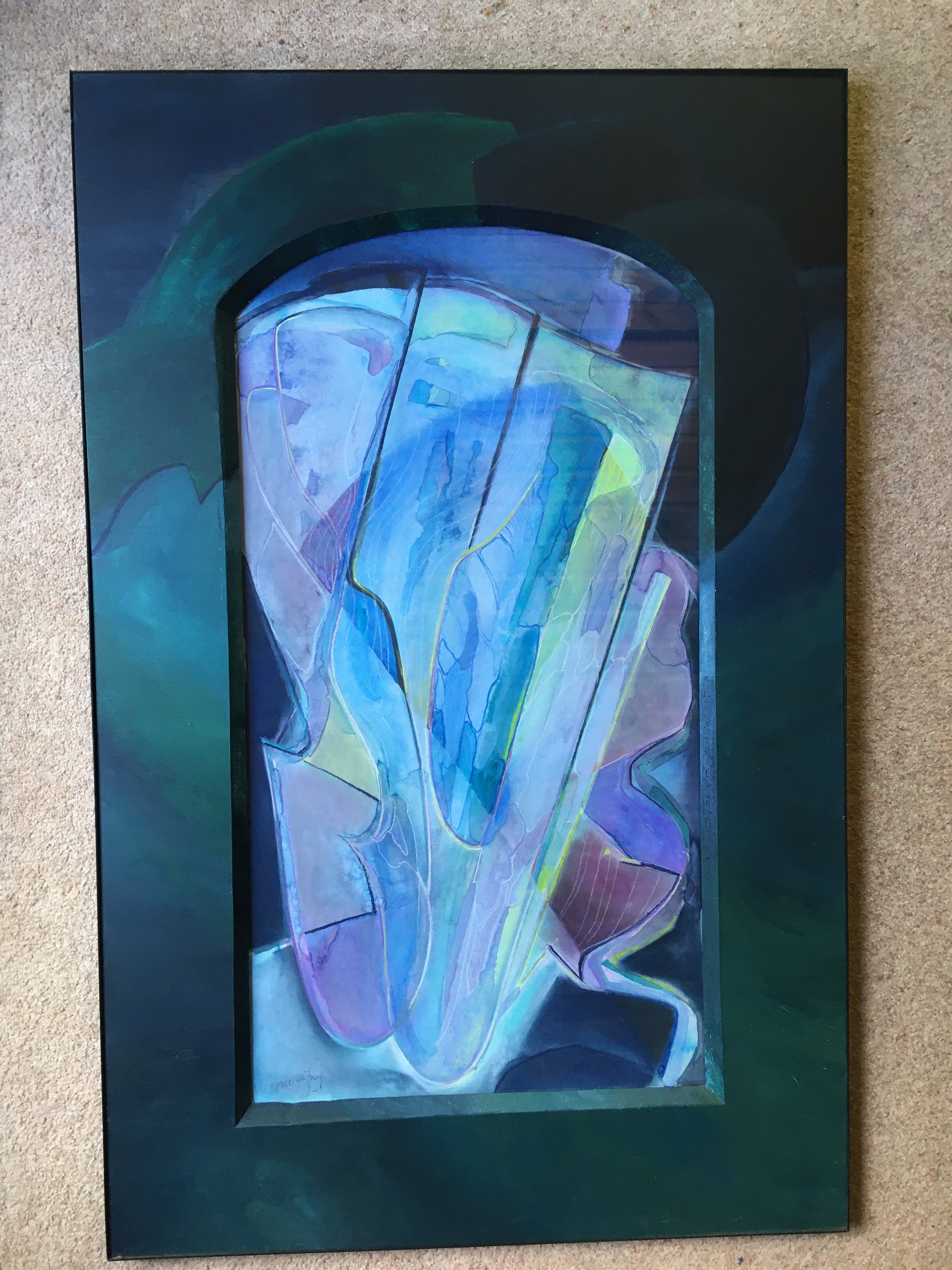 Schilderij van Nora de Jong. Gemengde techniek: Hardboard, hout, waterverf. In zeer goede staat. 125 cm X 80 cm, 15 kg.