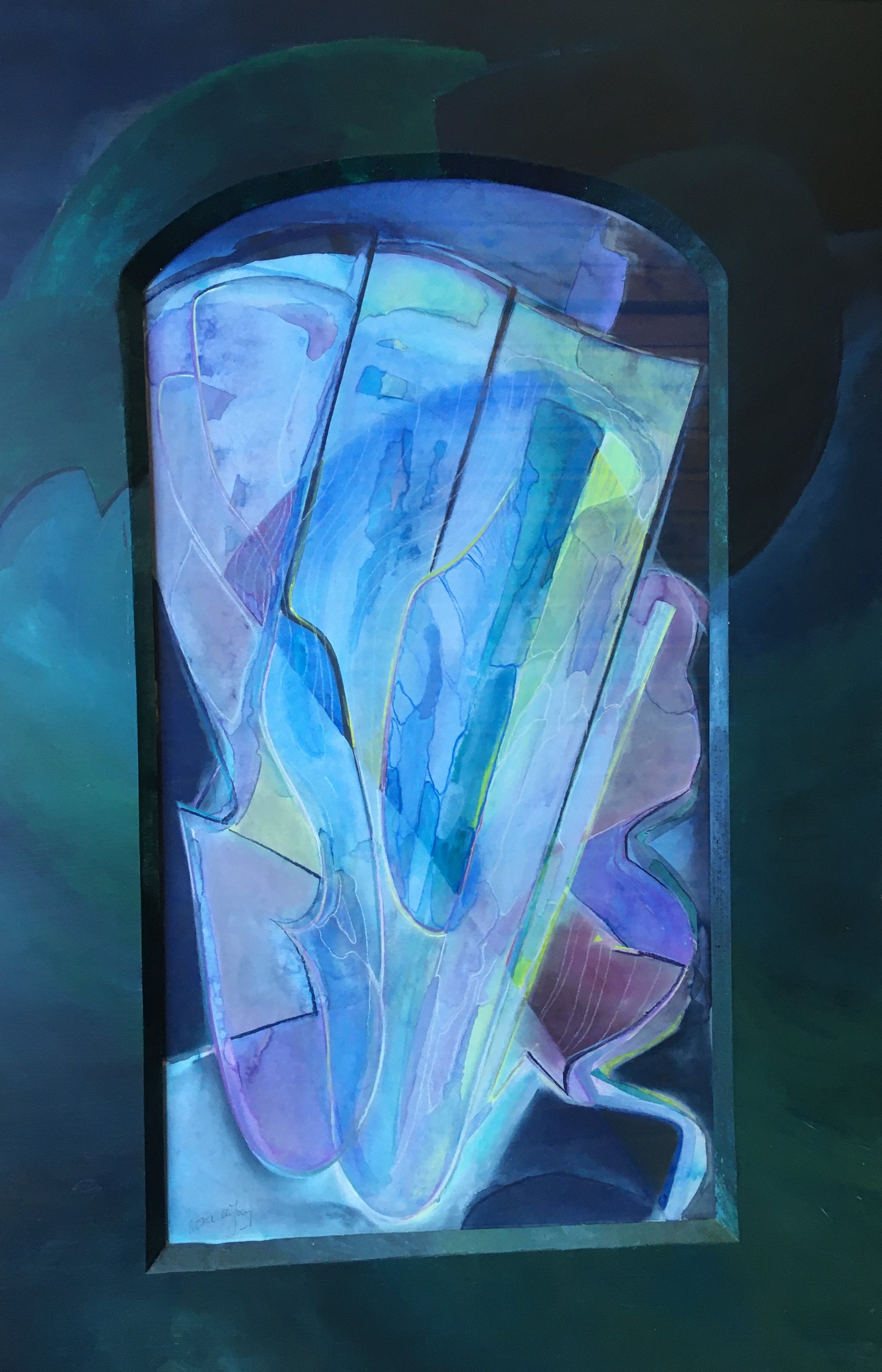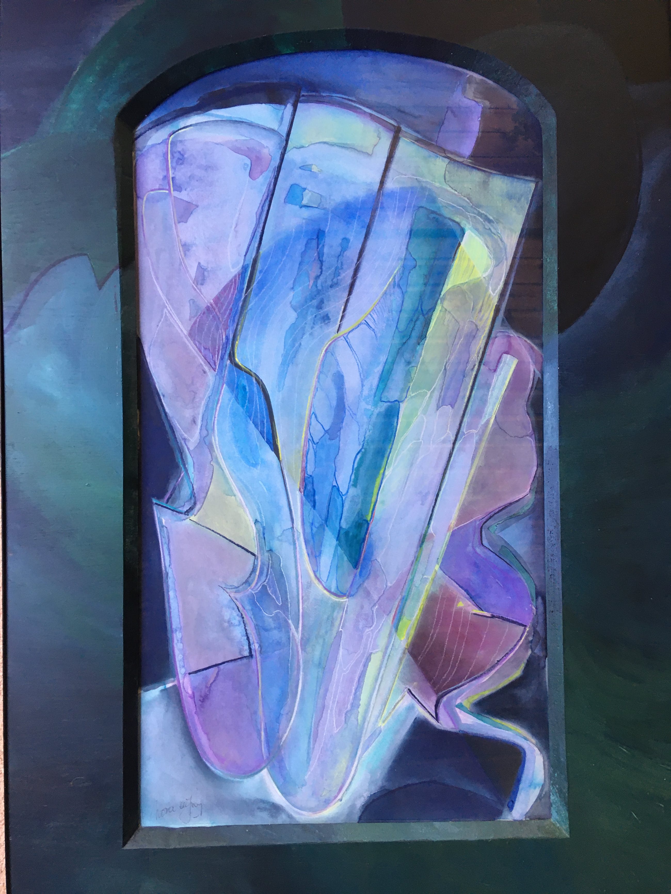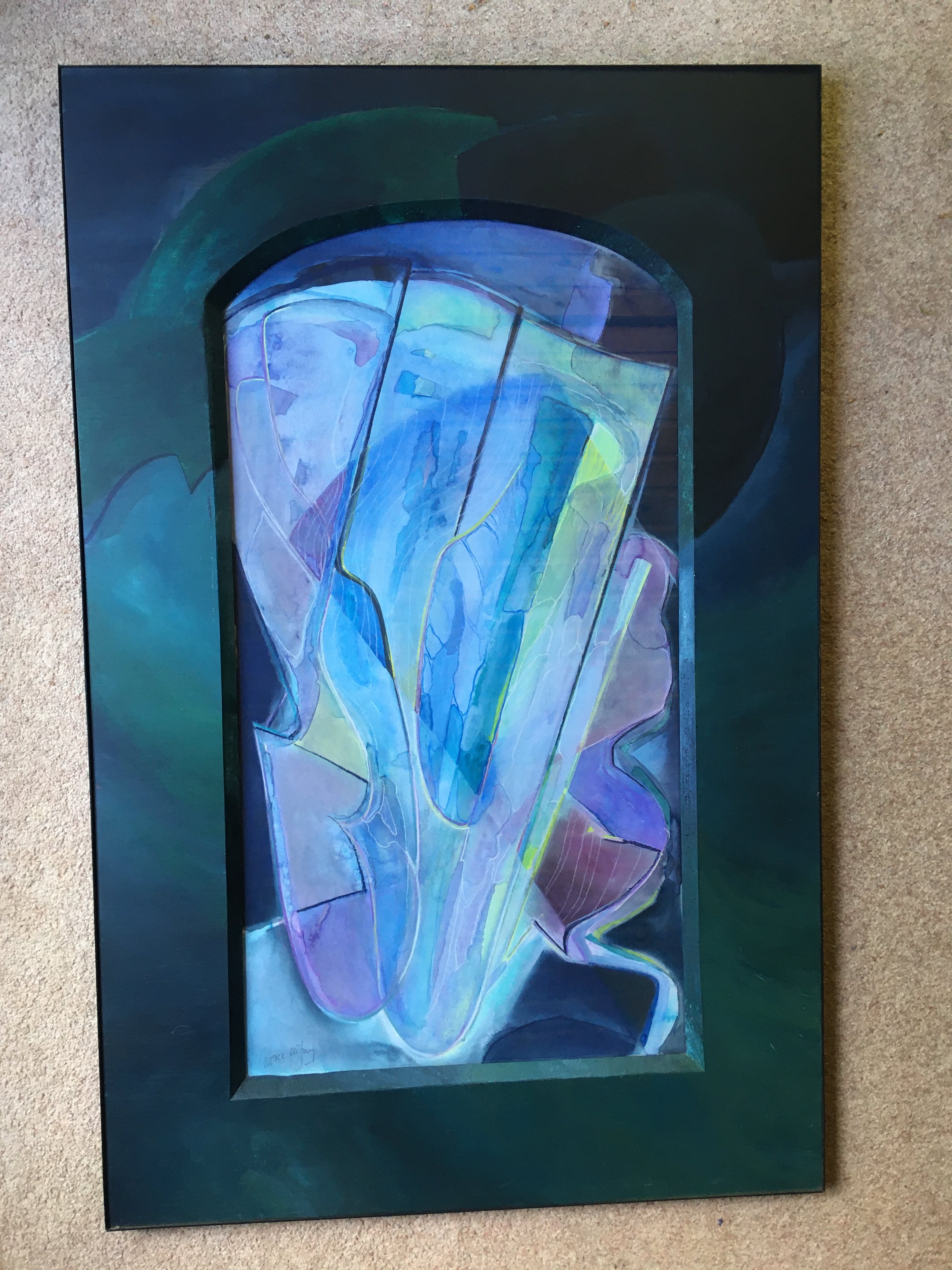 Schilderij van Nora de Jong. Gemengde techniek: Hardboard, hout, waterverf. In zeer goede staat. 125 cm X 80 cm, 15 kg.