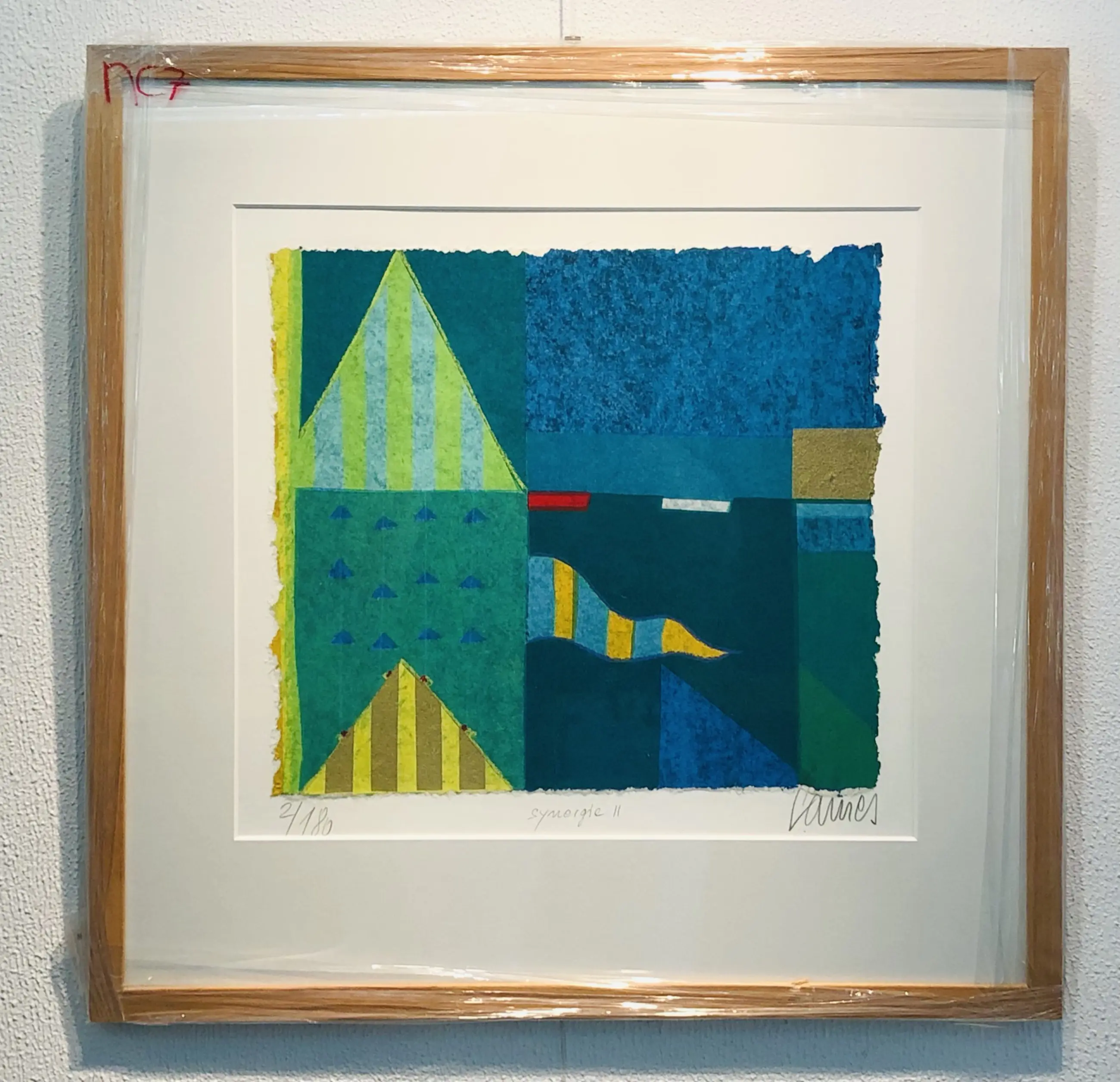 Vrolijke geometrie van Norbert Cames. Een werk dat zo aan de muur kan worden gehangen! U kunt het werk vooraf komen bekijken in de Schatkamer van galerie Rotor in Gorcum, na aankoop afhalen of verzenden per koerier met lijst of zonder lijst per aangetekende post toegestuurd krijgen. Het werk zit in een prima maar gebruikte lijst. De foto is door het glas van de lijst heen genomen.