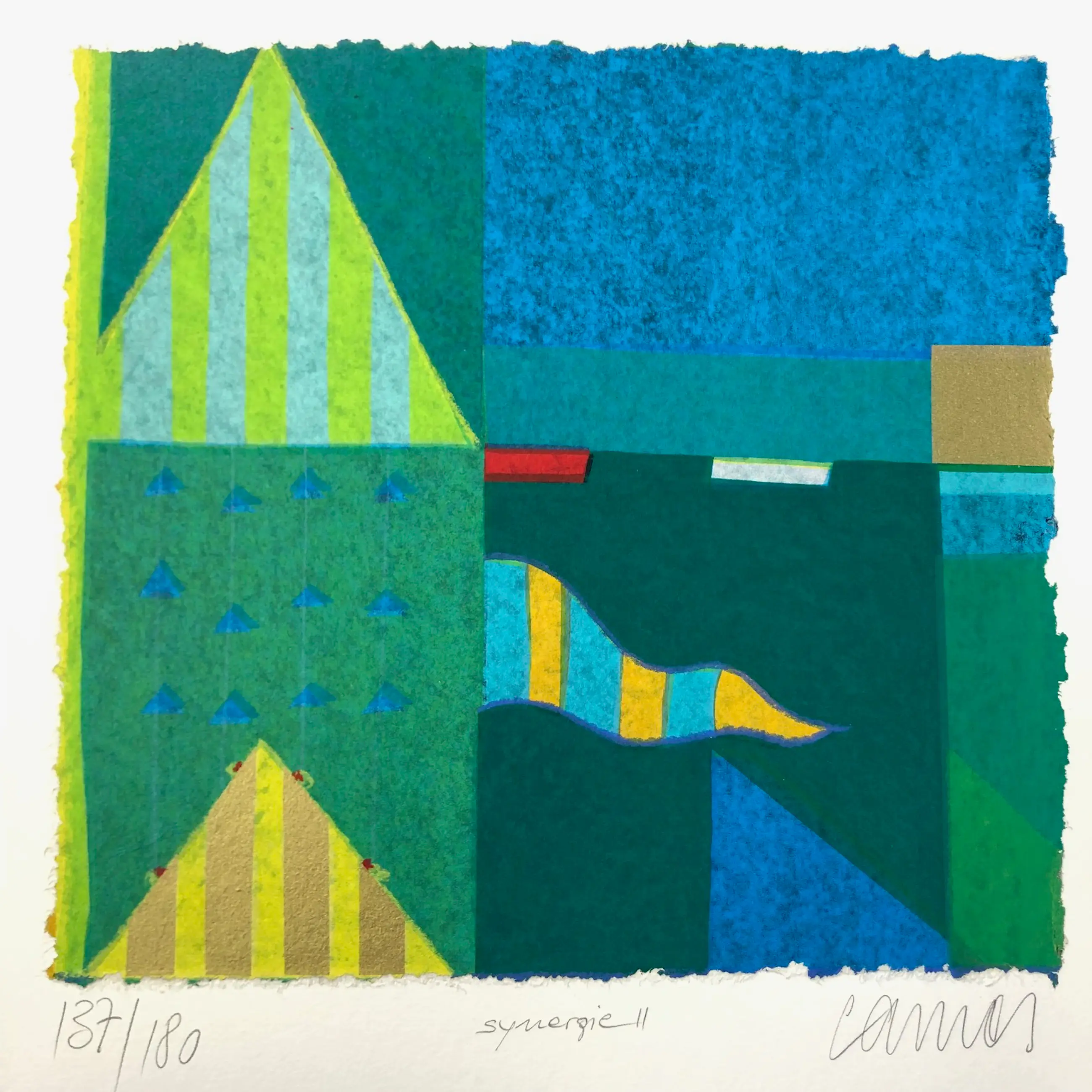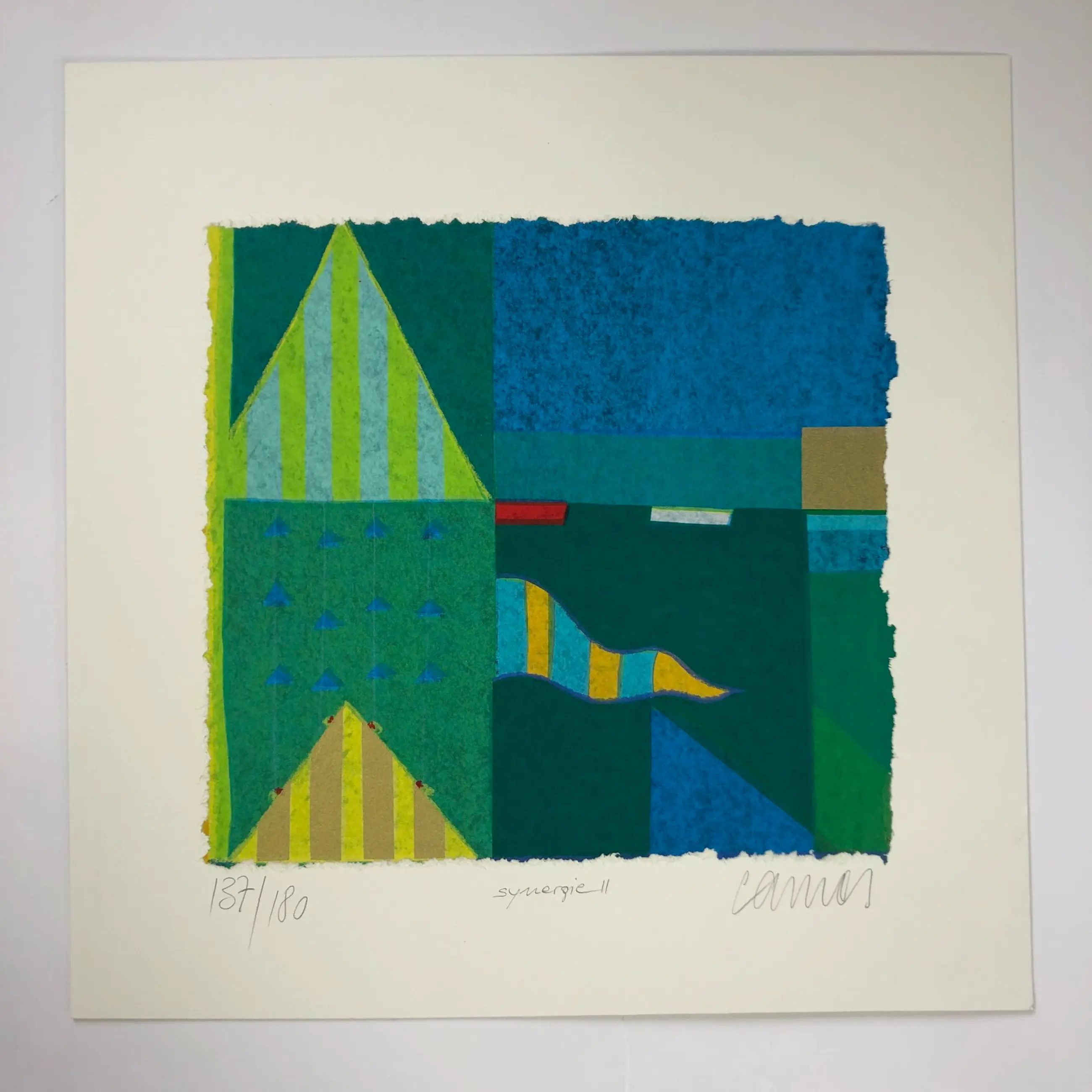 Vrolijke geometrie van de Duitse kunstenaar Norbert Cames één uit een serie van 6 werken. De zeefdruk is gemaakt op Japans papier en door de kunstenaar op karton geplakt, genummerd en gesigneerd. U kunt het werk vooraf komen bekijken in de Schatkamer van galerie Rotor in Gorcum, na aankoop afhalen of verzenden per aangetekende post toegestuurd krijgen. Ook kunnen wij uw inlijstingen verzorgen.