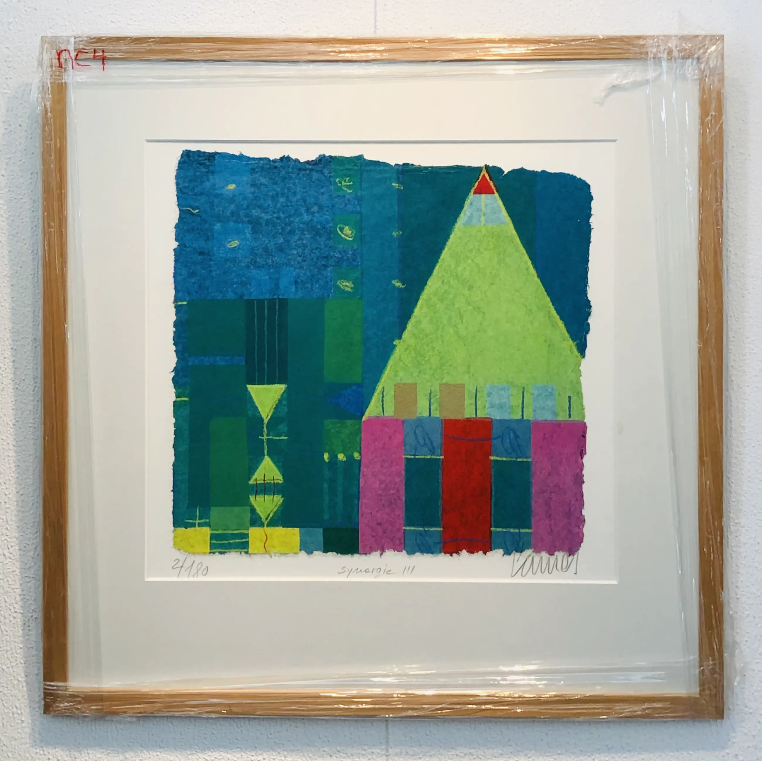 Vrolijke geometrie van Norbert Cames. Een werk dat zo aan de muur kan worden gehangen! U kunt het werk vooraf komen bekijken in de Schatkamer van galerie Rotor in Gorcum, na aankoop afhalen of verzenden per koerier met lijst of zonder lijst per aangetekende post toegestuurd krijgen. Het werk zit in een prima maar gebruikte lijst. De foto is door het glas van de lijst heen genomen.