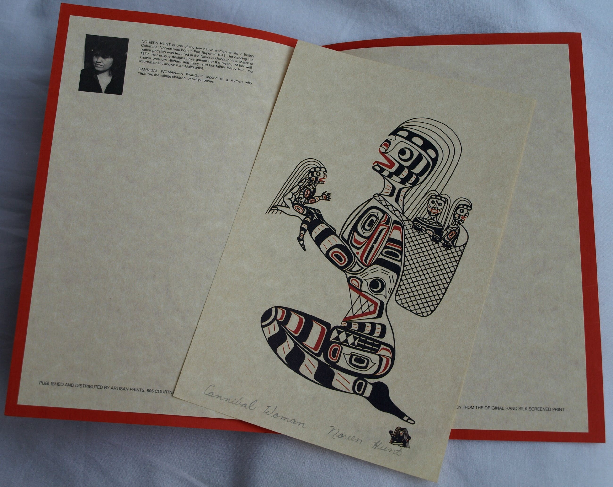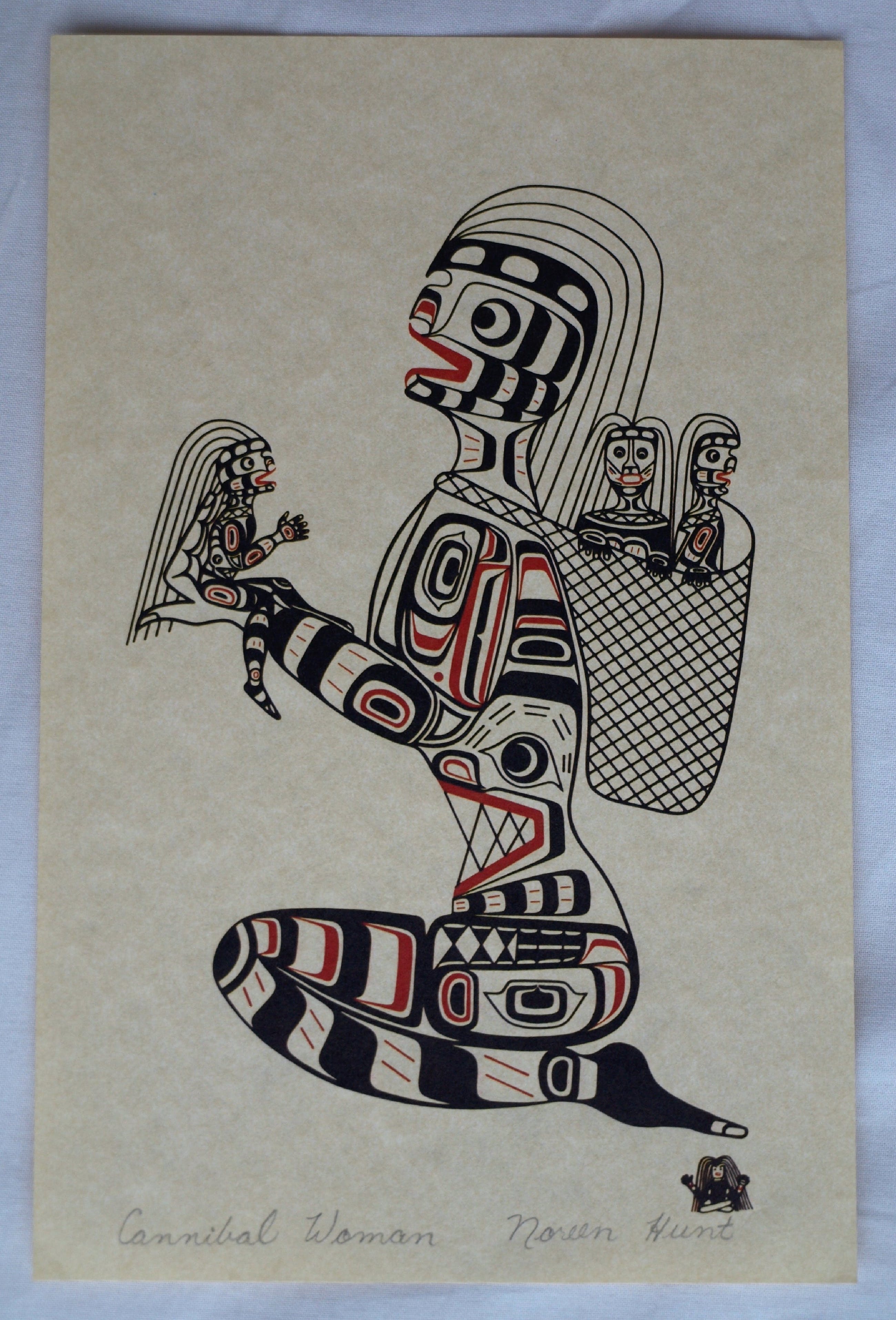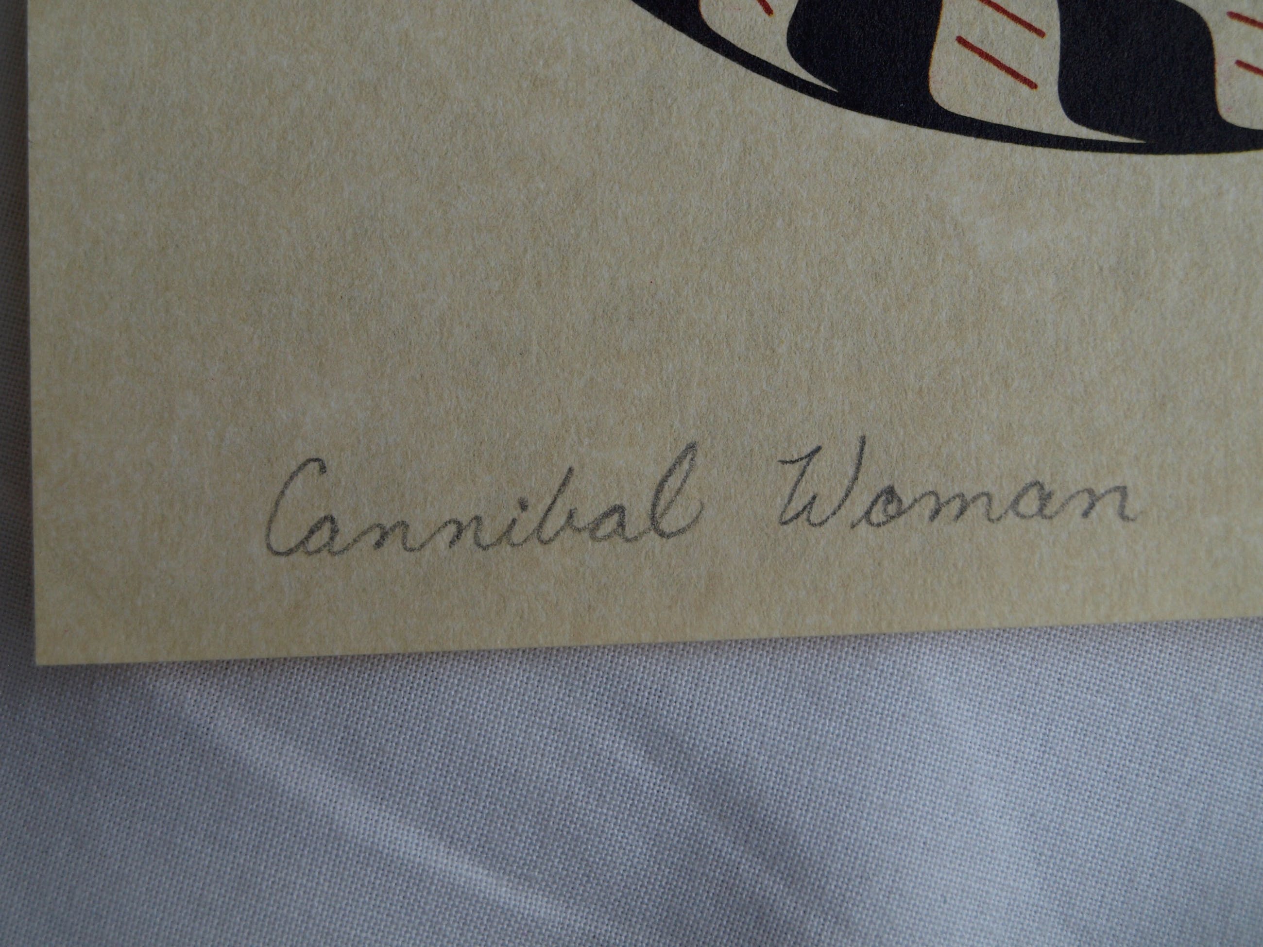 Een kleine zeefdruk van de Canadese kunstenares Noreen Hunt (1949), naar een werk van de kunstenares uit 1979, getiteld “Cannibal Woman”.