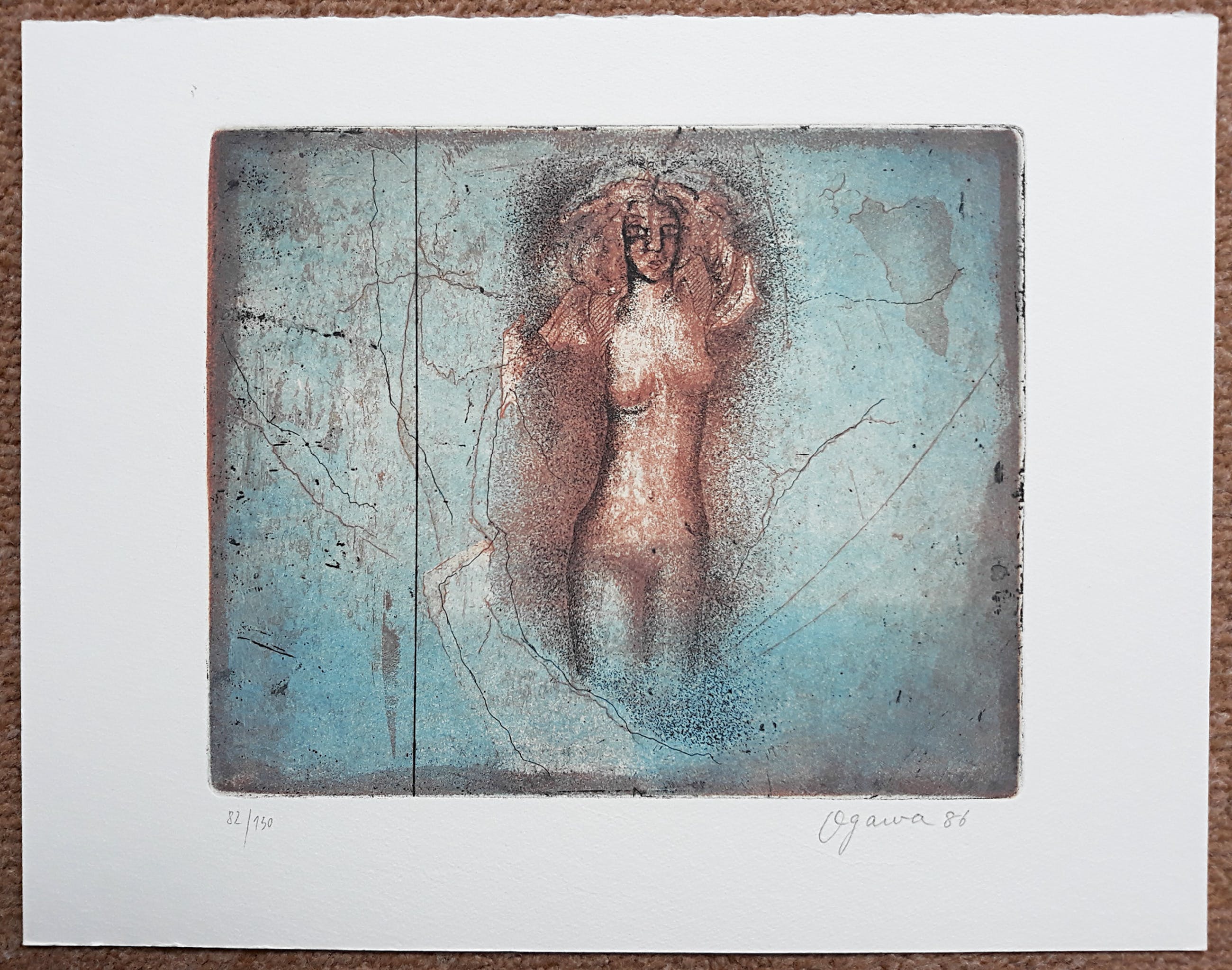 Zeer mooi naakt van de Japanse kunstenares Noriko Ogawa. Aquatint ets op stevig papier, met potlood gesigneerd, gedateerd (‘86) en genummerd (82/130). In uitstekende conditie.