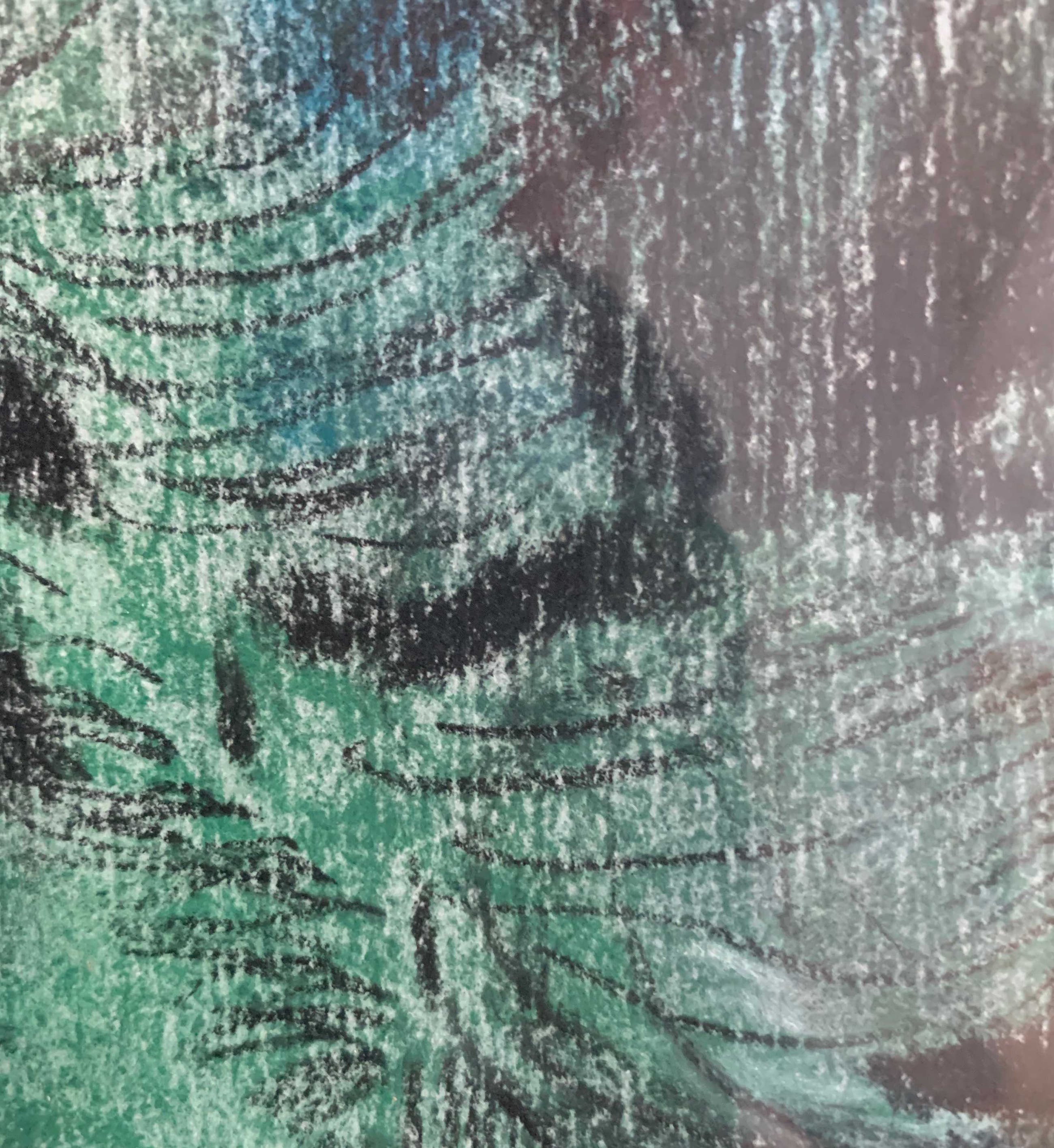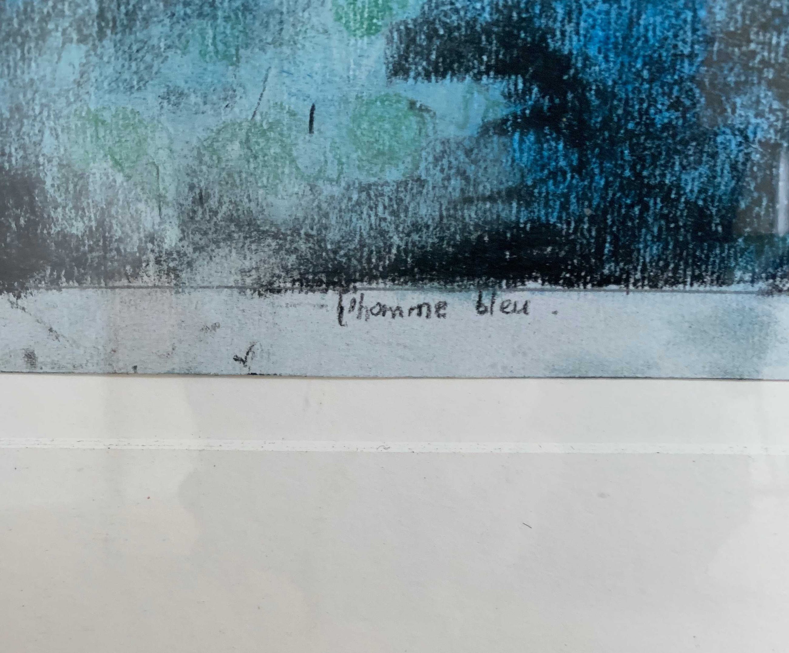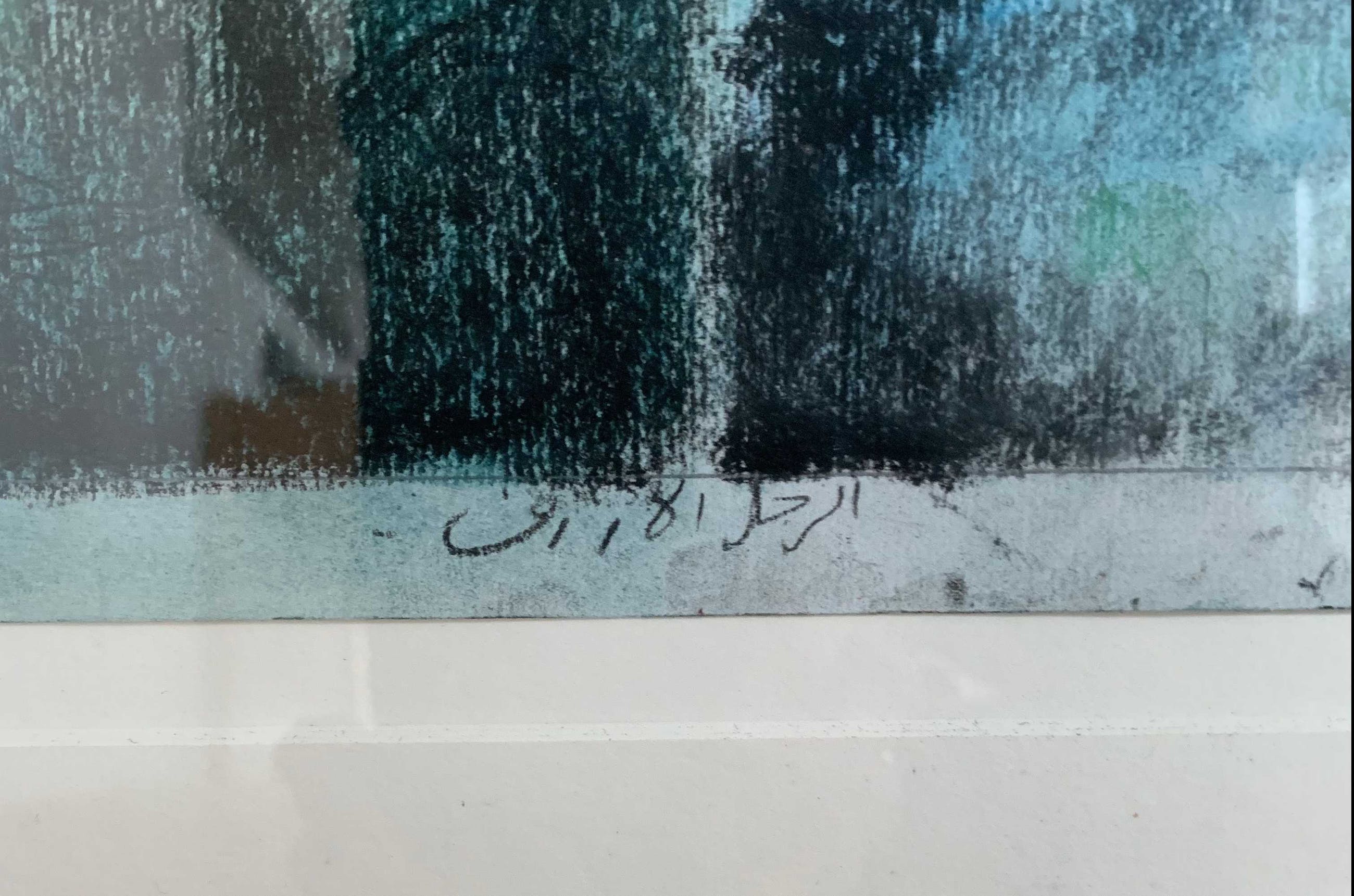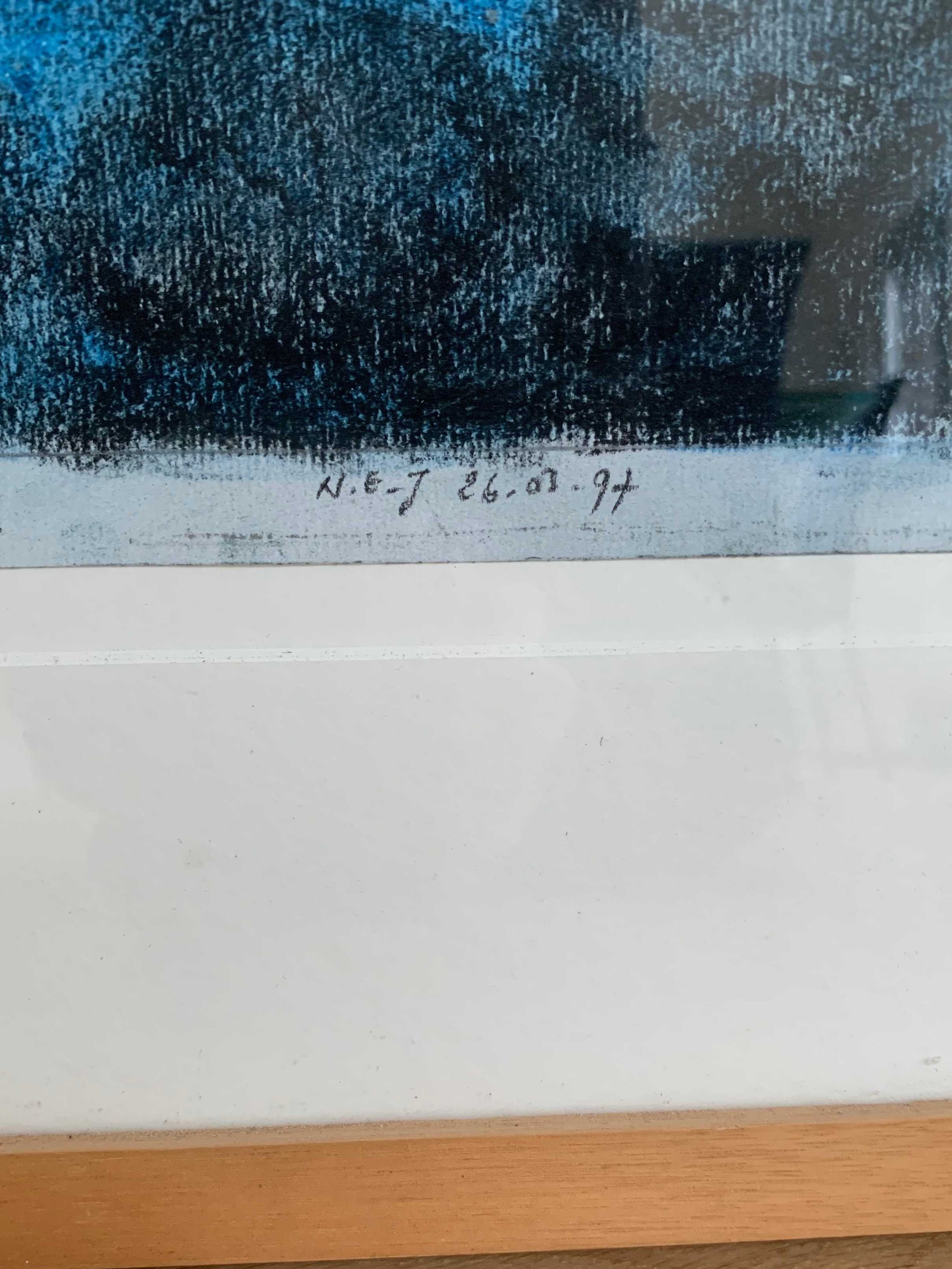 Pastelkrijt, van diep zwart naar lichtblauw en witte accenten, in met potlood getrokken kader. vingerafdrukken zichtbaar in de smalle marge tussen potloodkader en papierrand. in potlood voorzien van datum, titel en cijfernotatie.