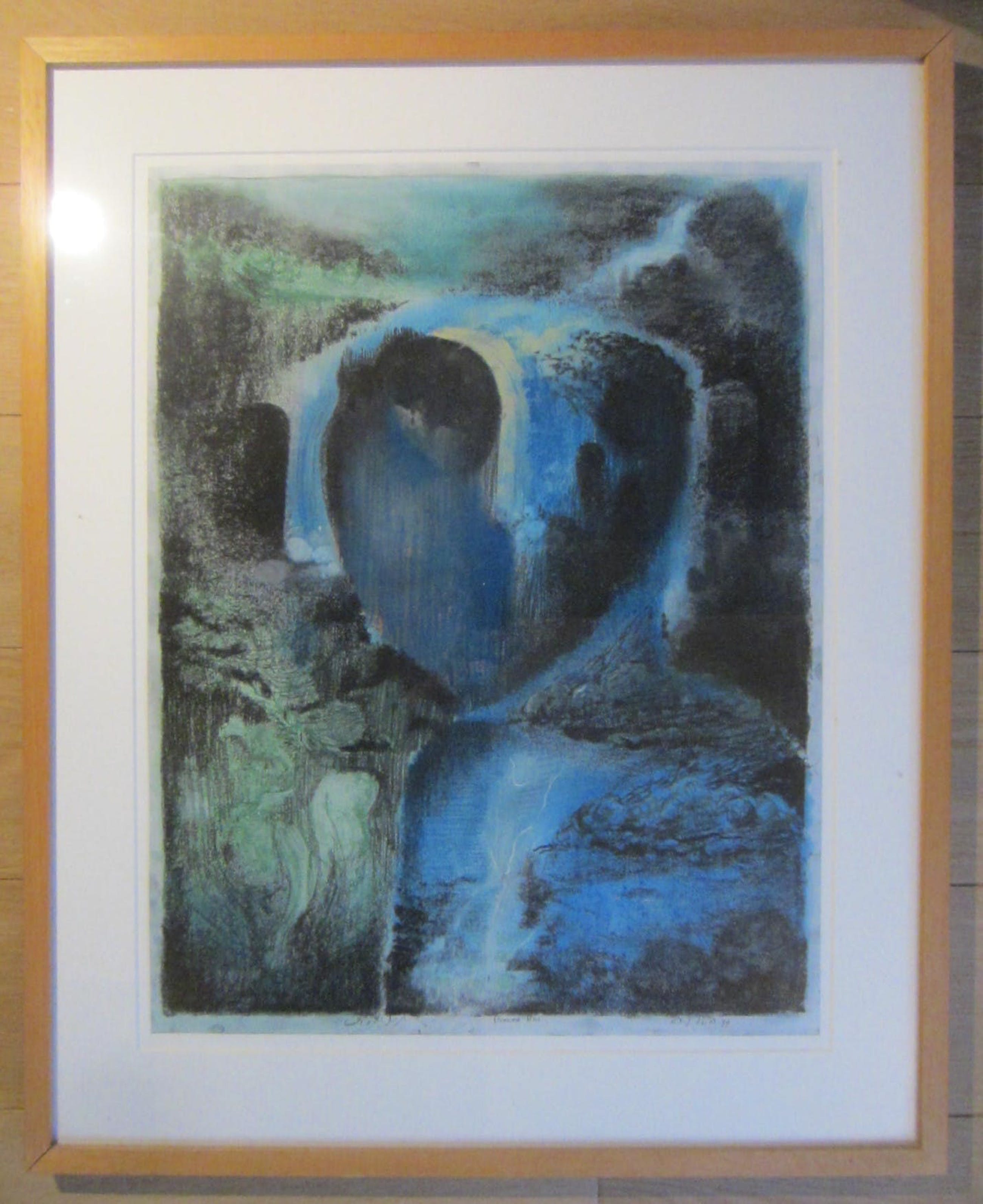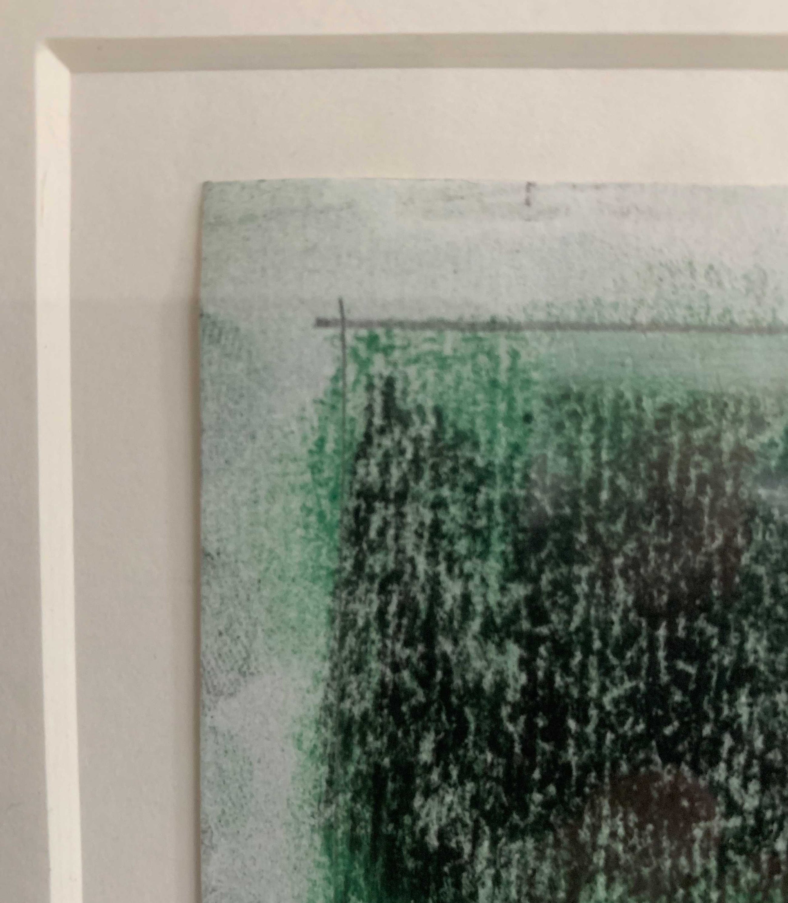 de conditie van het werk zelf is goed, zit in een houten lijst achter glas, de kartonnen afsluiting aan de achterzijde is wat gebobbeld.