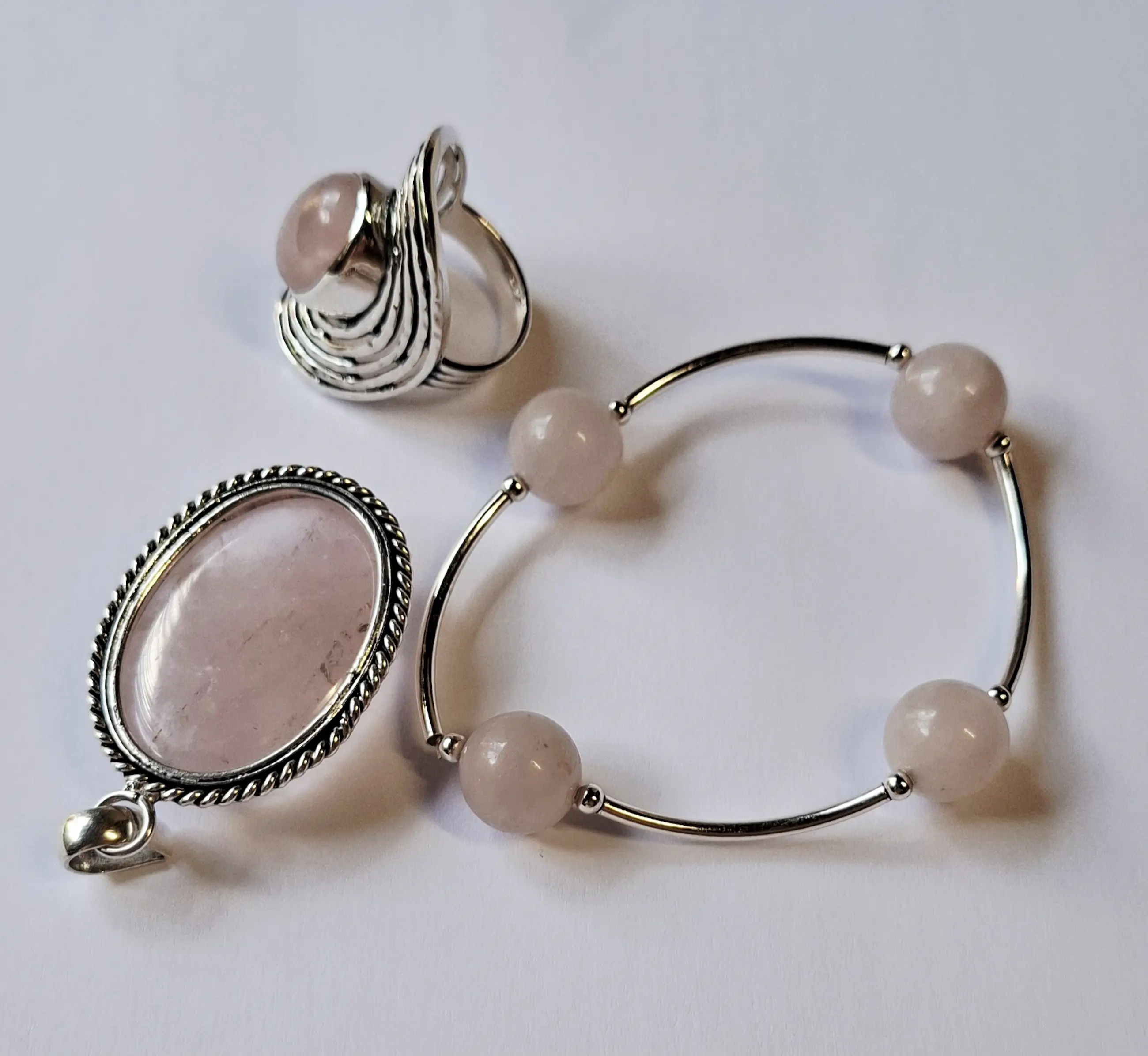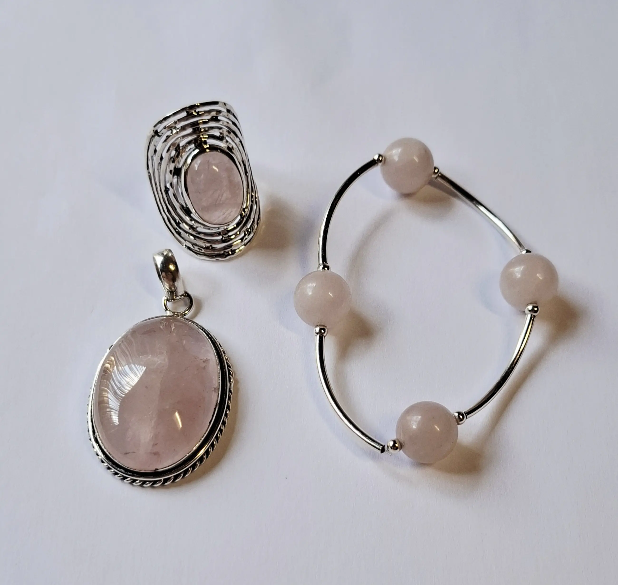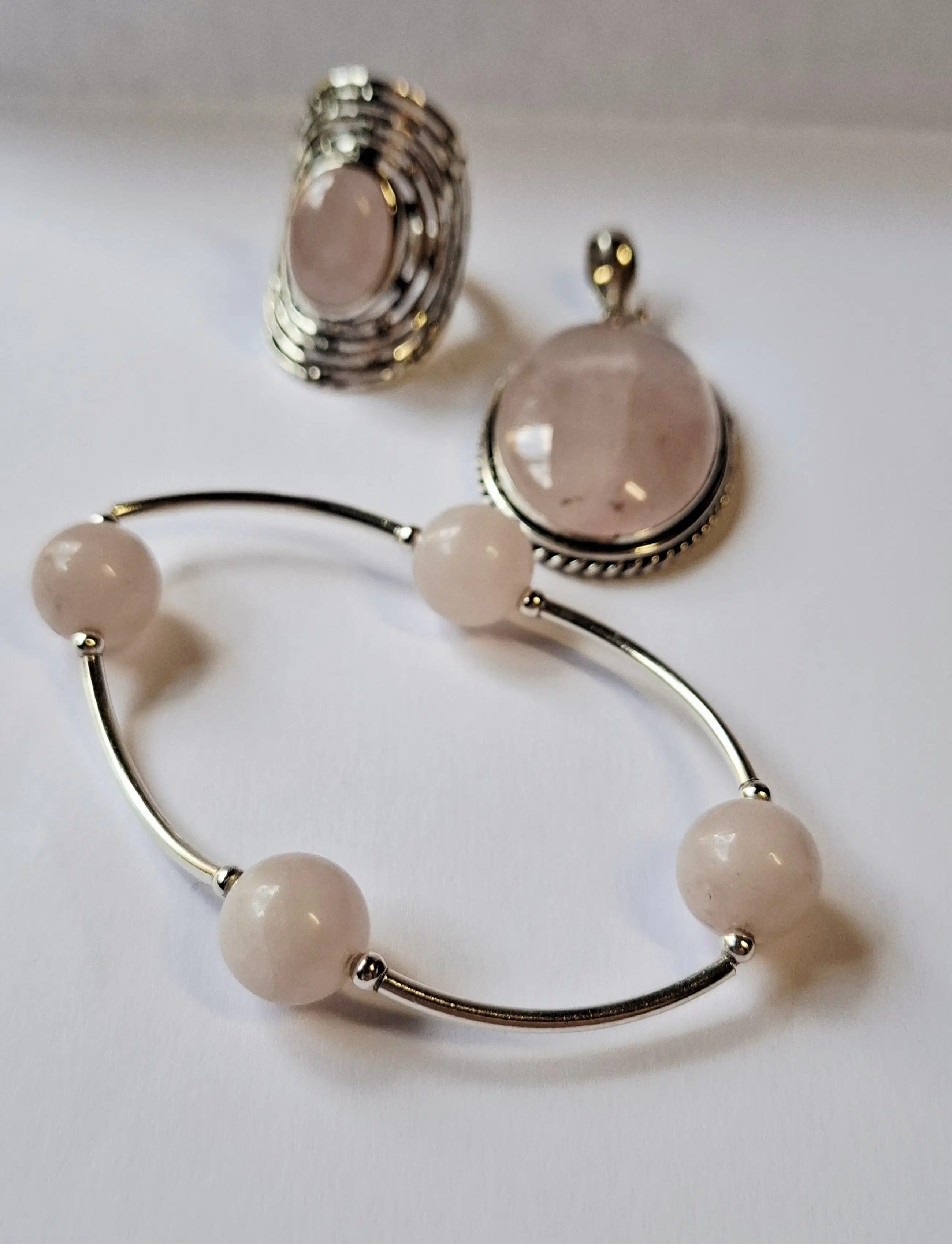 Nieuwe zilveren Armband met 4 ronde rozenkwartsen maten 17,18,19,20 cm. Weegt in totaal 12,66 gram .deze komt uit een prive Collectie nog nooit gedragen heeft altijd in een vitrine kastje gelegen eigenlijk is het nog nieuw voor een sieradenset uit 1980 .