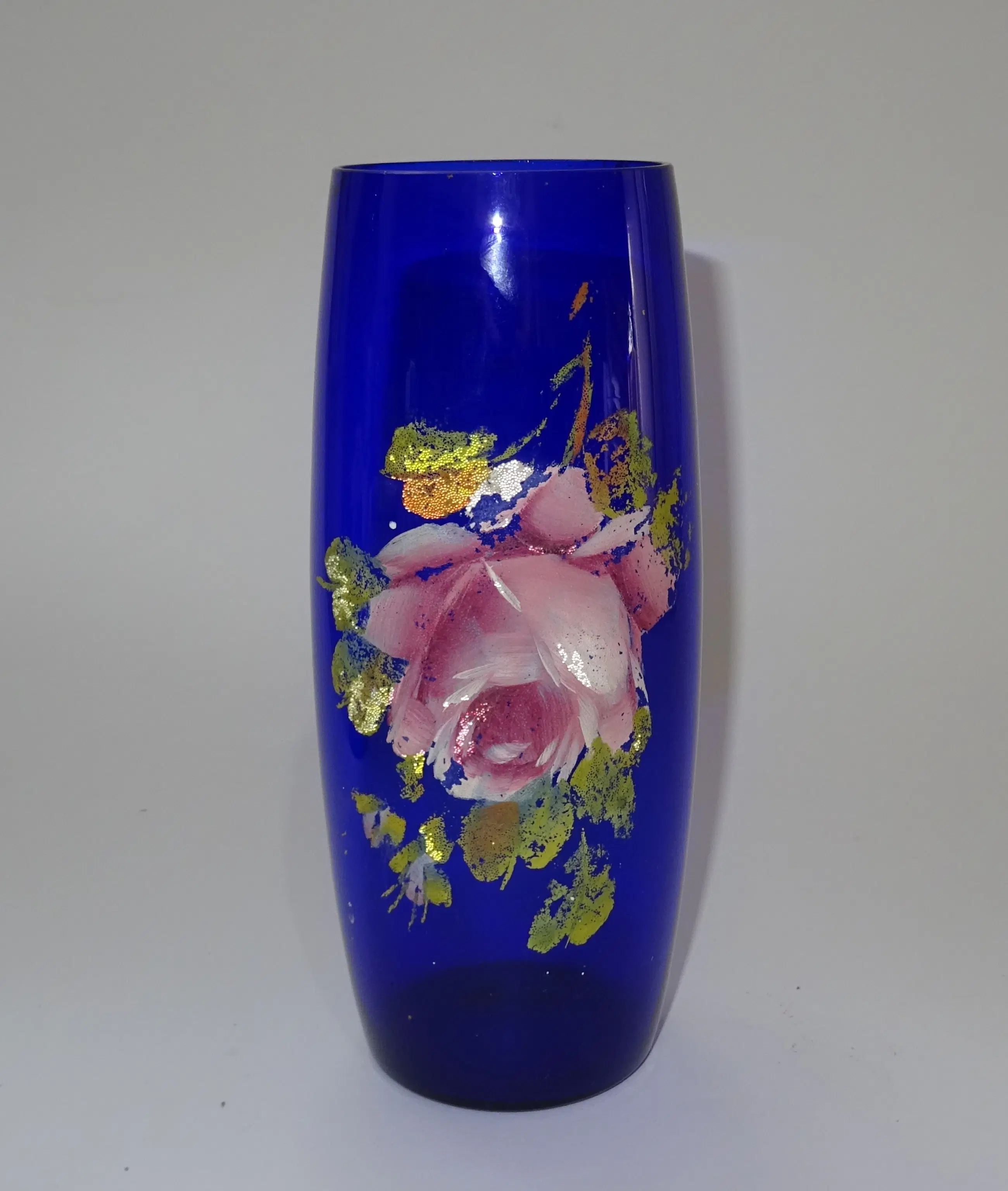 3 Tsjechische kobalt blauwe vazen met een beschildering van bloemen. De kleine vaas met emaille beschildering. Ca. 1930 .