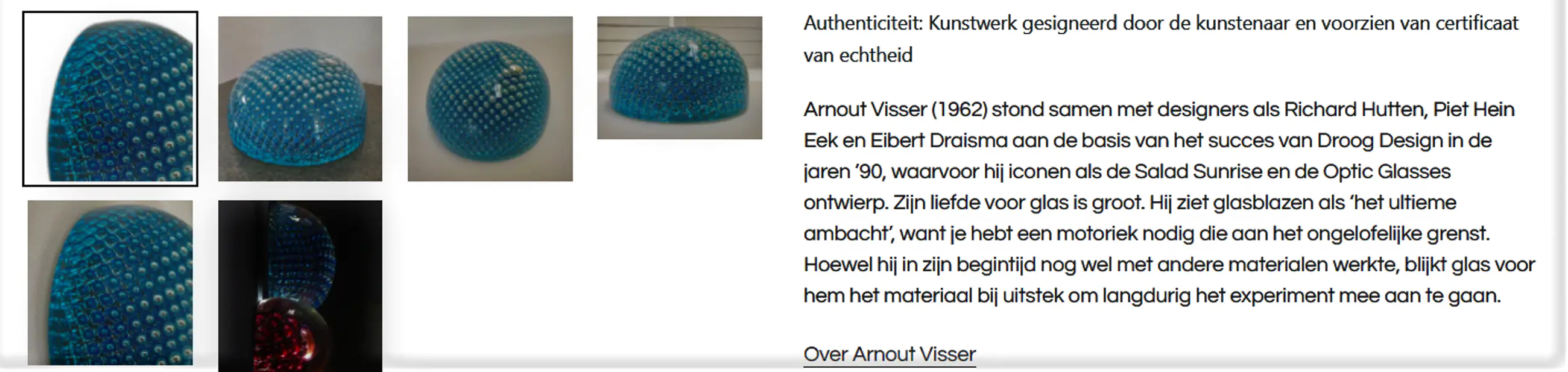 Glaskunstbeurs jaarobject 2012 , ontwerp Arnout Visser, uitvoering Marek Bartko Novy Bor. Oplage 250 stuks. Ieder object is gesigneerd en genummerd en komt in de originele verpakking met certificaat en catalogus van de beurs.