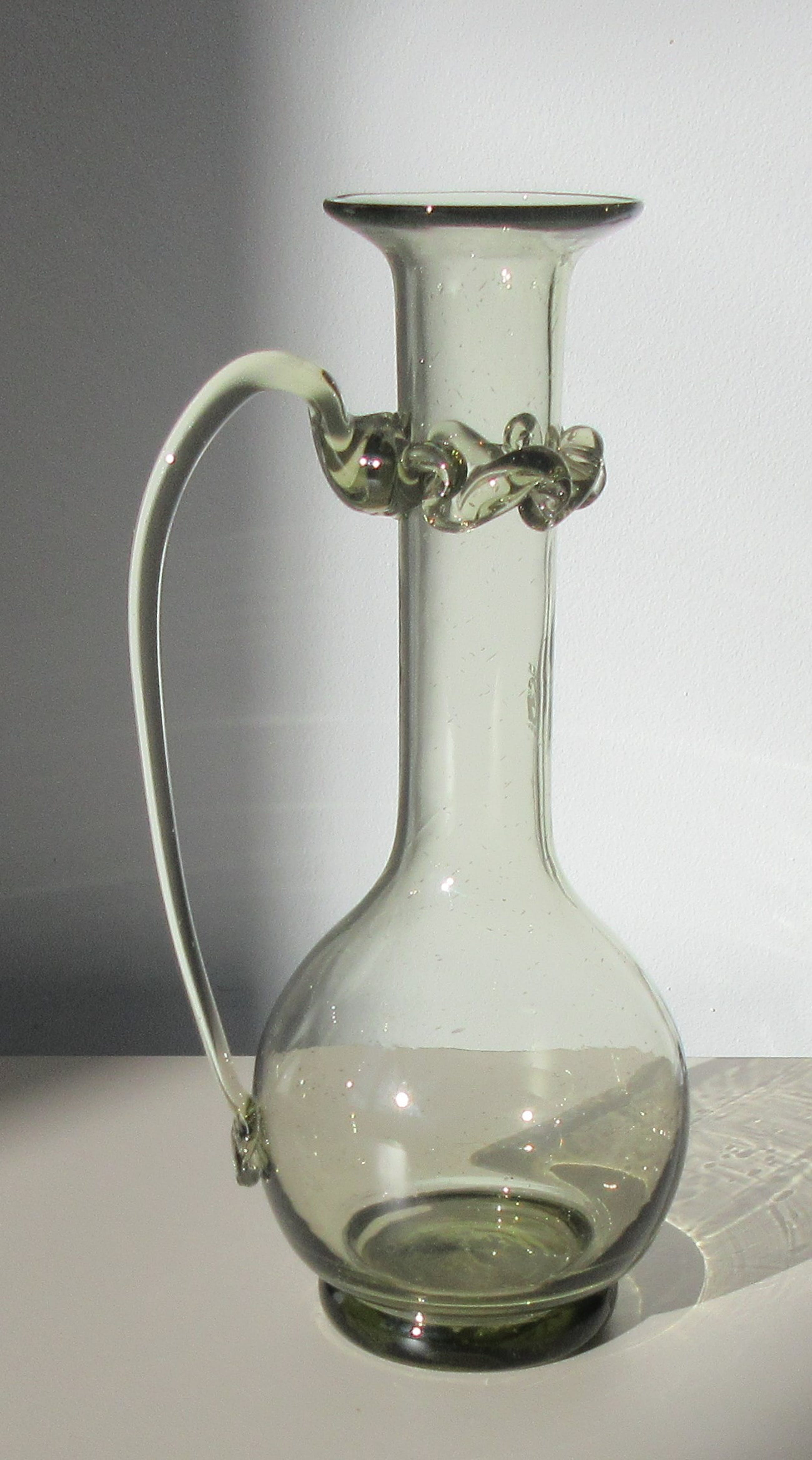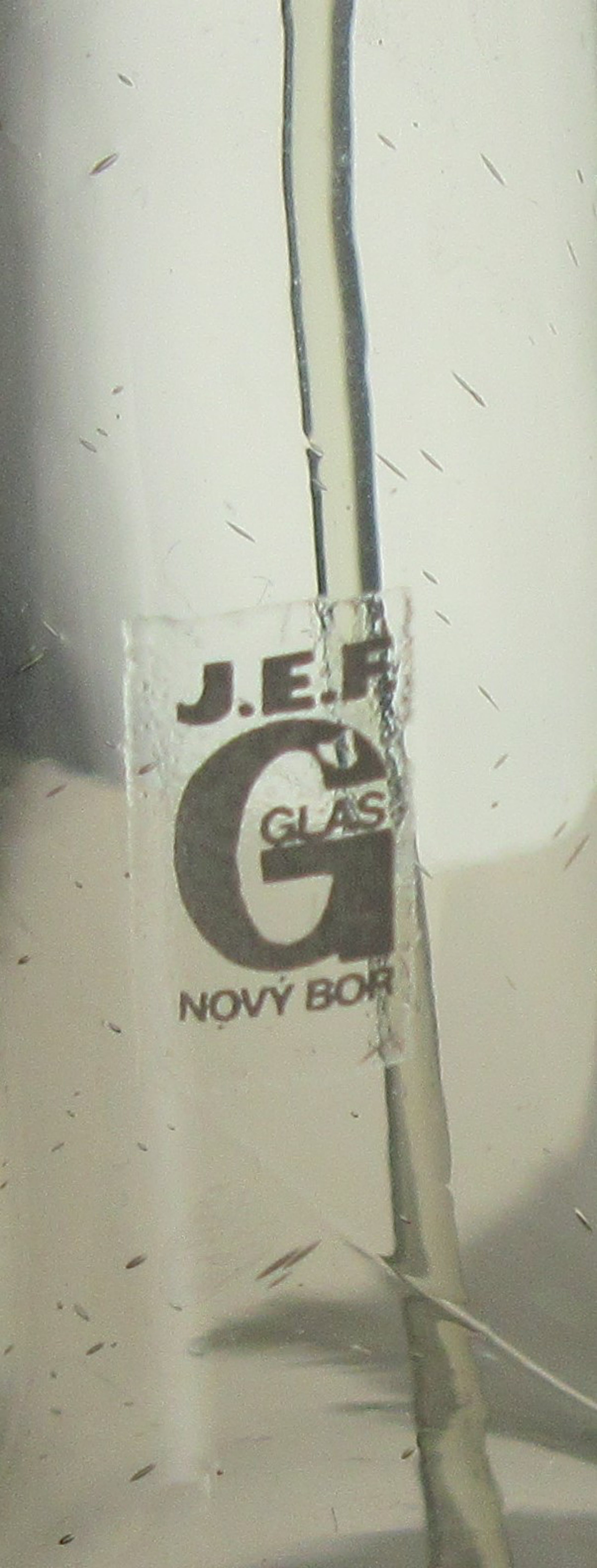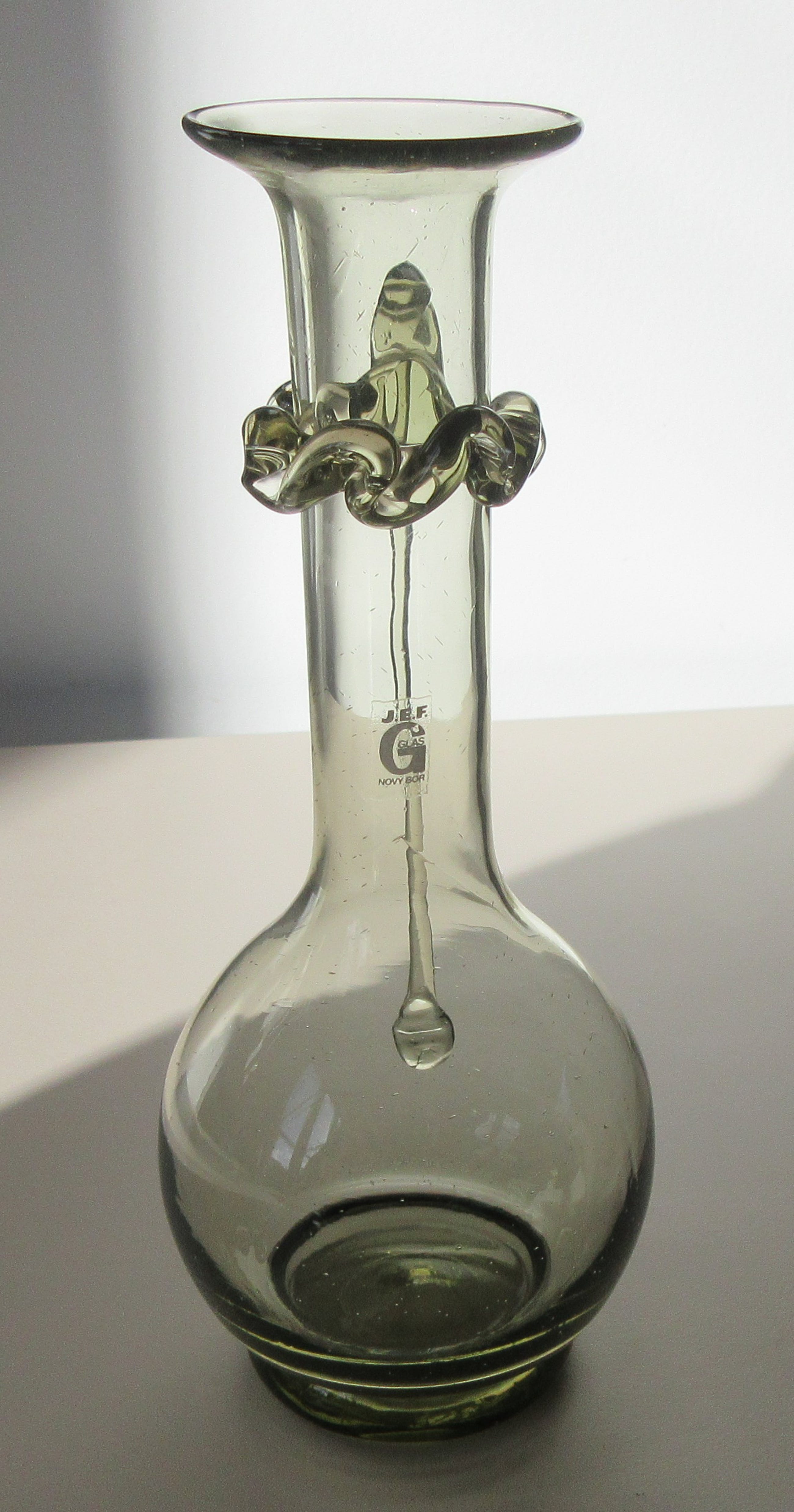 Berkemeyer Stijl hand geblazen glazen karafje - Josef & Eva Flek (J.E.F. Glas) uit Novy Bor Tsjechie. Josef en Eva Flek maken zeer goede replica's van antieke glas modellen. Dit karafje is van zeer dun hand geblzen glas en heeft een licht mosgroene kleur, voorzien van een niet gepolijst pontil merk aan de onderzijde en voorzien van merksticker.