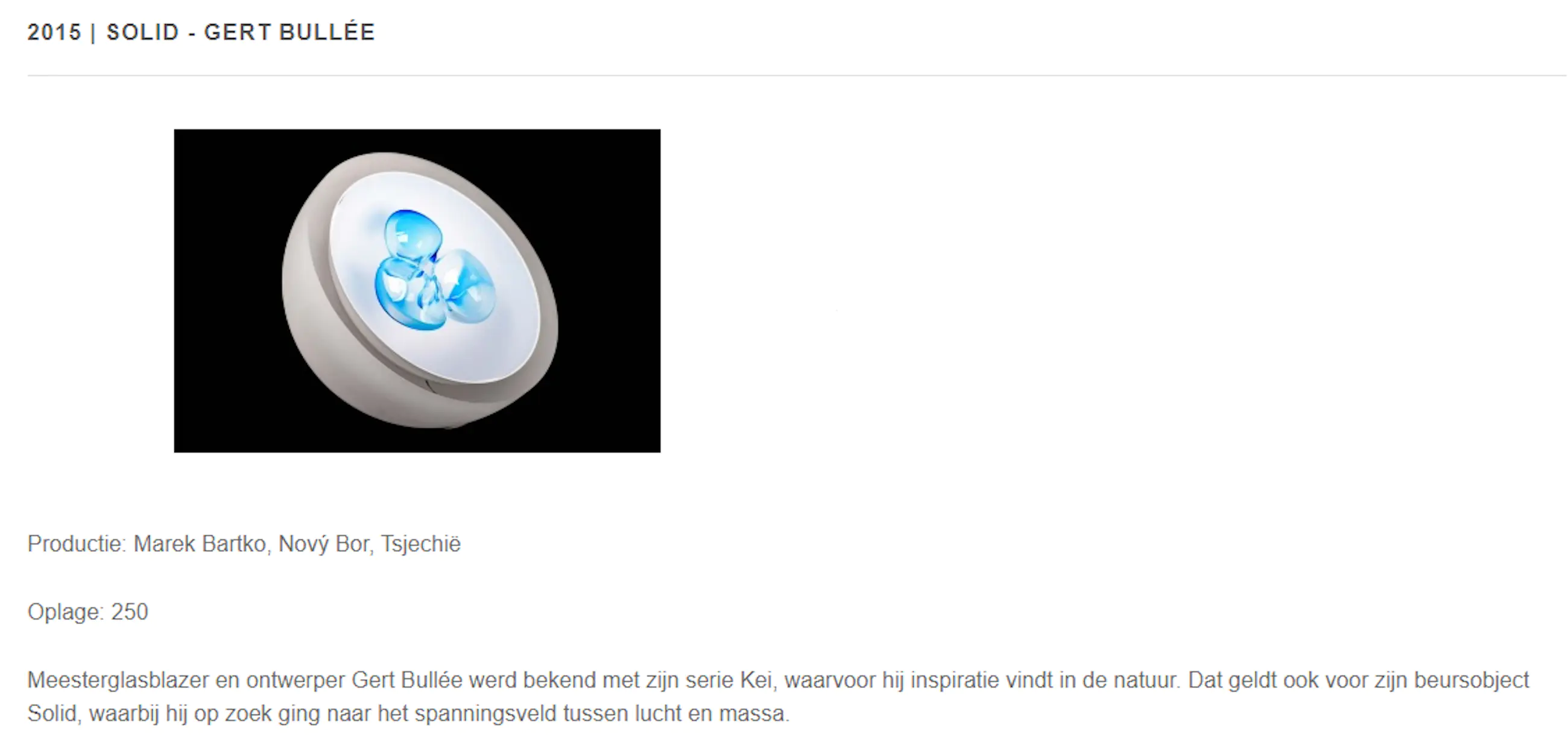 Glaskunstbeurs jaarobject uit 2015, oplage 250 stuks, gemaakt in Novy Bor door Marek Bartko. Ontwerp meesterglasblazer Gert Bullée. Ieder object is gesigneerd en genummerd en komt in de originele verpakking met certificaat en catalogus van de beurs.
