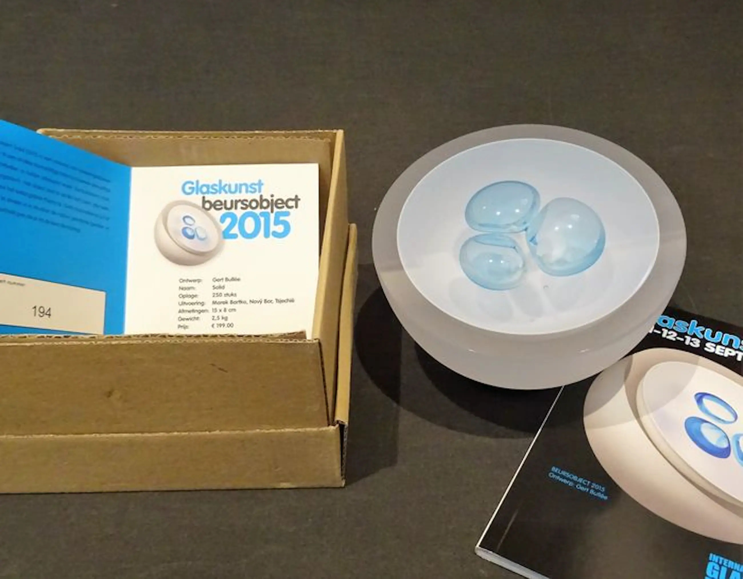 Glaskunstbeurs jaarobject 2015. Ontwerp Gert Bullée, uitvoering Marek Bartko Novy Bor. Titel "Solid". Oplage 250 stuks. Wordt geleverd met certificaat, originele verpakking en catalogus van de beurs.