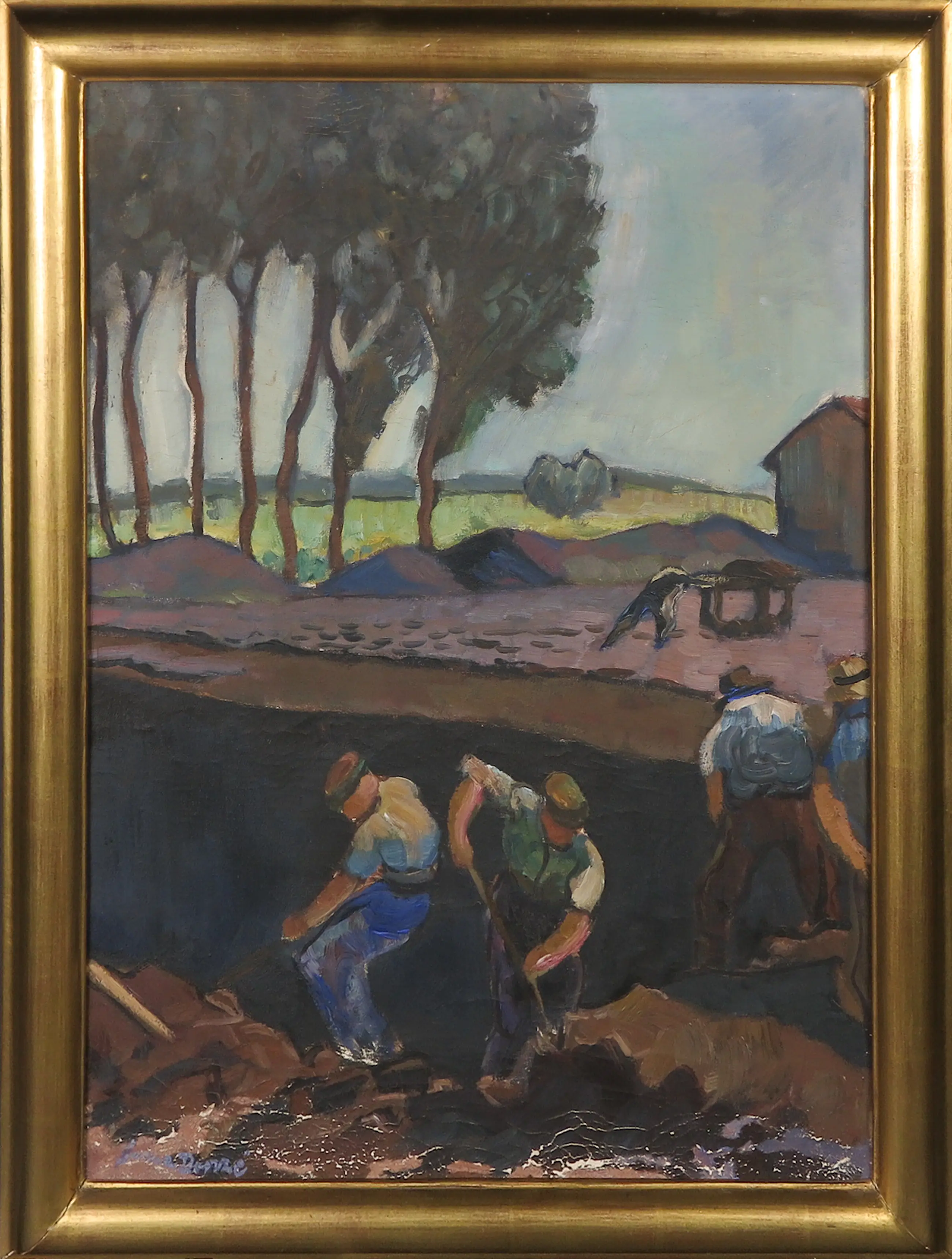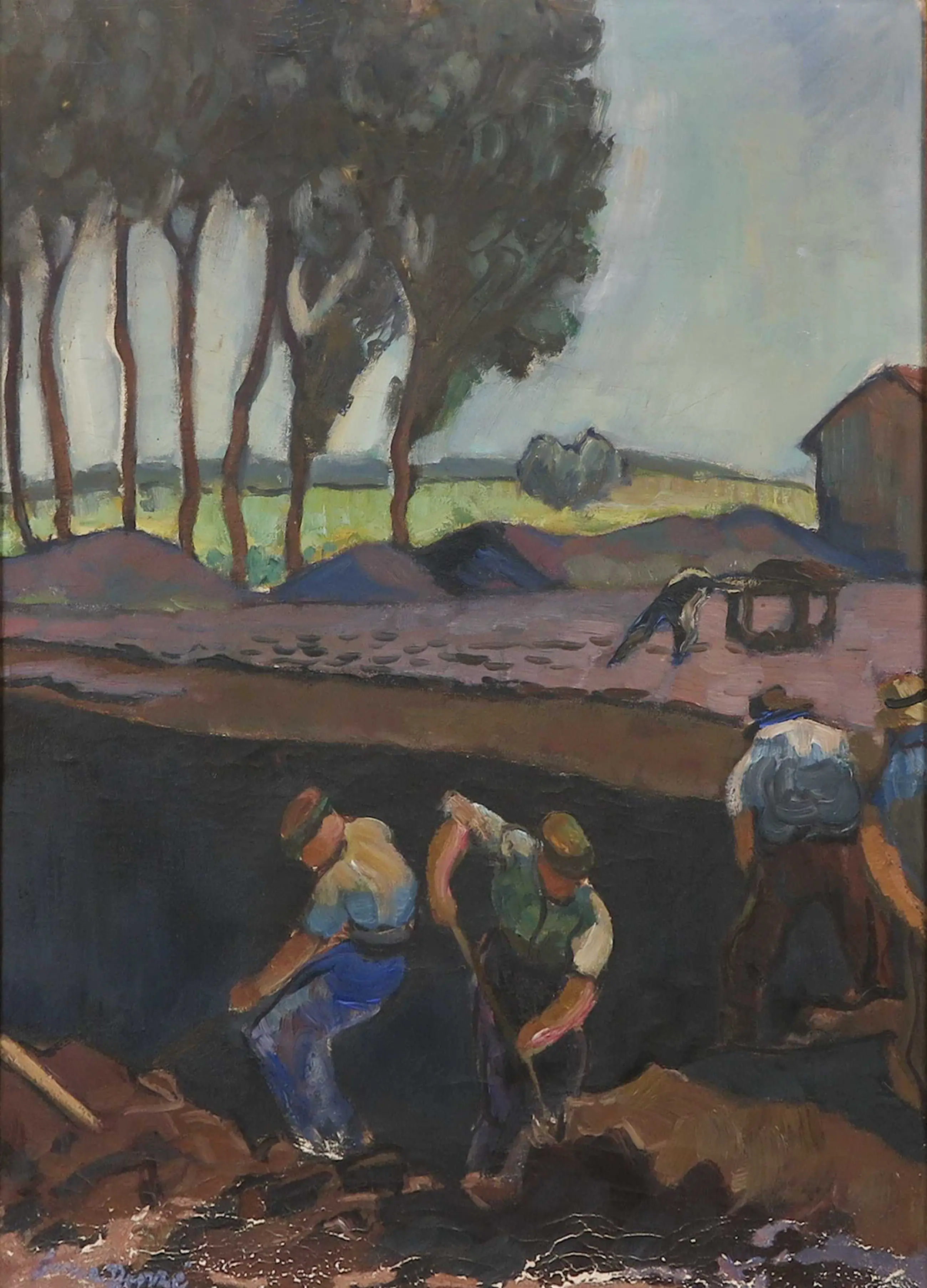 Voorstelling met arbeiders in fraaie kleurstelling, door de Zwitserse schilder Numa Donzé. Het etiket op versozijde vermeld dat dit werk in het bezit is geweest van Dr. Paul Roth, de stadsarchivaris in Basel.