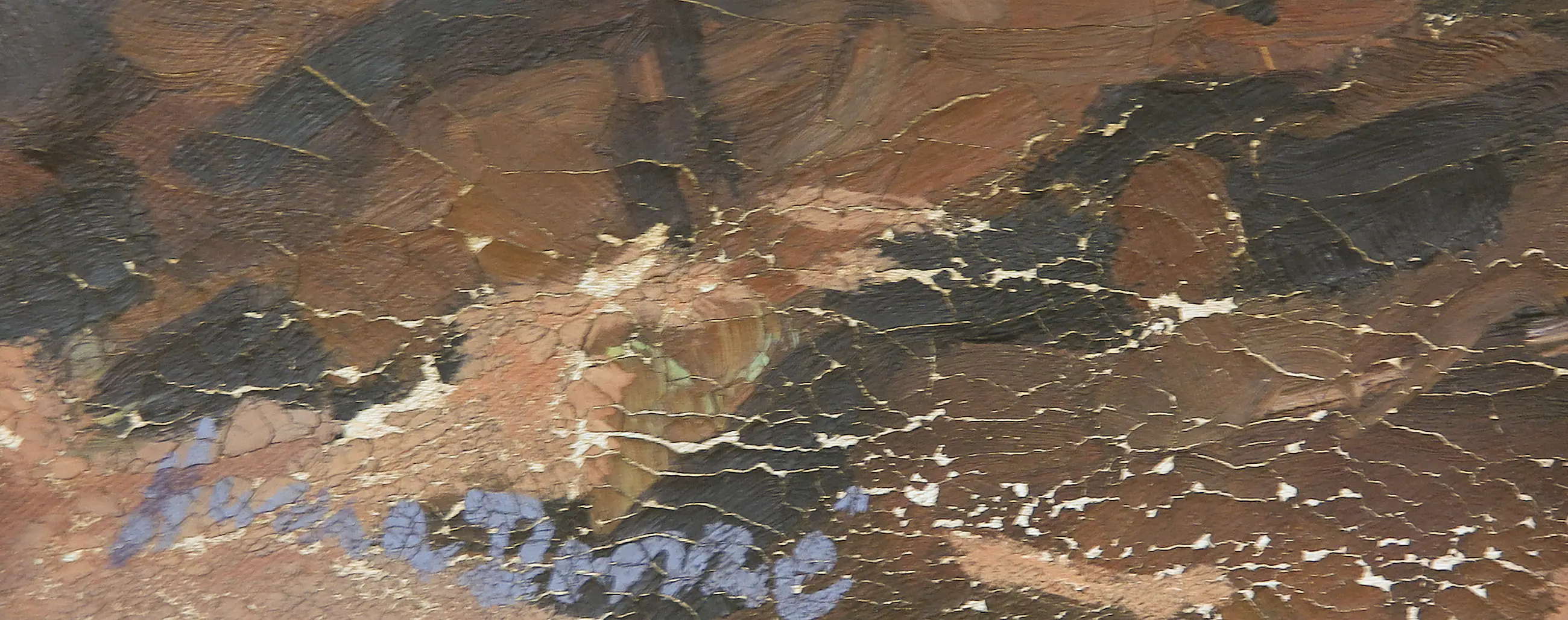 Het werk heeft over de gehele voorstelling craquelé, met name aan de onderzijde van de compositie. Op deze plek is daardoor ook wat verfverlies te zien. Het werk dient gerestaureerd te worden. (Zie detailfoto's)
