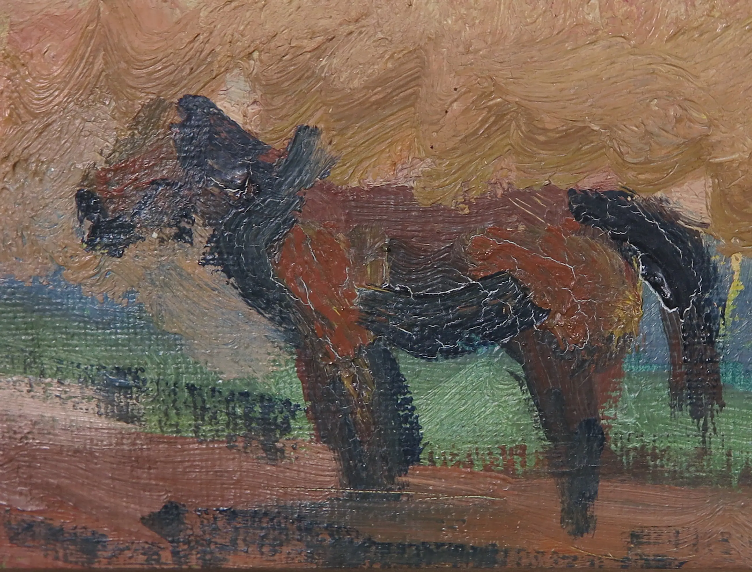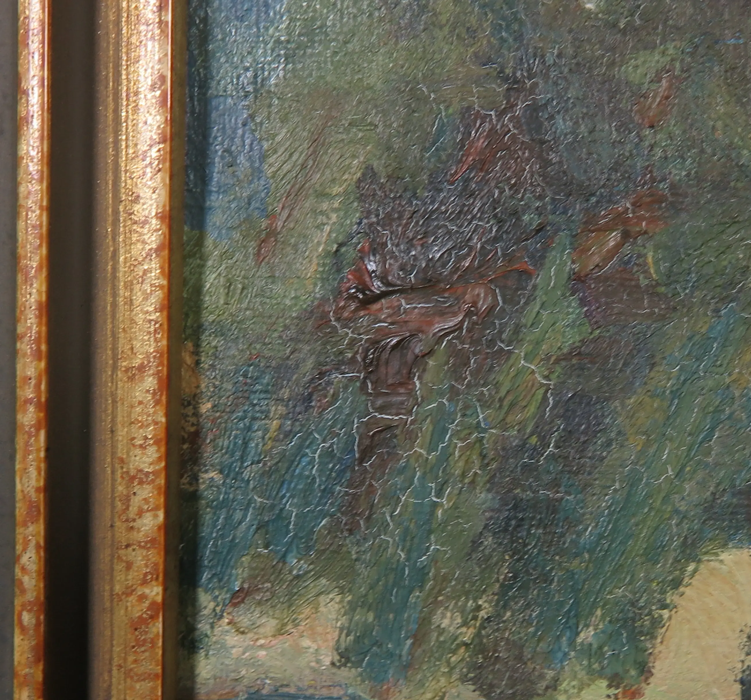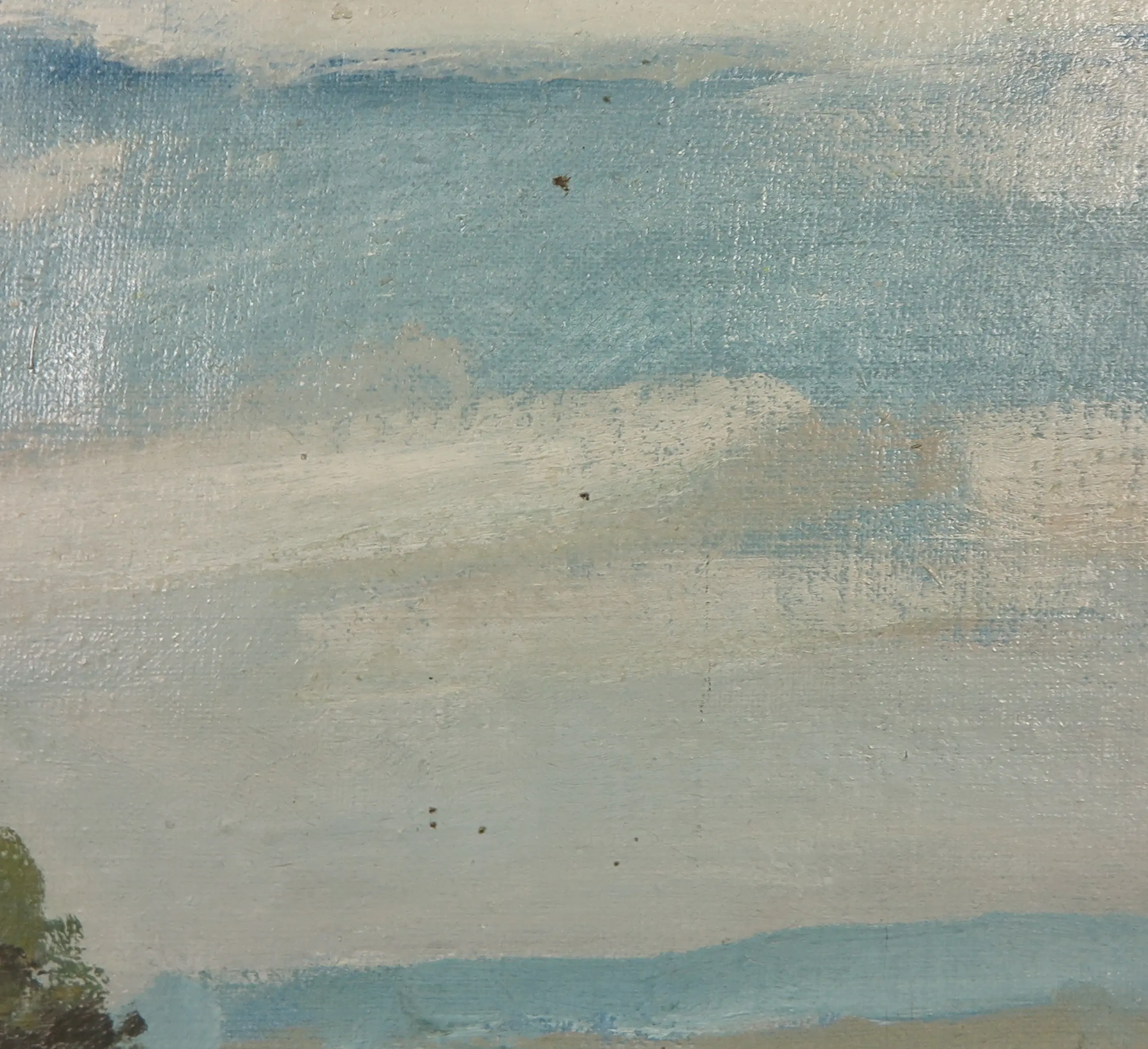 Op enkele plekken is er wat craquelé te zien, met name in en rondom de boompartij. Daarnaast zijn er enkele vlekjes in de luchtpartij te zien. Zie hiervoor de detailfoto's.