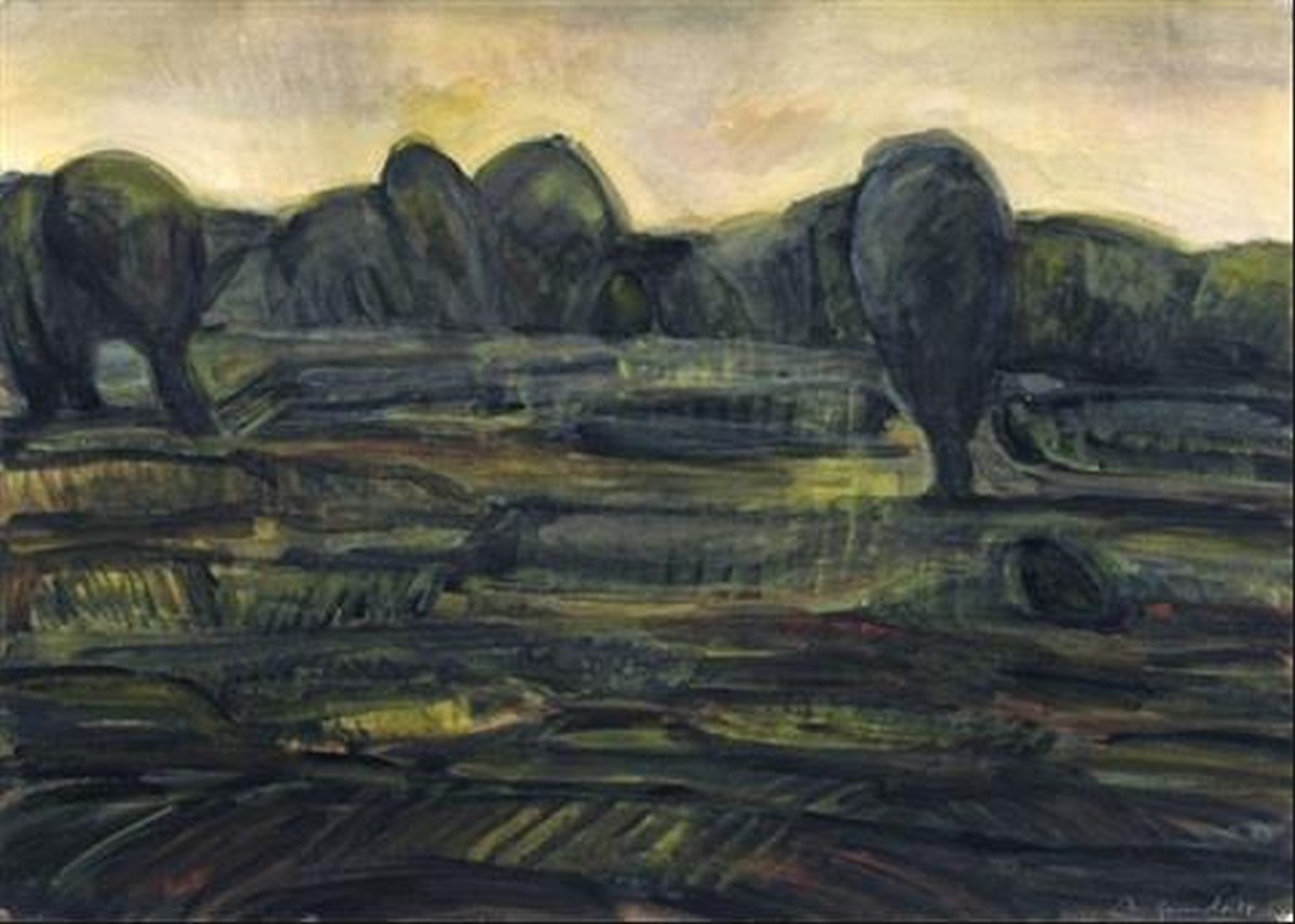 Nuria Quevedo Teixidó "Mecklenburgische Landschaft". 1984. Aquarell auf festem Bütten. Signiert in Blei "N. Quevedo" und datiert u.re. Großformatige Landschaftsdarstellung in Grün- und Brauntönen. Technikbedingte glänzende Ränder an bestimmten Farbbereichen. Etwas knickspurig. Reißzwecklöchlein an den Ecken. 56,6 x 78,5 cm. Auktion unter Ausschluß jeglicher Gewährleistung, Garantie sowie Rücknahme. Versand innerhalb Deutschlands: 10 Euro