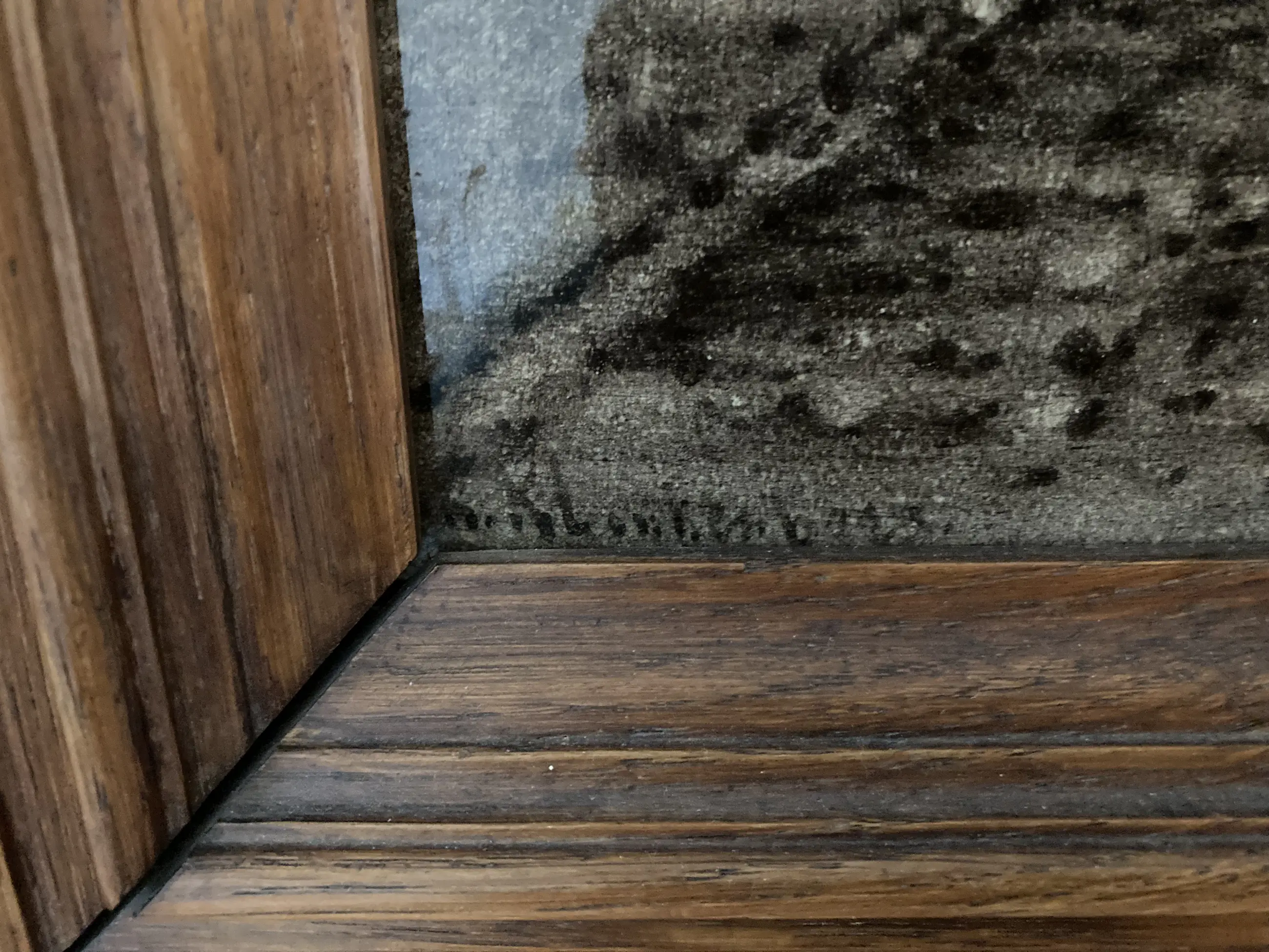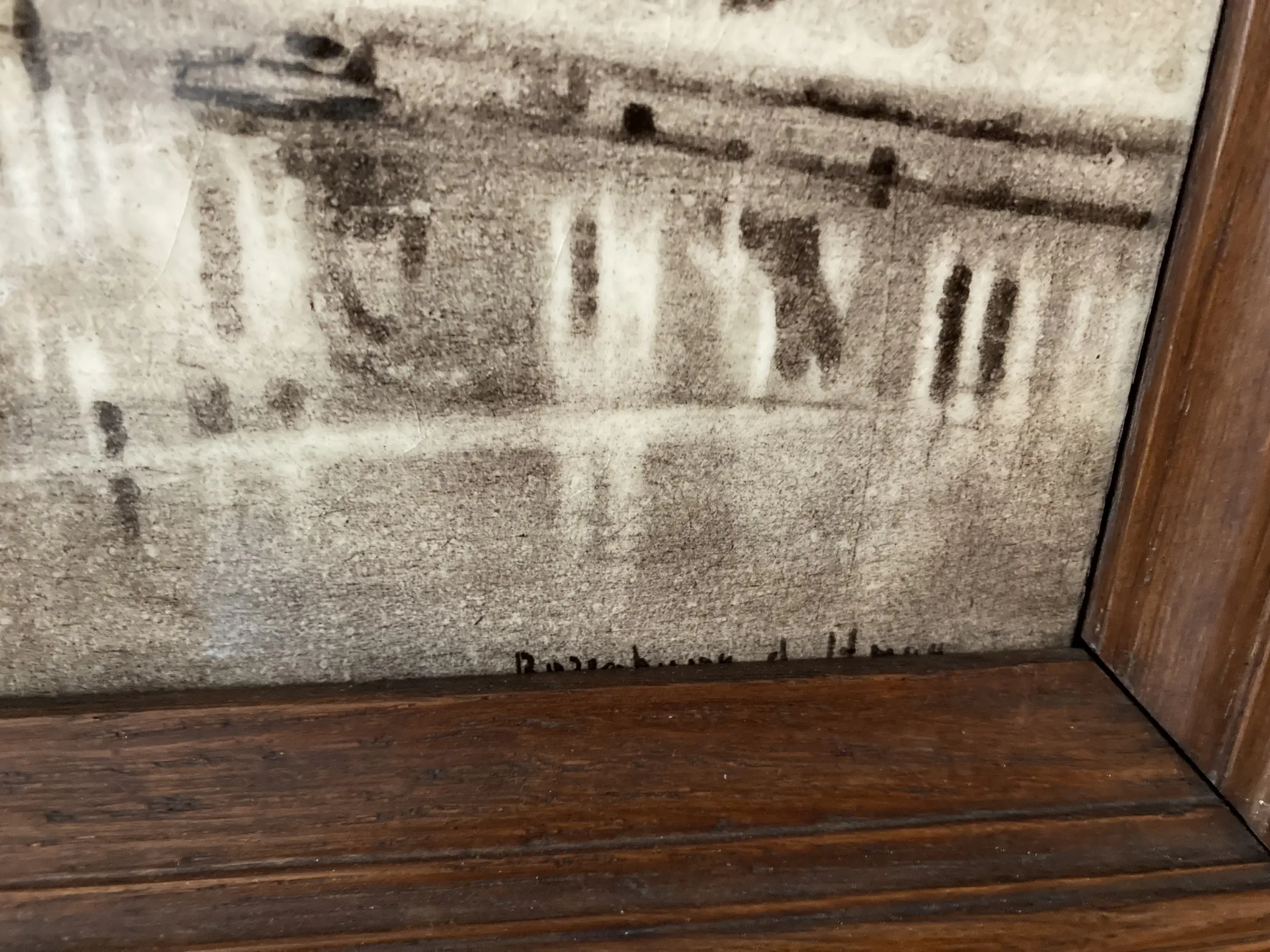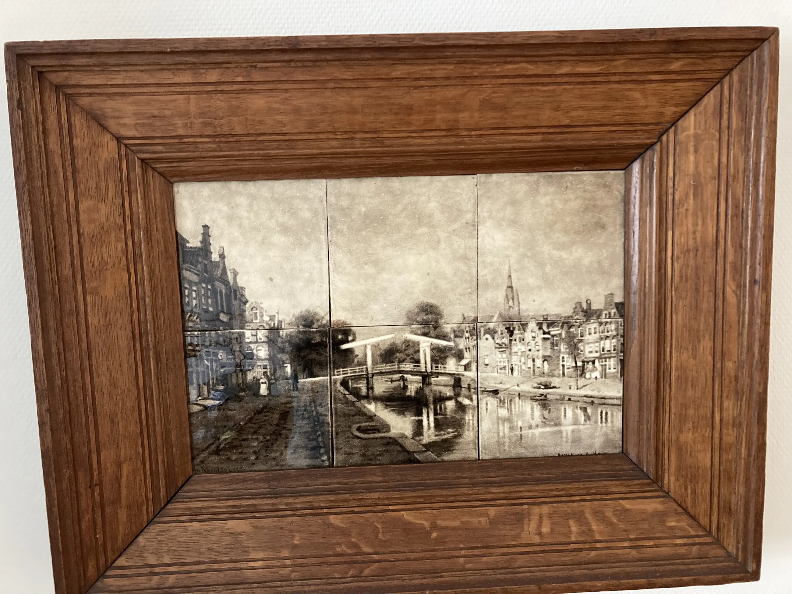 Origineel Tegeltableau van Rozenburg, periode 1890-1899. Vermoedelijk stadsaanzicht van een kade in Den Haag met op de achtergrond de toren van het Vredespaleis? Zes tegels van 16x16 cm in massief eikenhouten lijst. In een tegel zit een bijna onzichtbare barst. Handgesigneerd.
