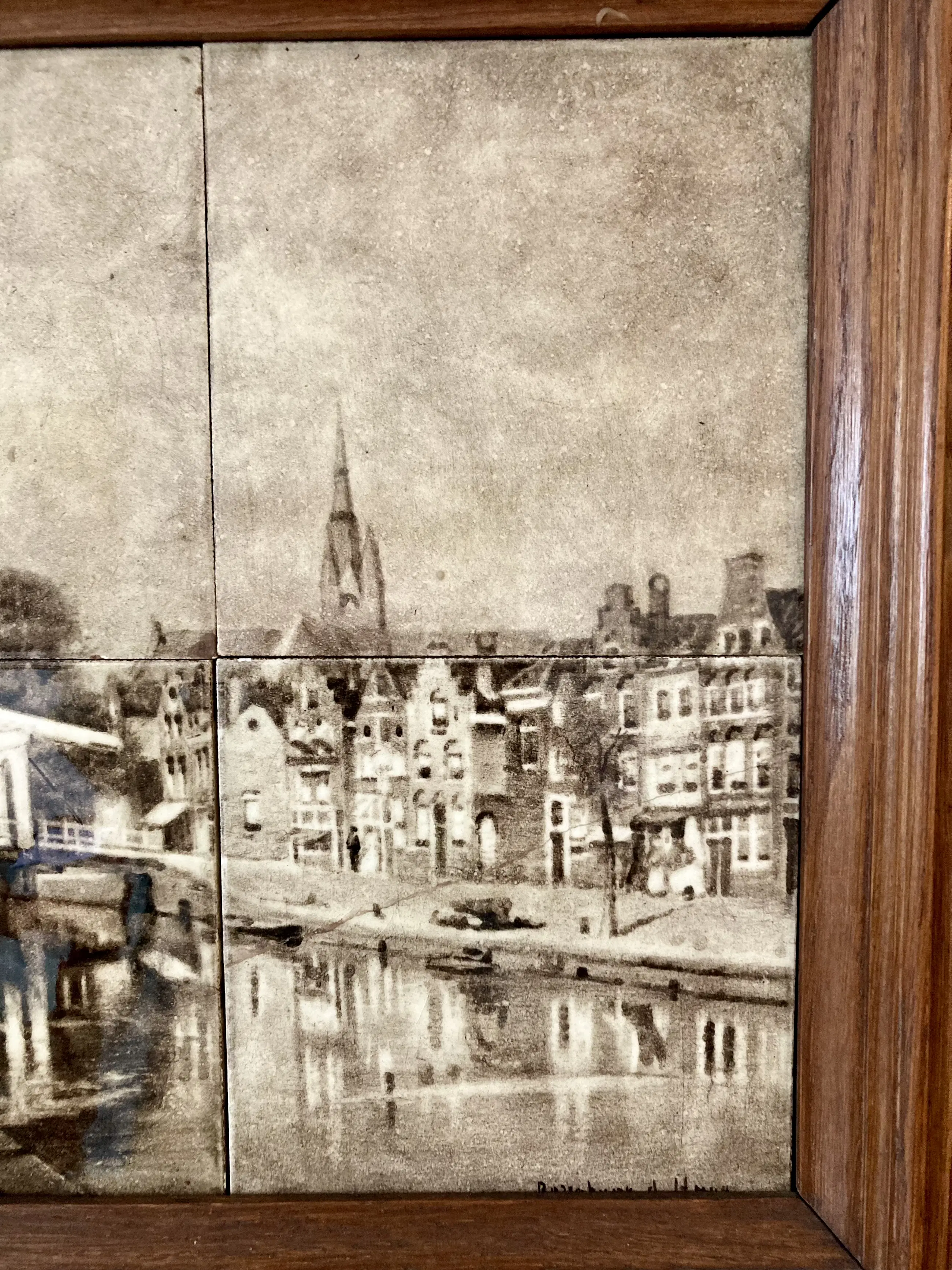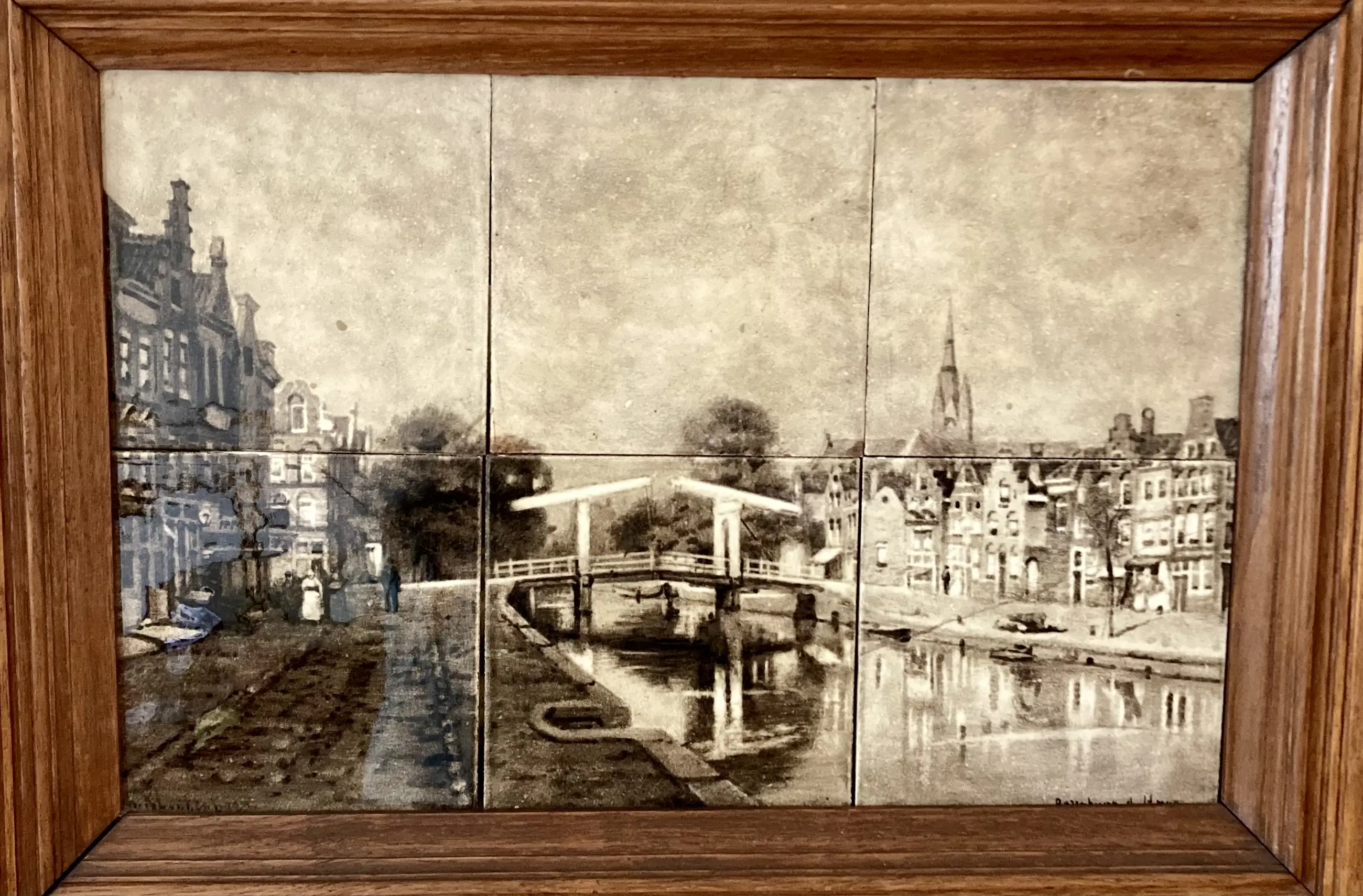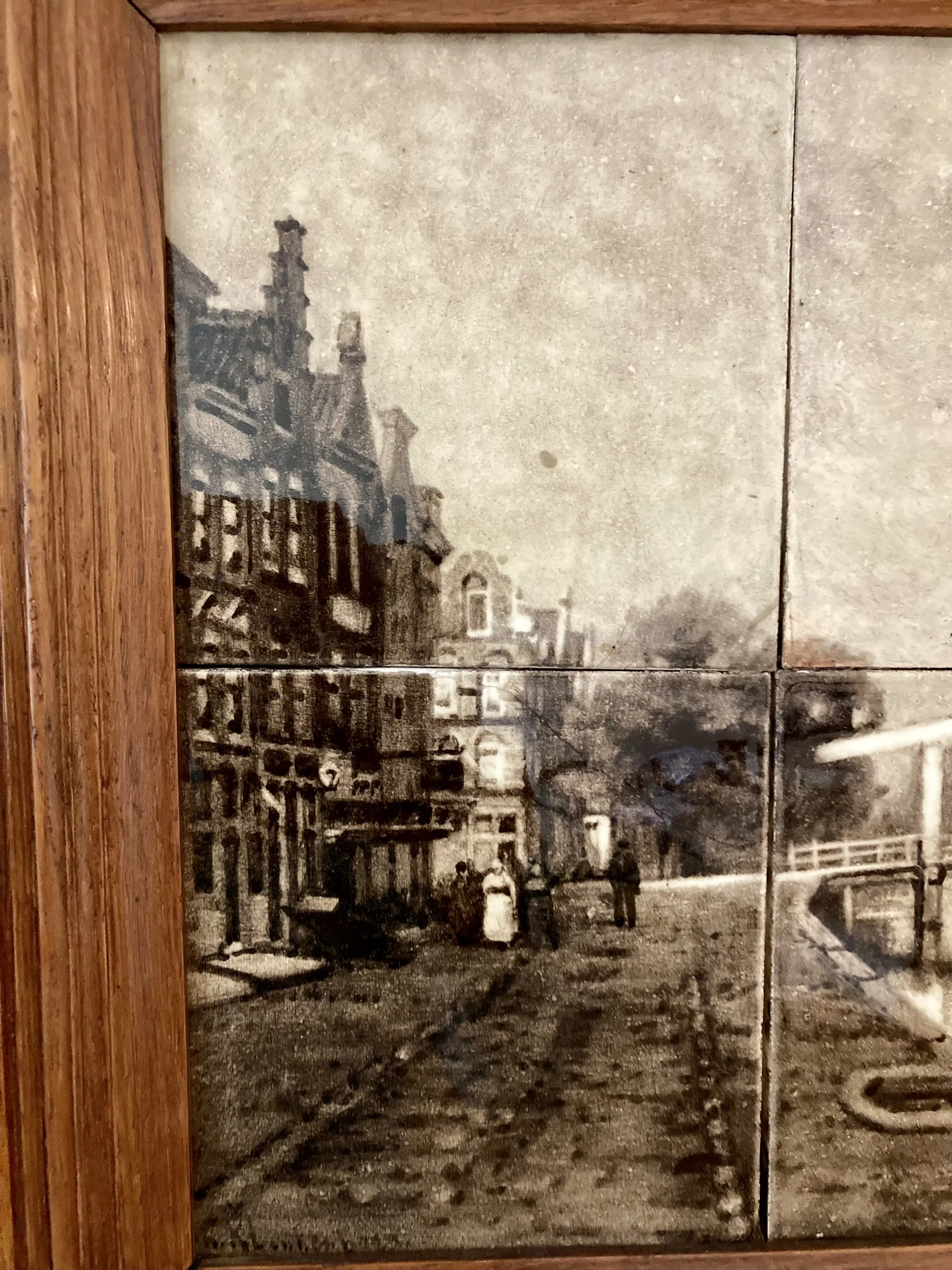 Tegeltableau van de Haagse Plateelfabriek Rozenburg, periode 1890-1899. Stadsgrachtensaanzicht naar schilderij van Klinkenberg. Zes tegels van 16x16 cm in massief eikenhouten lijst. In een tegel zit een bijna onzichtbare barst. Handgesigneerd.