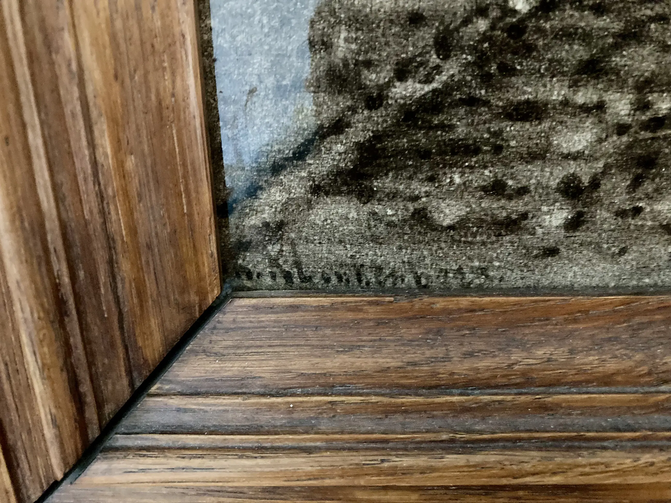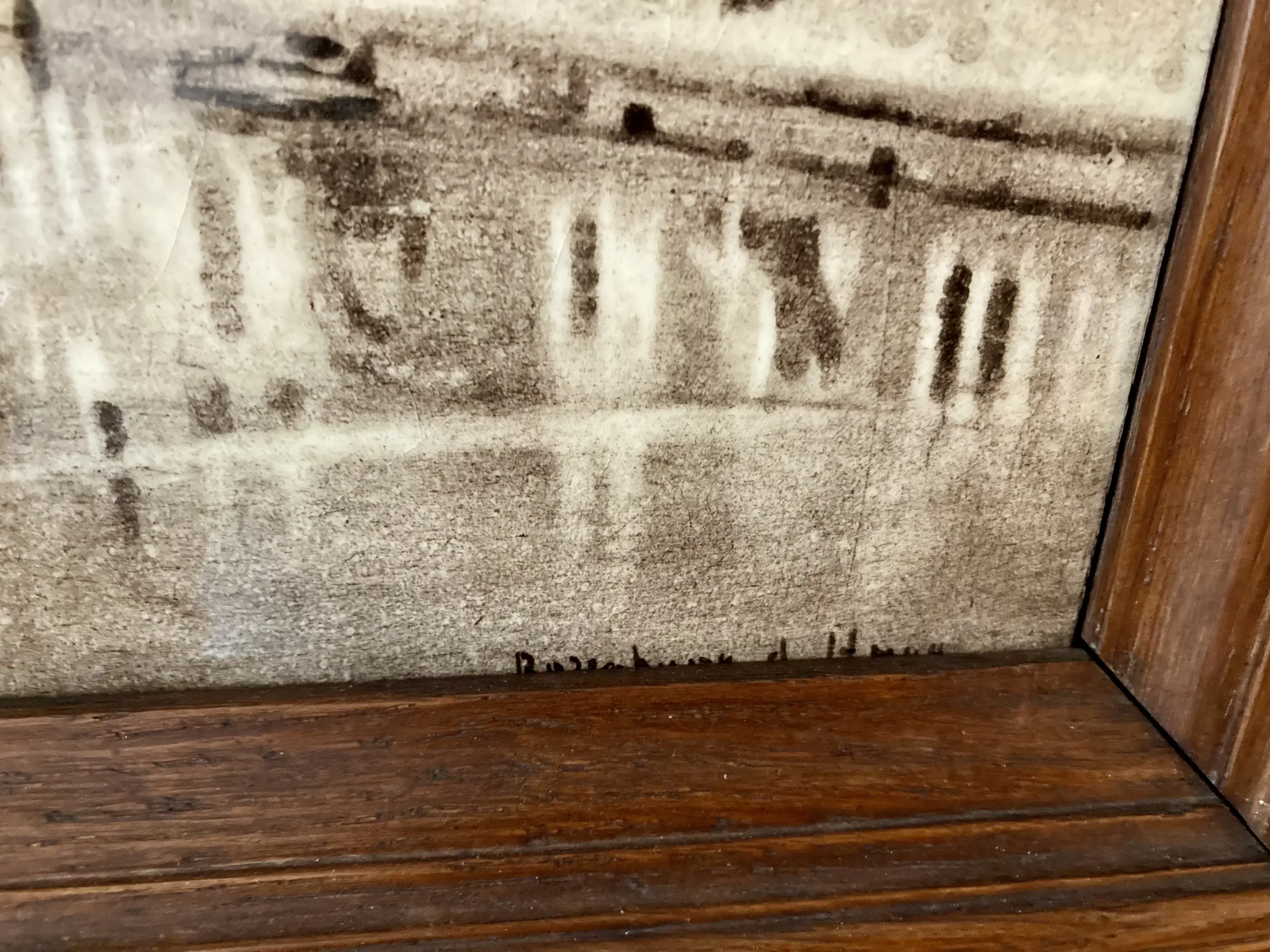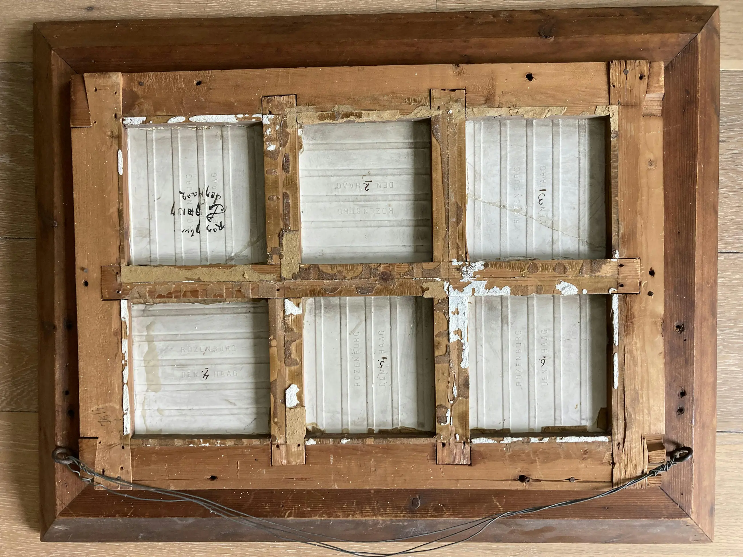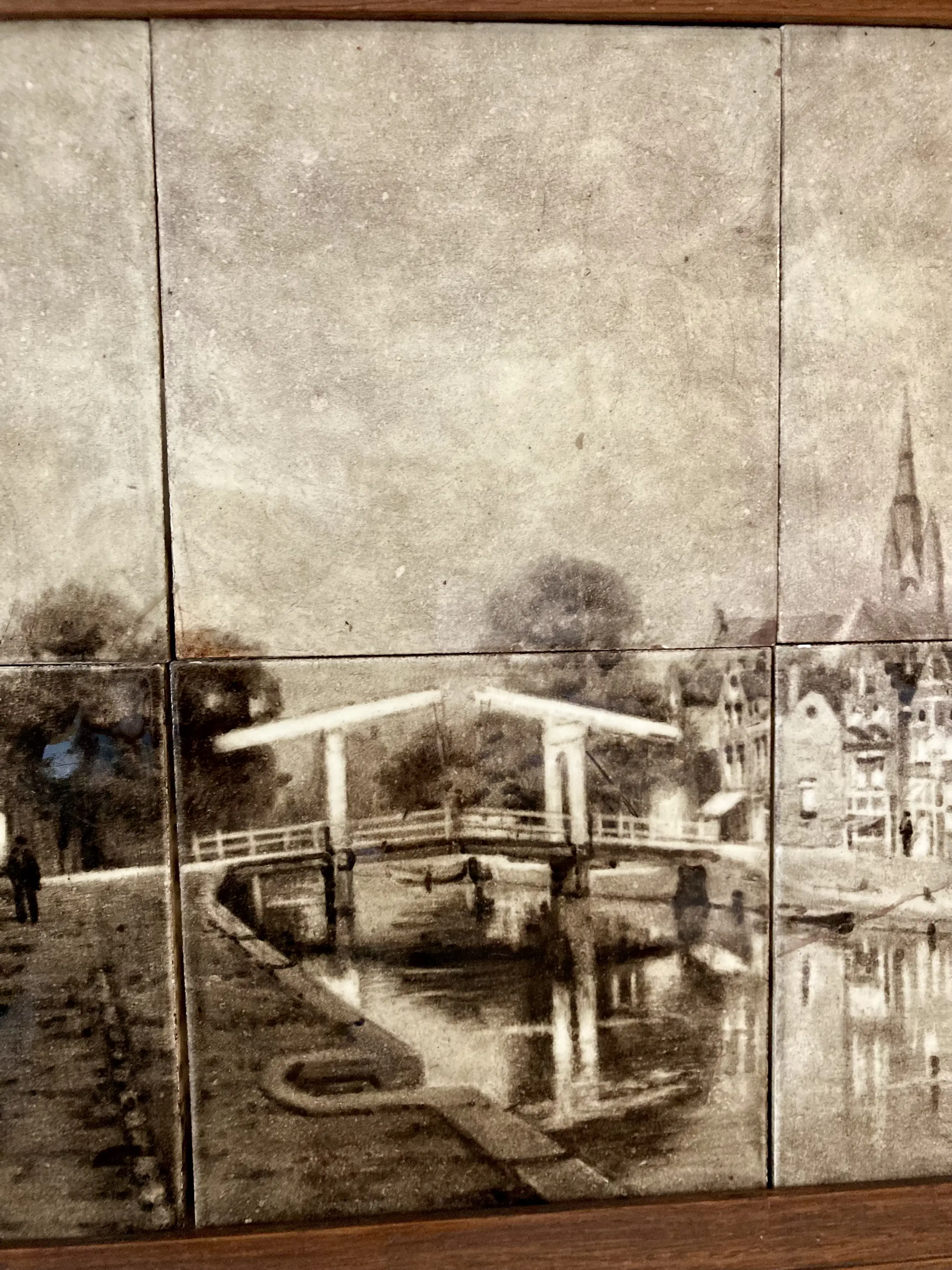 Tegeltableau van de Haagse Plateelfabriek Rozenburg, periode 1890-1899. Stadsgrachtensaanzicht naar schilderij van Klinkenberg. Zes tegels van 16x16 cm in massief eikenhouten lijst. In een tegel zit een bijna onzichtbare barst. Handgesigneerd.
