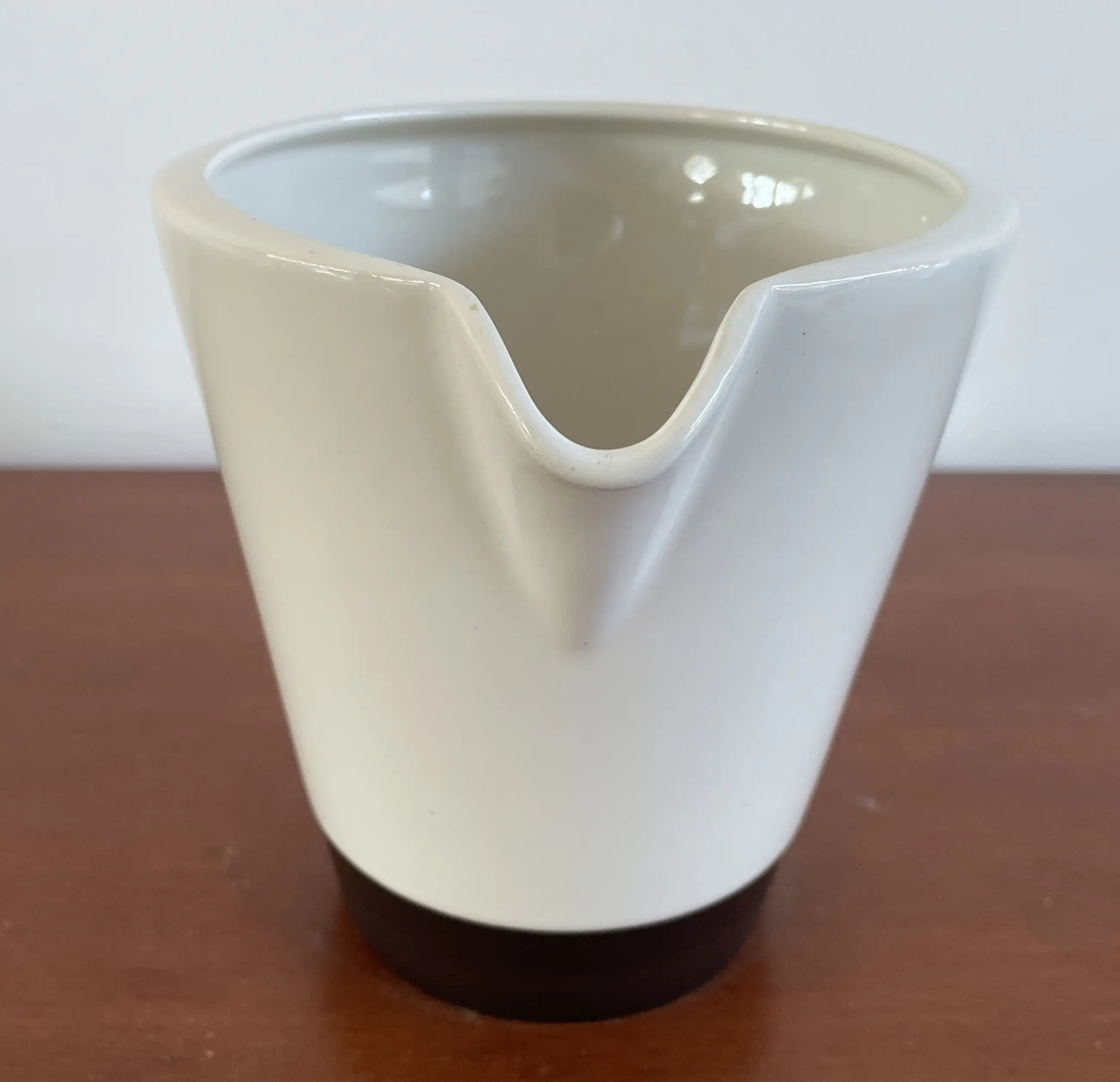 Ivoor witte aardewerken (melk)kan met bruine onderrand servies Jubilant ontwerp W.H. De Vries in 1958 voor Fris Edam. In zeer goede conditie. Geen beschadigingen. Gemerkt aan de onderkant; “Niet Foutloos”. De kan was dus 2e keus, ik kan echter geen fout vinden.