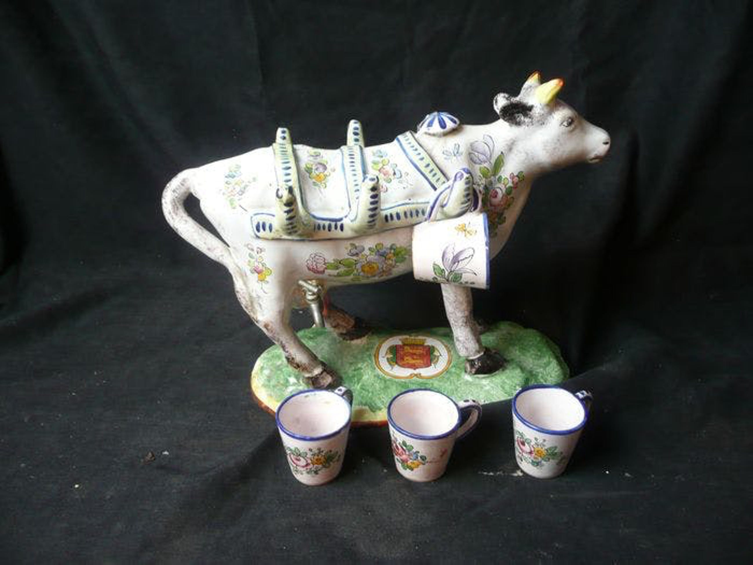 Faience - Beeld van een koe met een kraan en 4 schnaps kopjes. | |||||||