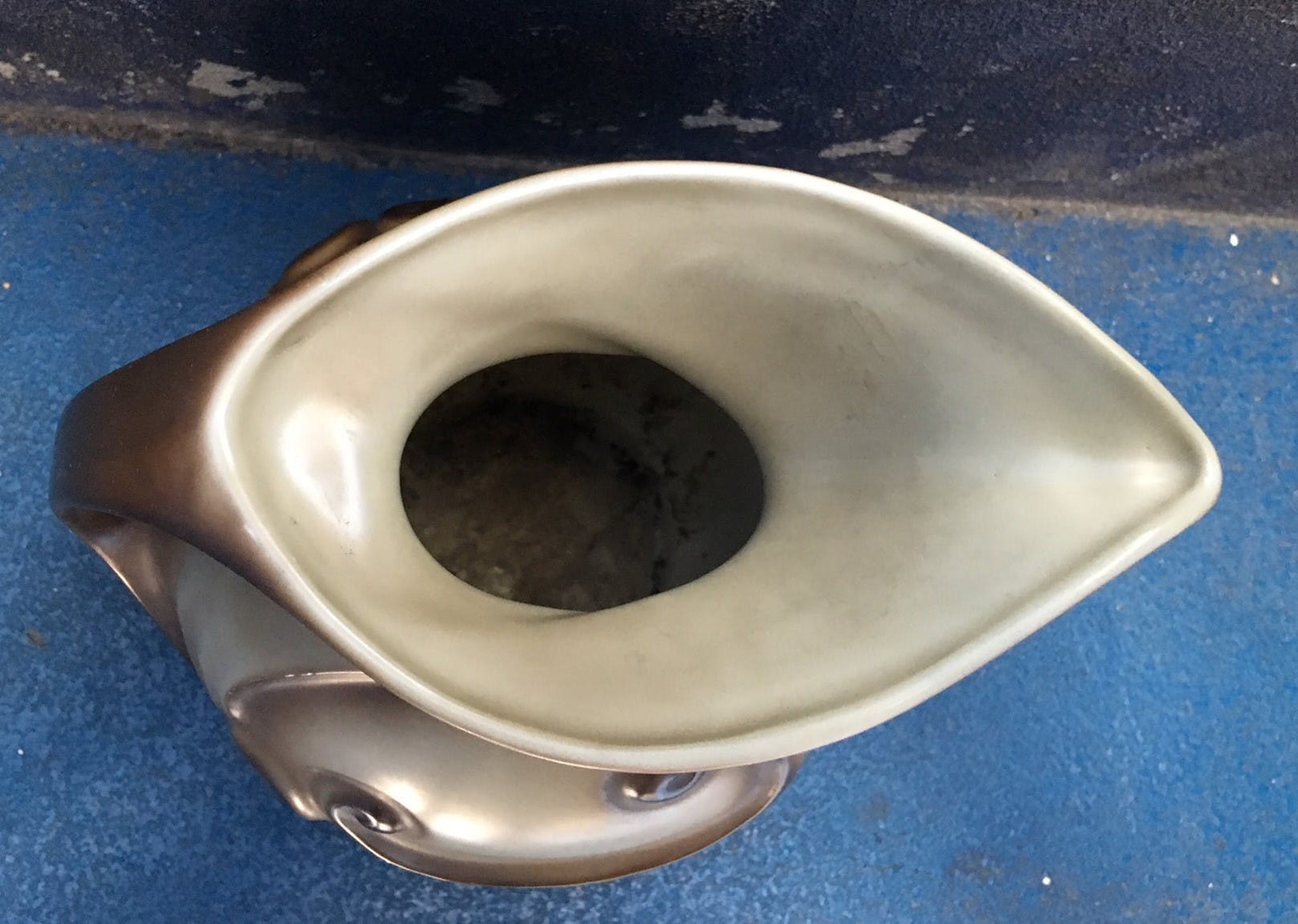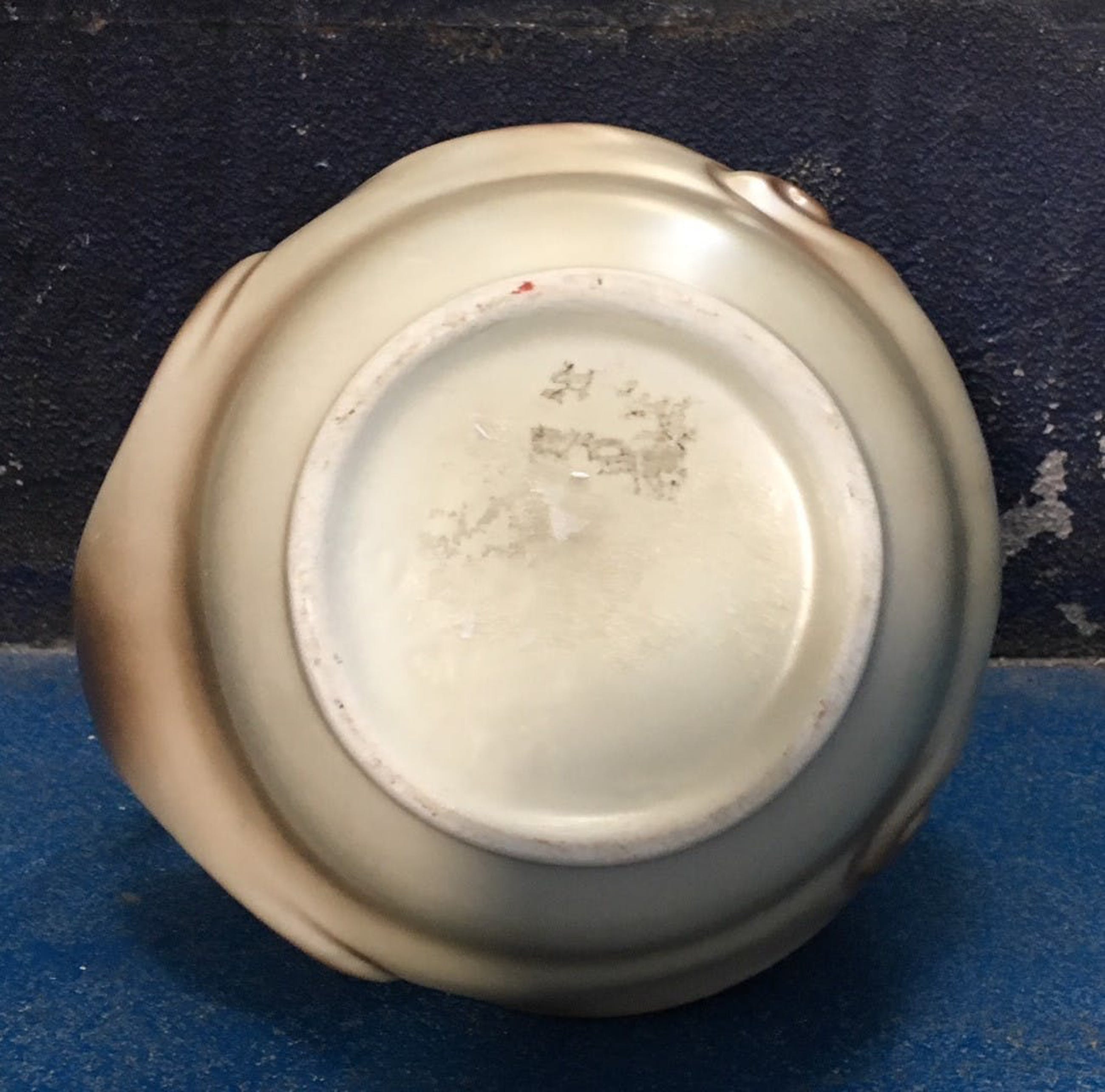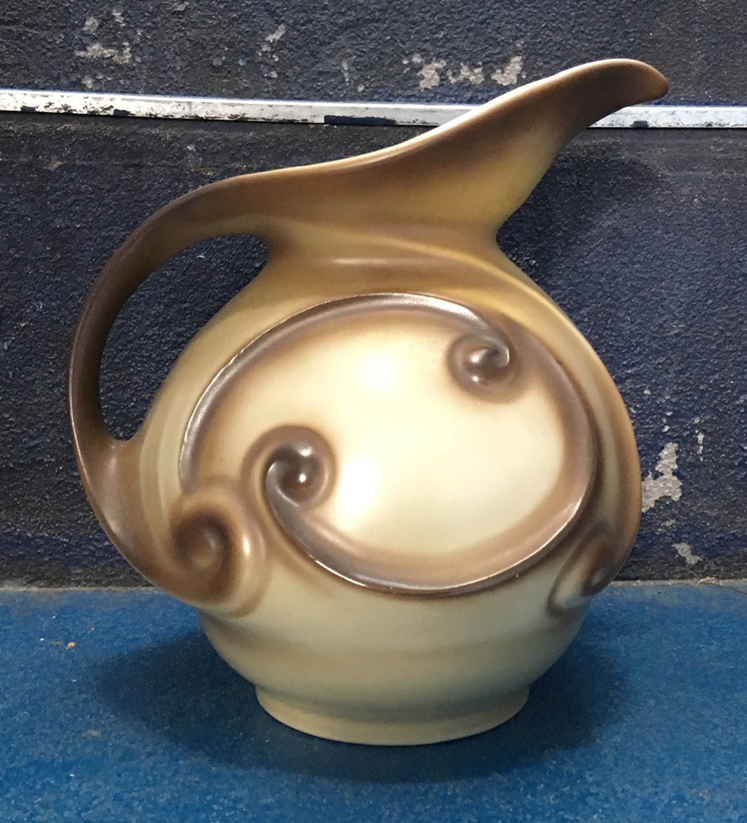 Mooie art deco porseleinen zgn. knijpkan voorzien van bruin en grijs spuitglazuur. Uitvoering Porselein en tegelfabriek Mosa uit Maastricht.