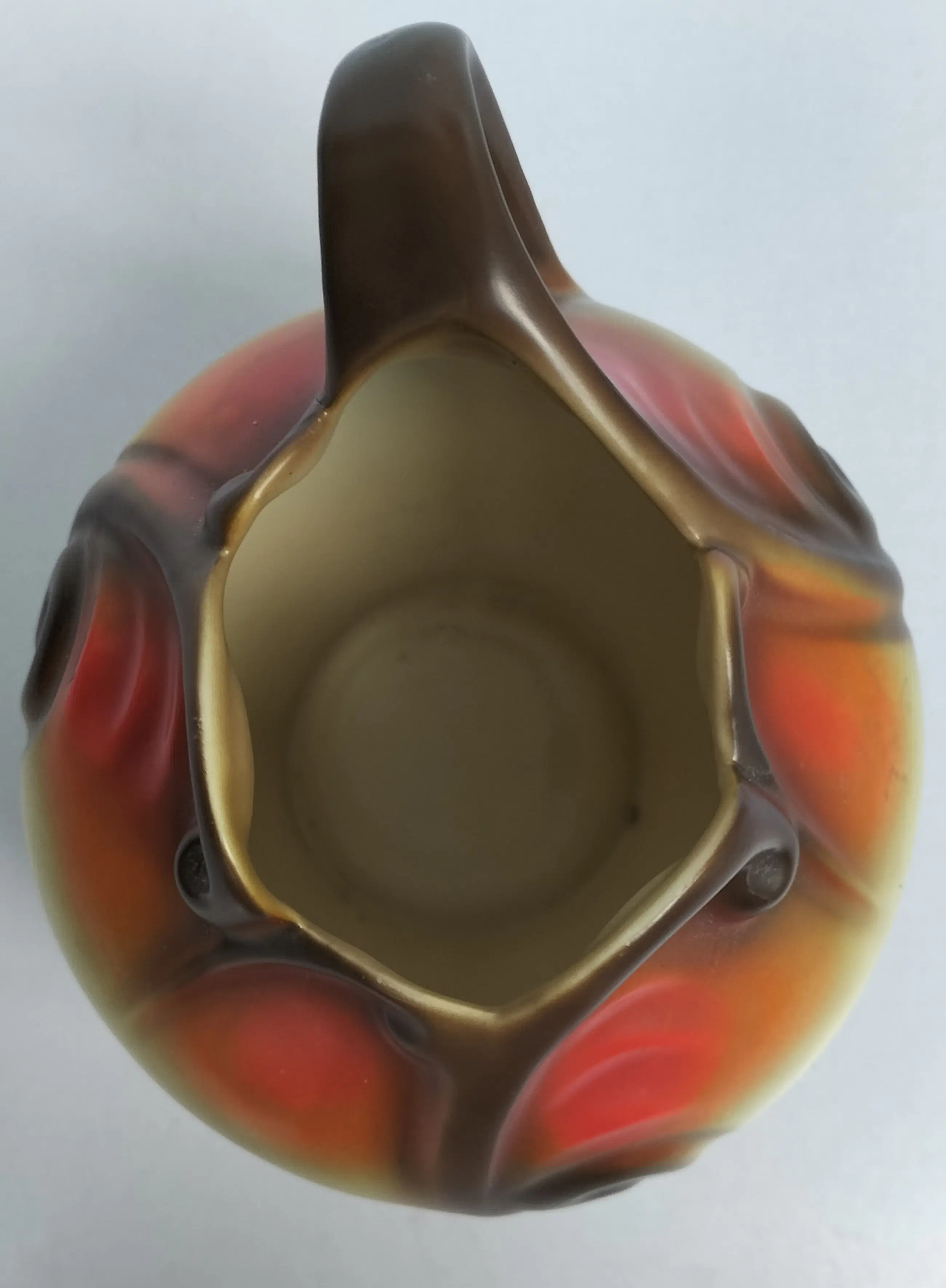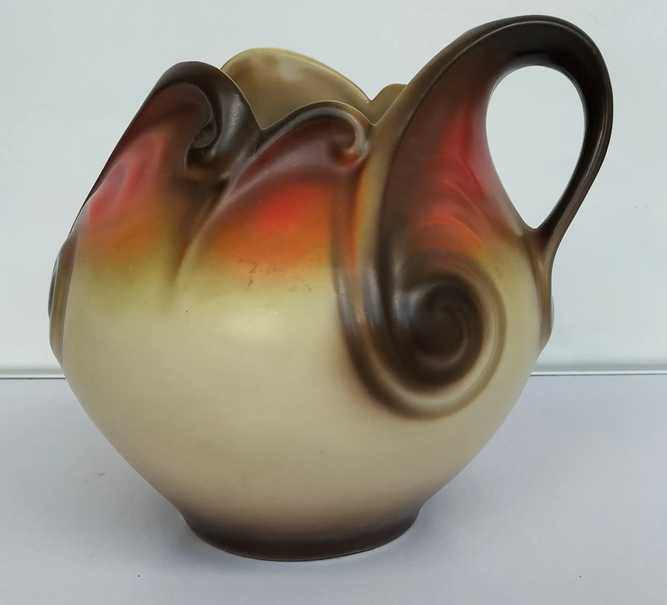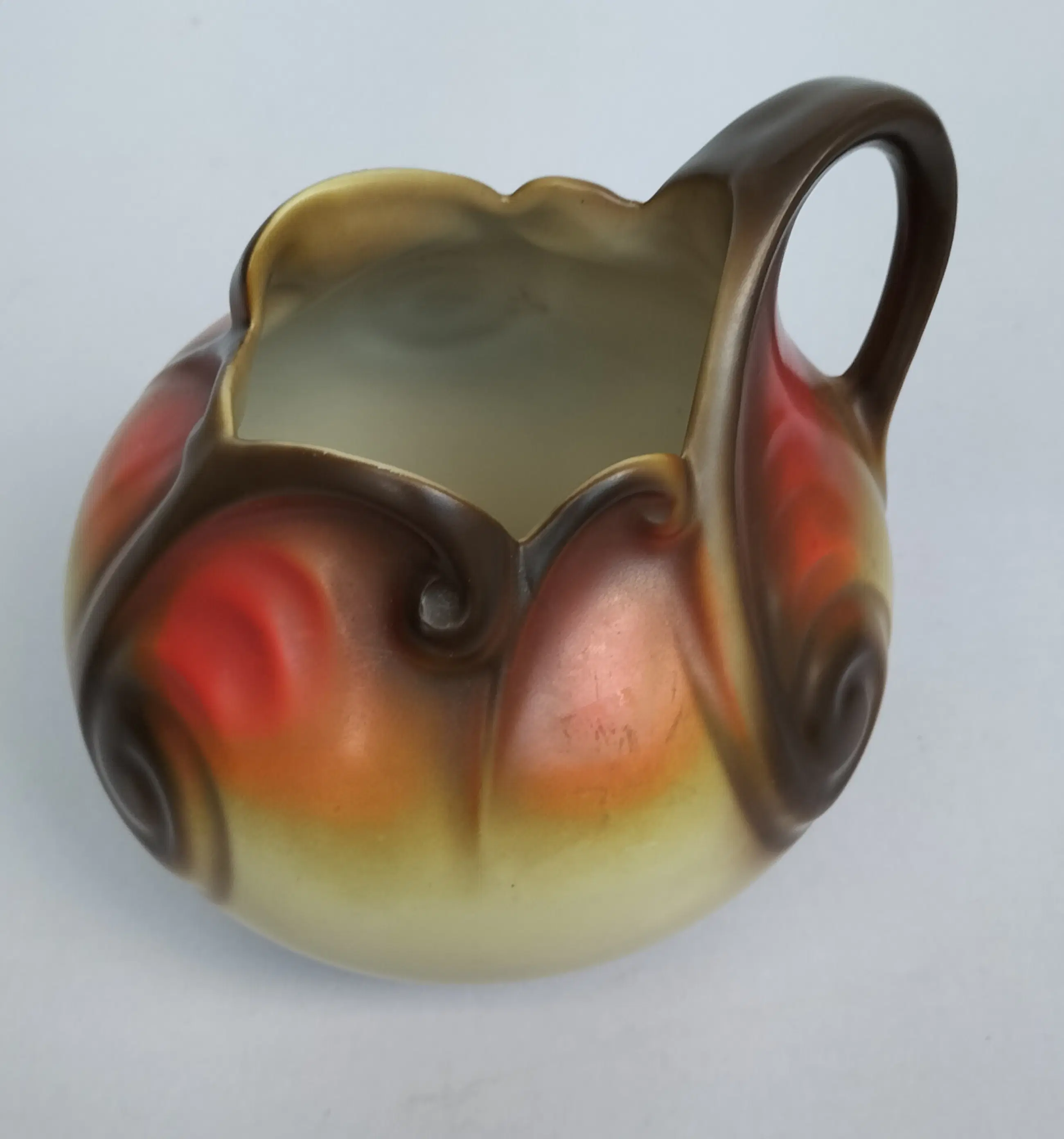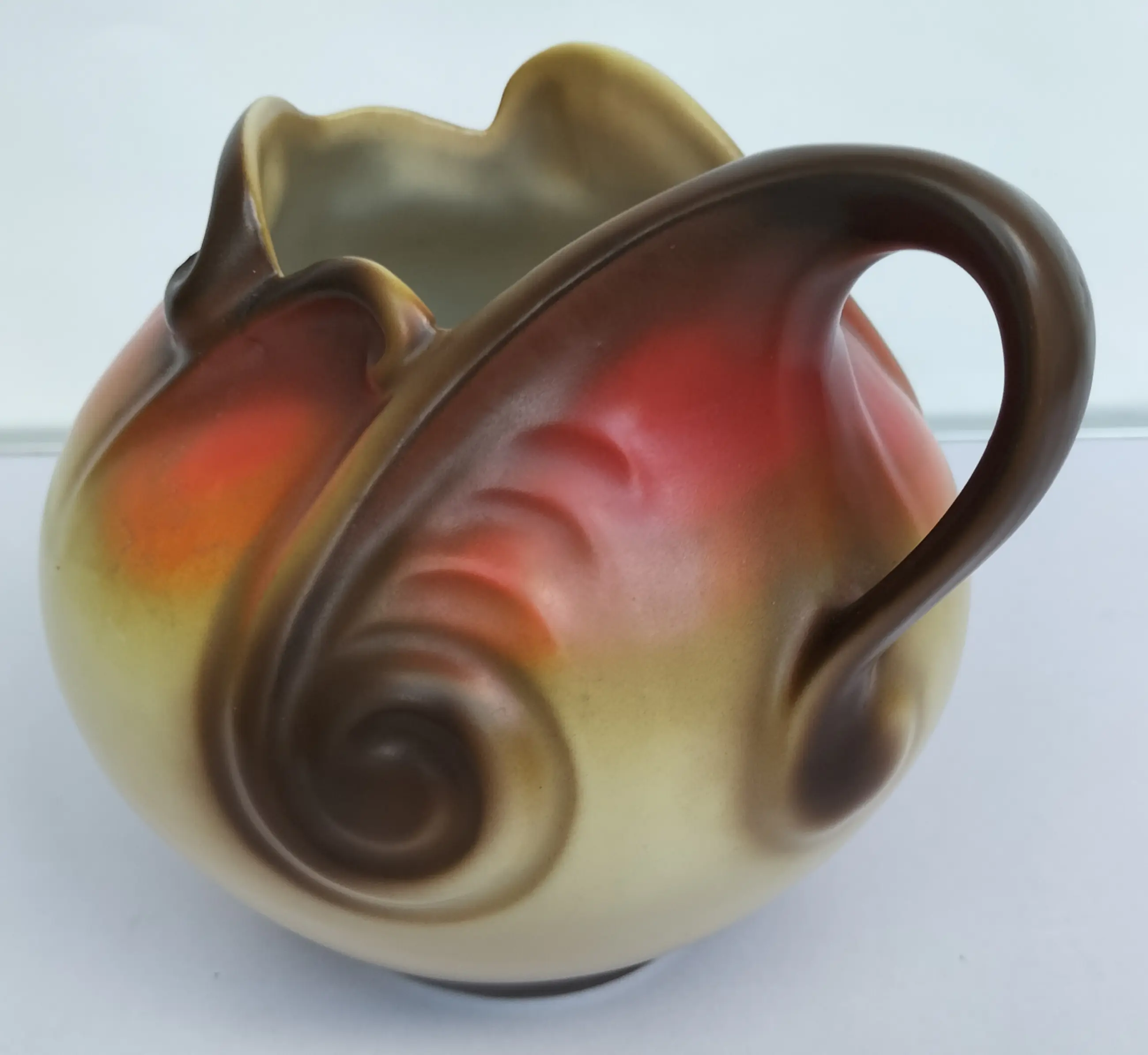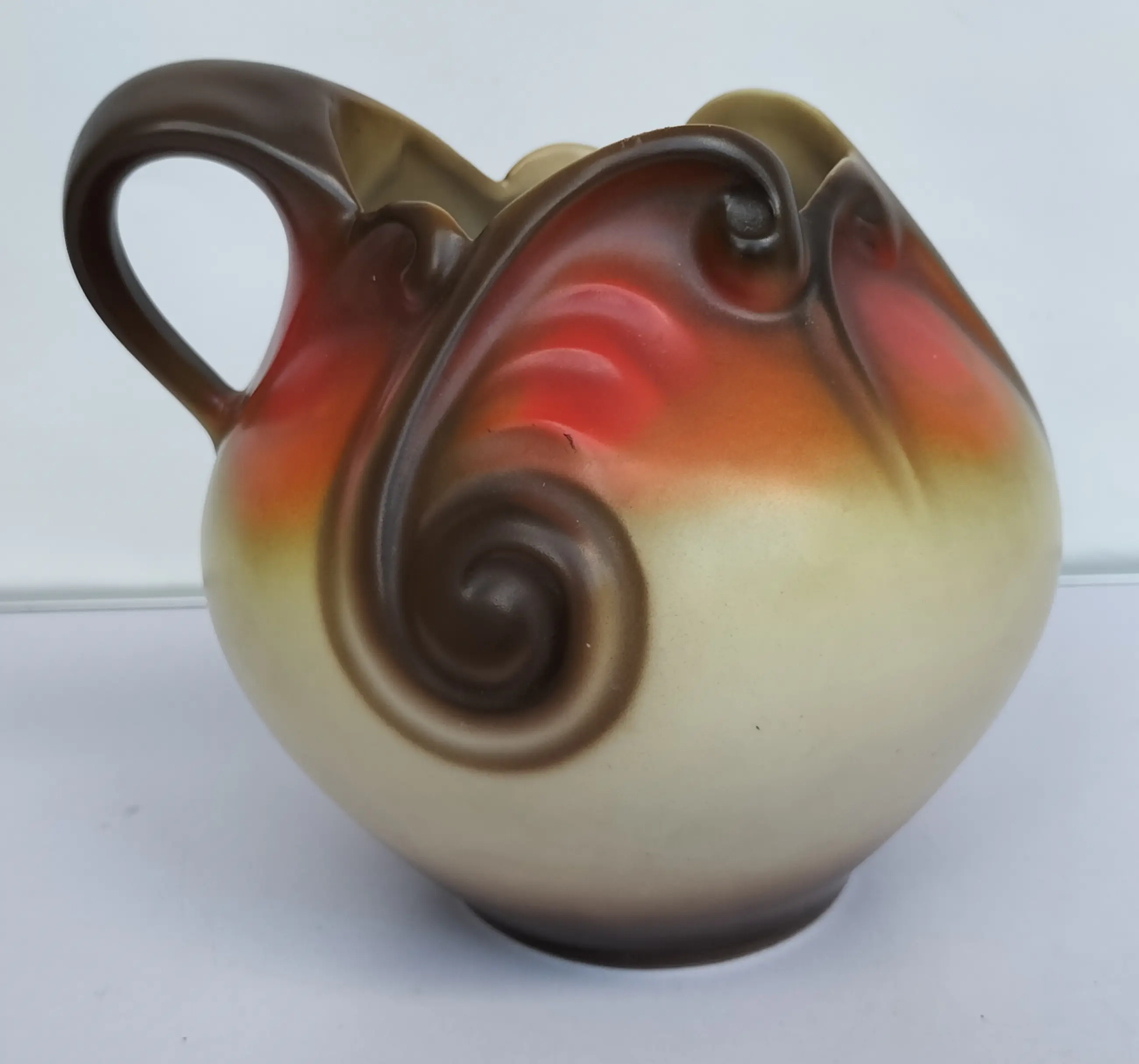 Prachtige kan (of vaas zo u wilt, het kan allebei) van Mosa Maastricht, geproduceerd in de jaren 1920-1930. Een soort bolvormig model met aparte en elegant gevormde opening aan de bovenzijde en een bijzonder gevormd handvat. Bovendien met zeer fraaie decoraties in beige-oranje en bruintinten.