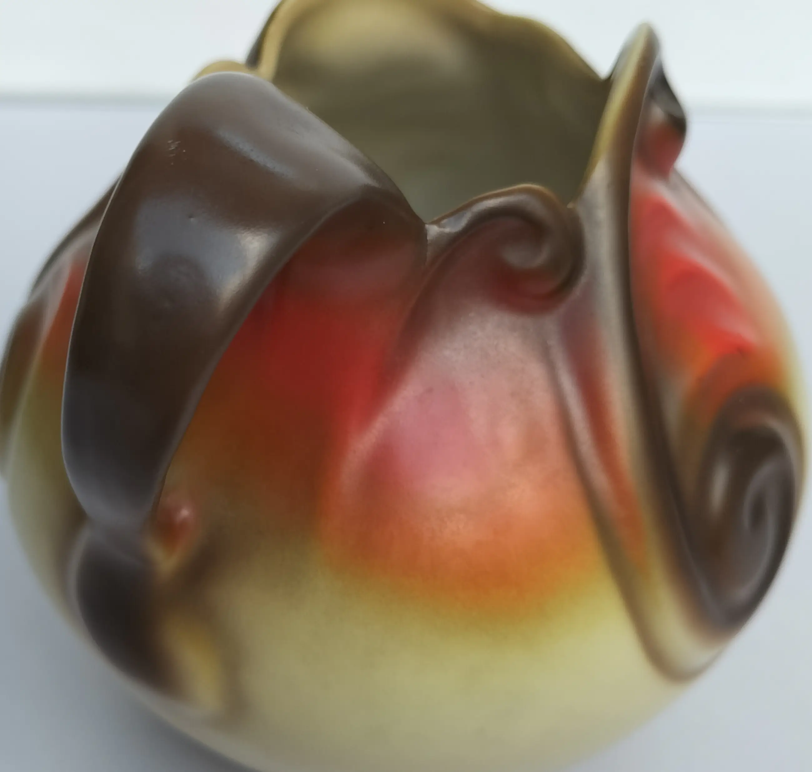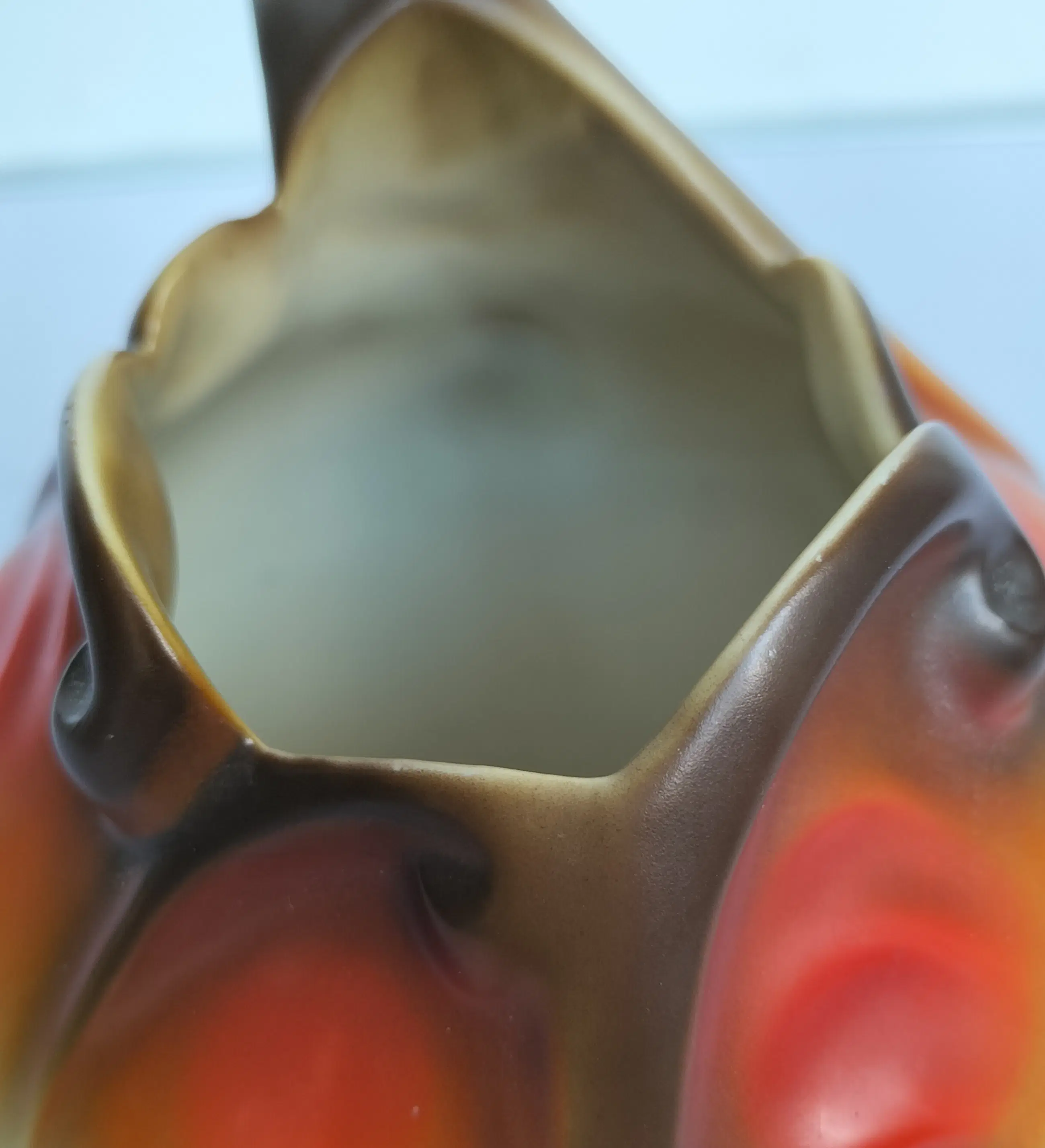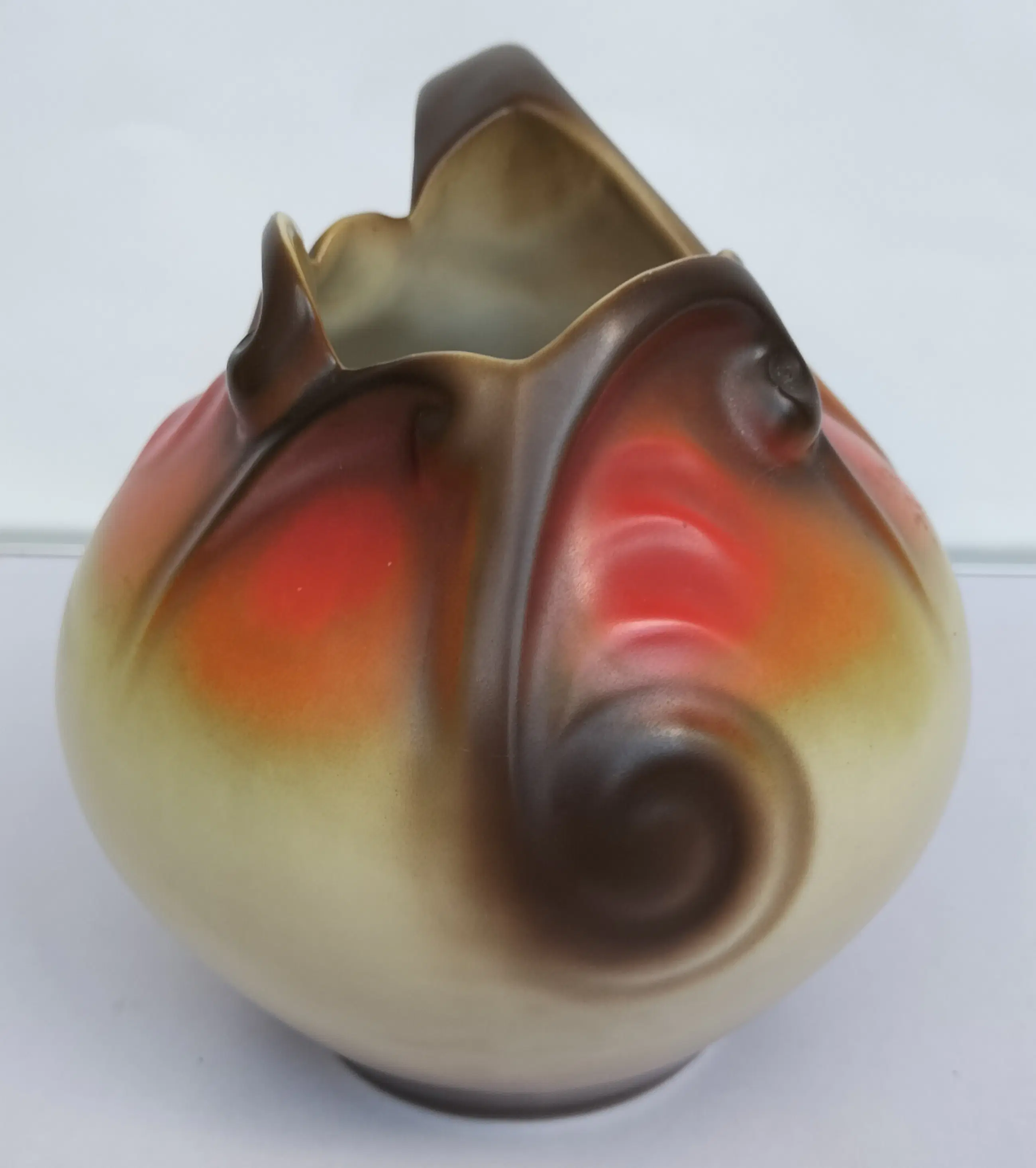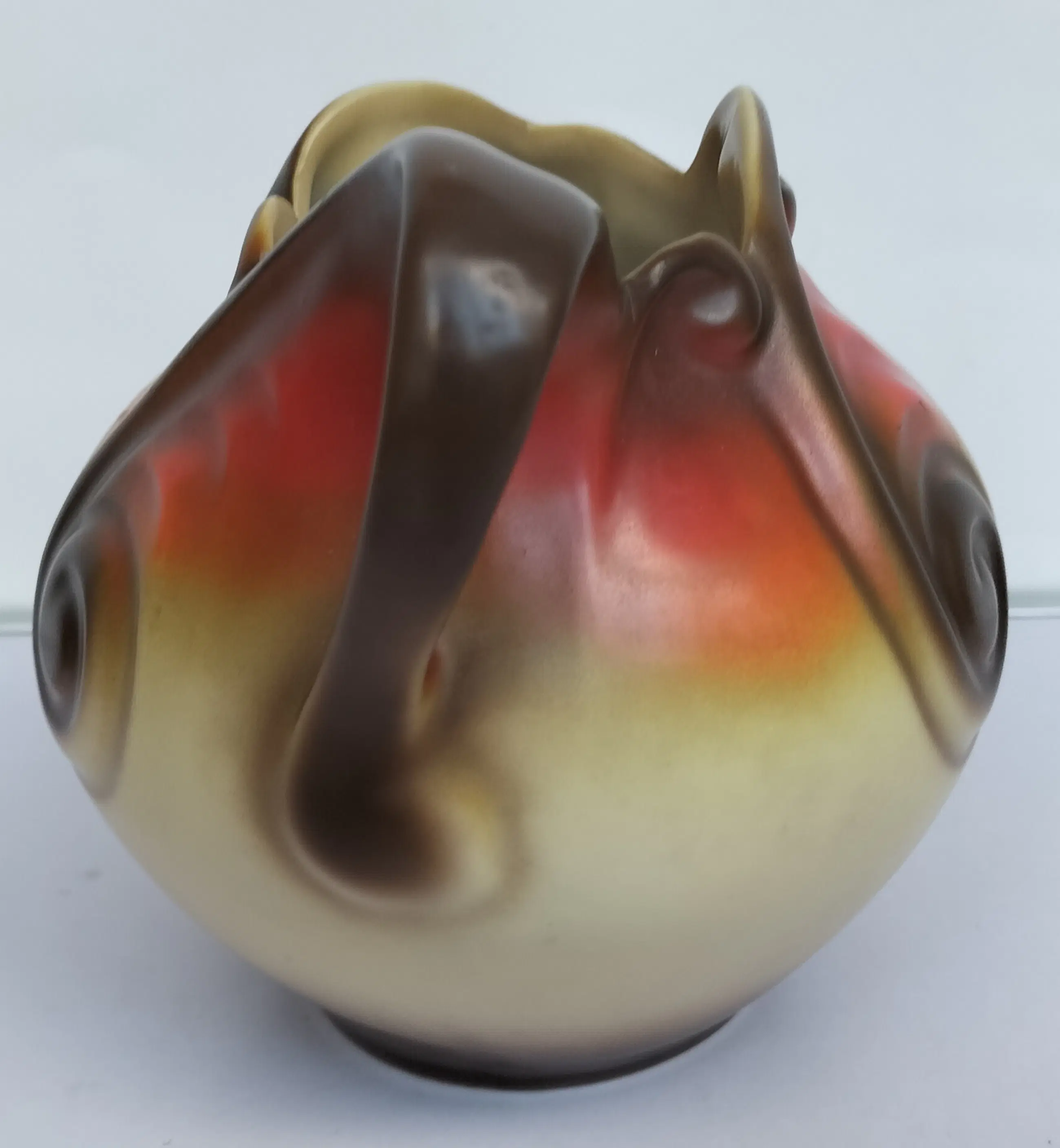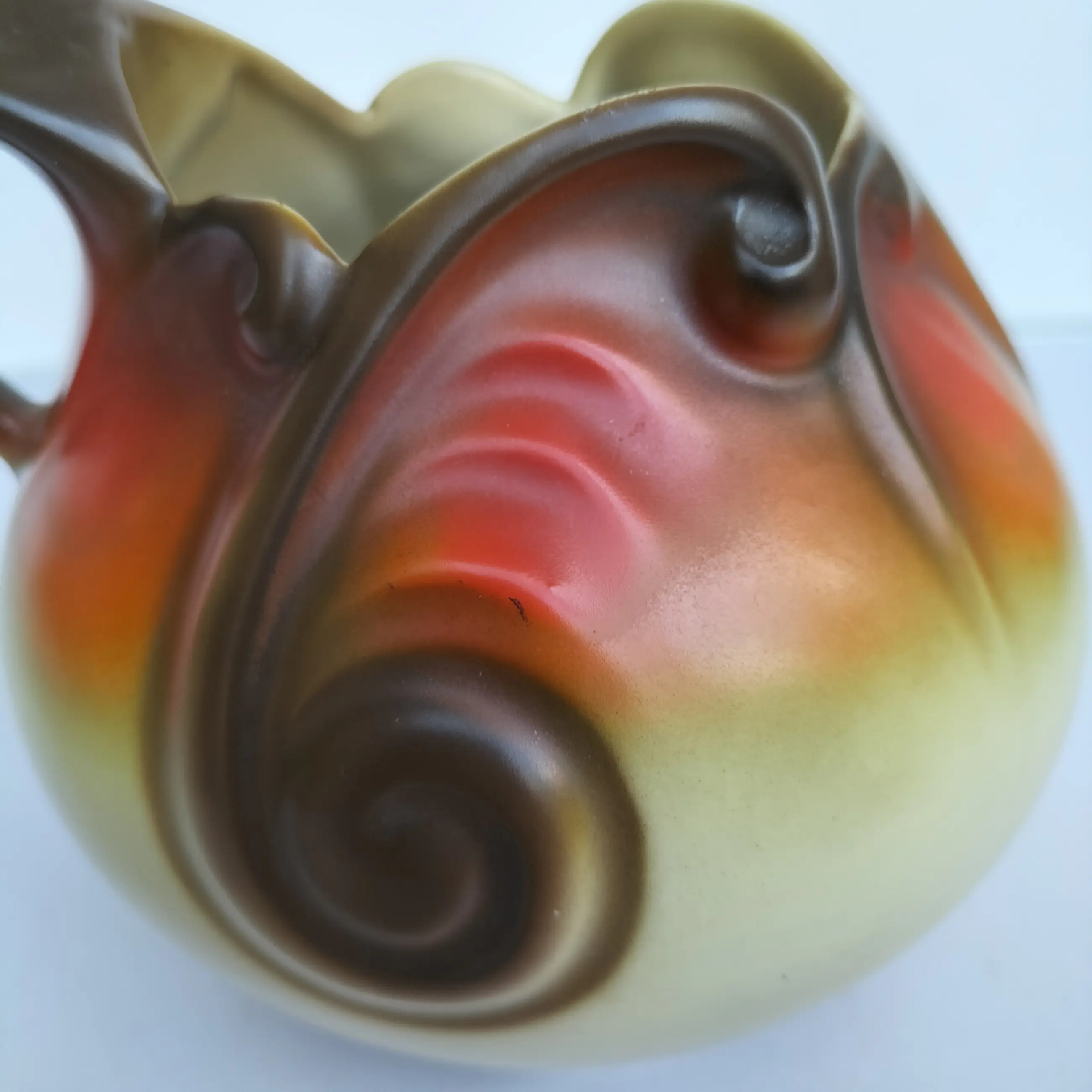 Prachtige kan (of vaas zo u wilt, het kan allebei) van Mosa Maastricht, geproduceerd in de jaren 1920-1930. Een soort bolvormig model met aparte en elegant gevormde opening aan de bovenzijde en een bijzonder gevormd handvat. Bovendien met zeer fraaie decoraties in beige-oranje en bruintinten.