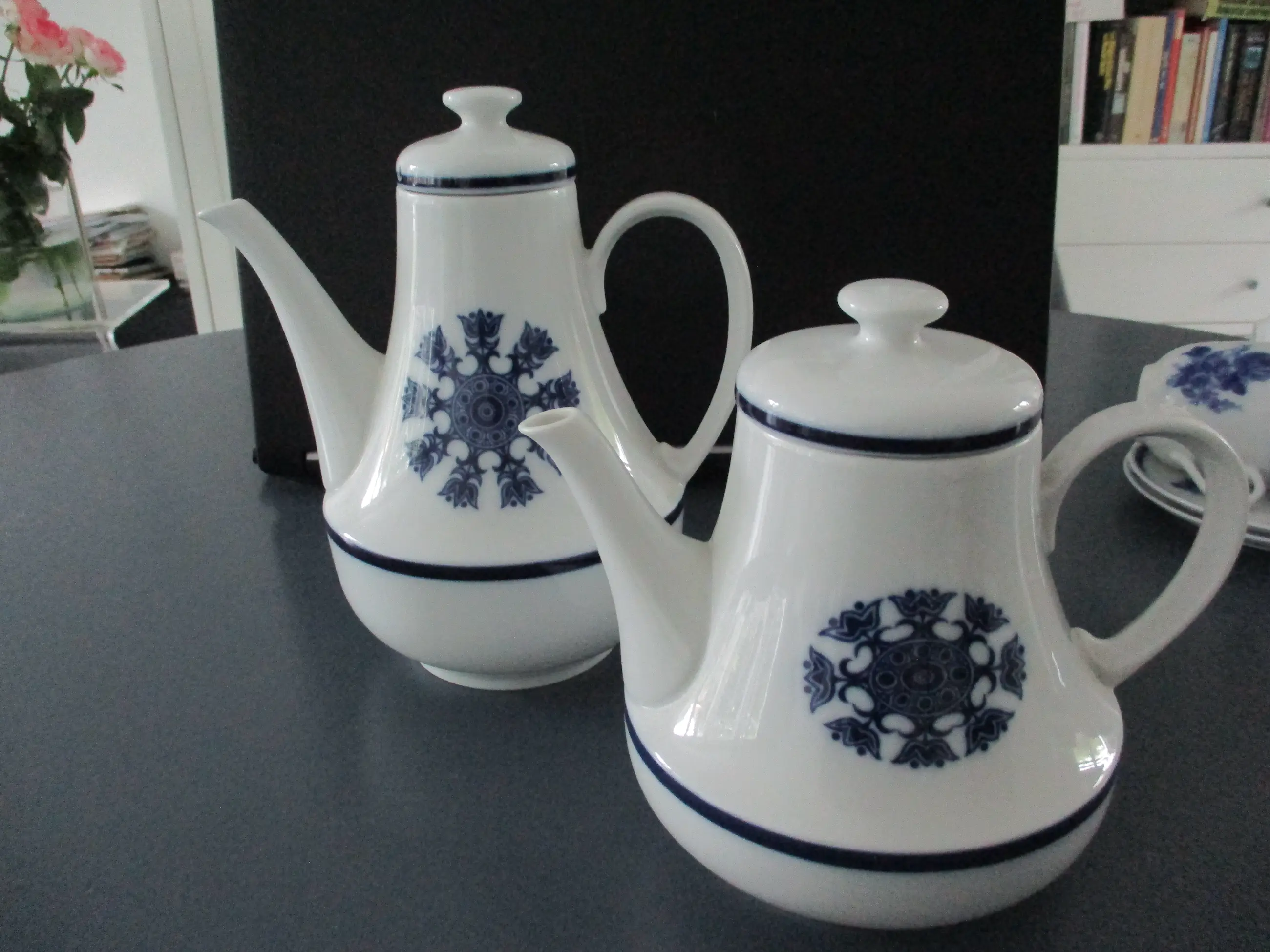 Een prachtig vintage koffie- en theeservies van Mosa Maastricht uit de jaren '70. Gemaakt van wit porselein versierd met blauwe bloemen.