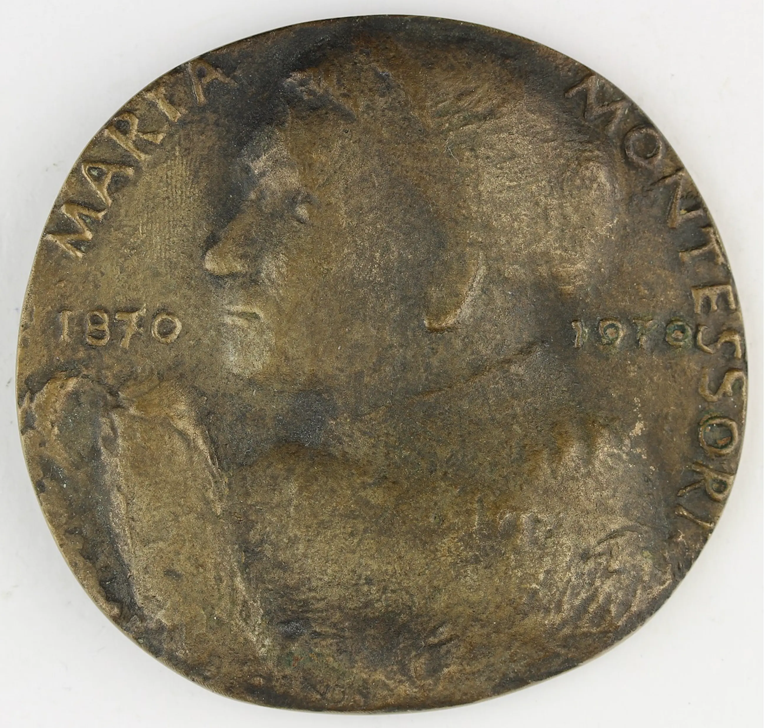 De Italiaanse pedagoge Maria Montessori (1870-1952) moest niets hebben van rigide onderwijssystemen en zij zette zich in voor een aanpak waar de individuele kwaliteiten van het kind voorop stonden. Zij kreeg met haar opvattingen ook in Nederland veel aanhang. Ter gelegenheid van haar honderdste geboortedag werd zij met een penning gememoreerd door Nynke Jelles-Schepers, leerlinge van Esser. De tachtigjarige verschijnt met bontstola en handschoenen, haar opgeheven handen zijn essentieel voor haar wijze van expressie. De vormgeving is bewust enigszins vaag gehouden: Jelles-Scheper zocht naar een harmonische, vloeiende overgang van figuur naar fond, niet naar een scherp omlijnde beeltenis op een plat vlak. Op de keerzijde is de jonge, vrije mens verbeeld, een kind van achteren gezien. Daar omheen een geliefde uitspraak van Montessori: 'Via d'amore indicata dal bambino'. De weg van de liefde wordt gewezen door het kind. #Louk Tilanus, Handzame Sculptuur
