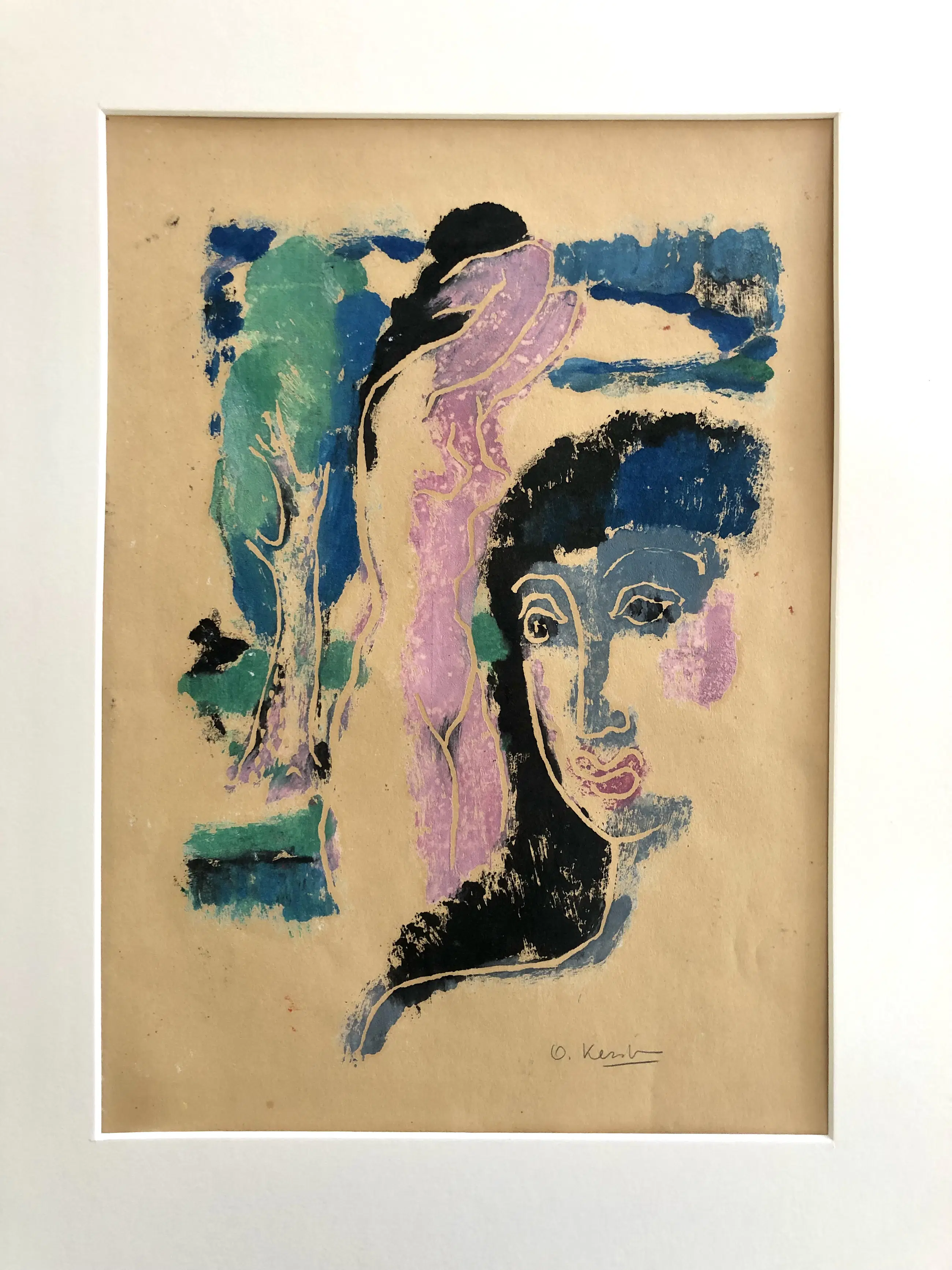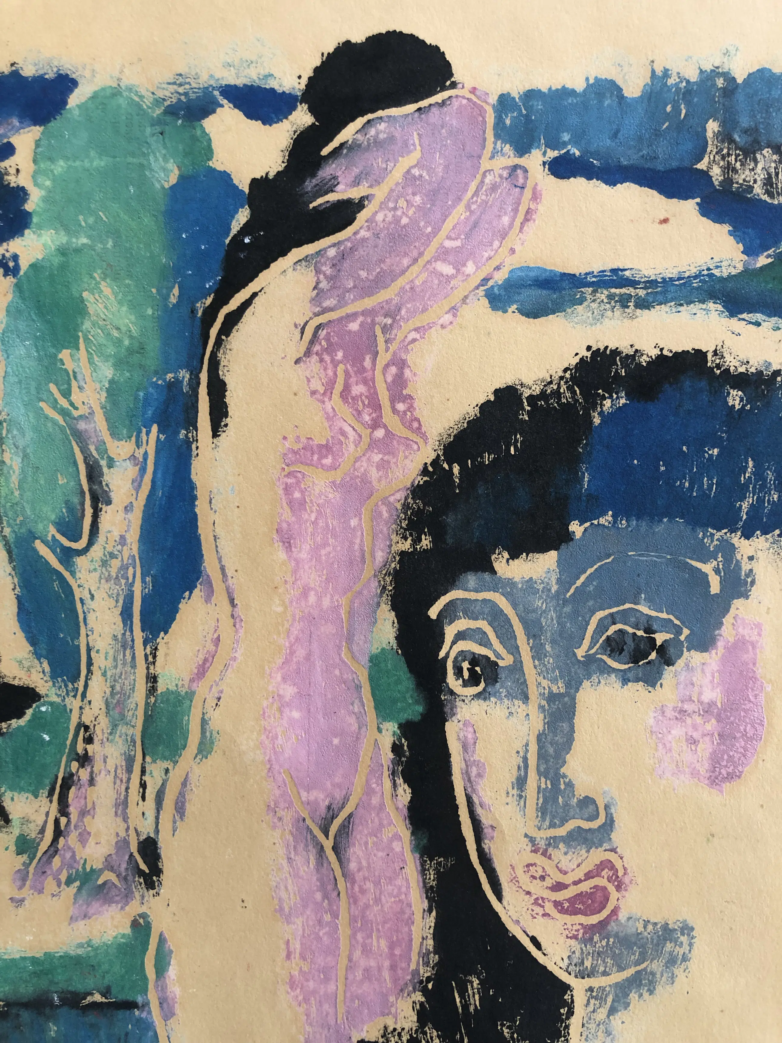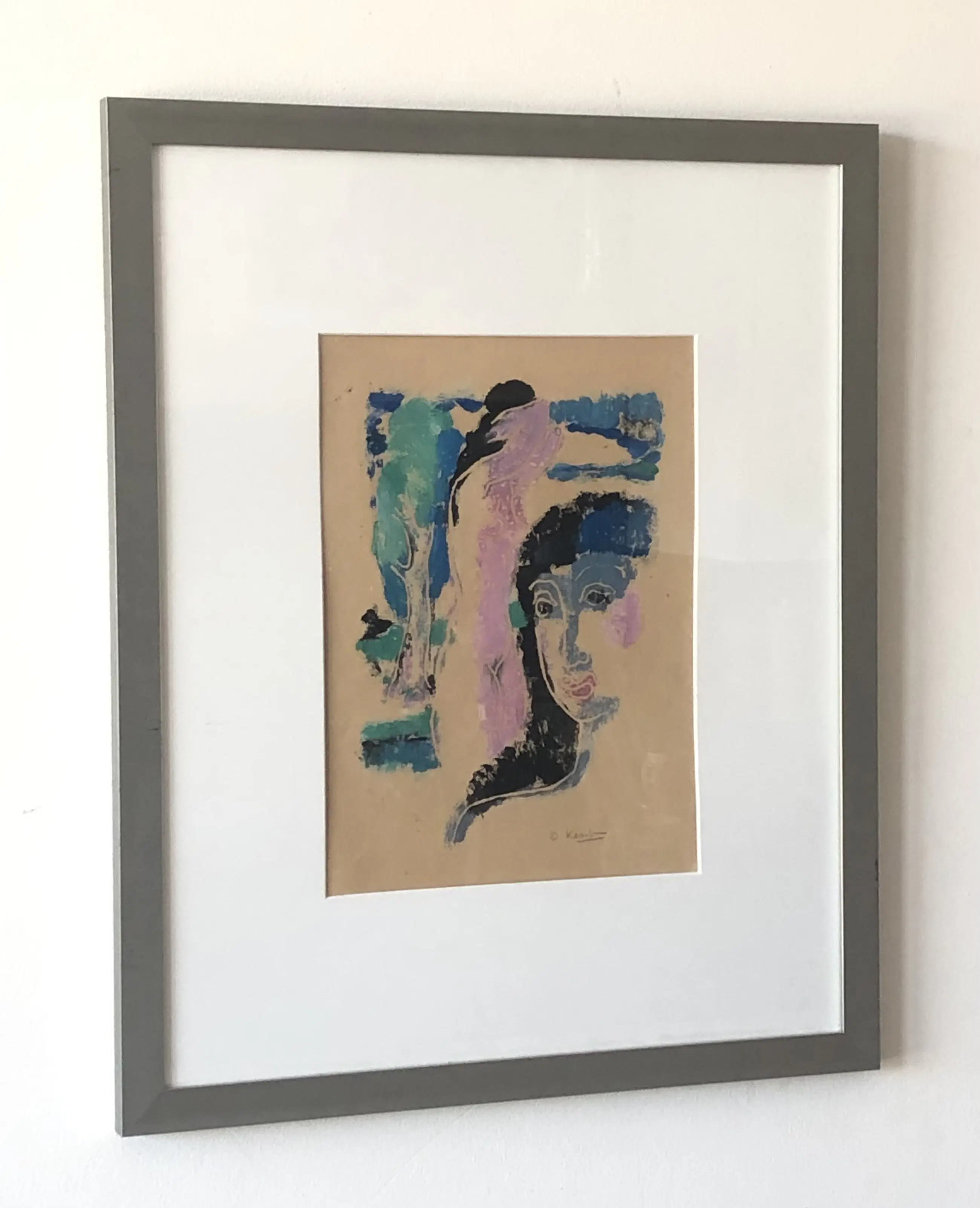 Prachtig uniek werk uit de jaren 60 van graficus, schilder, tekenaar en Artibus leraar Obbe Kerssen. Twee badende figuren in de natuur gevat in een nette lijst en passe-partout.