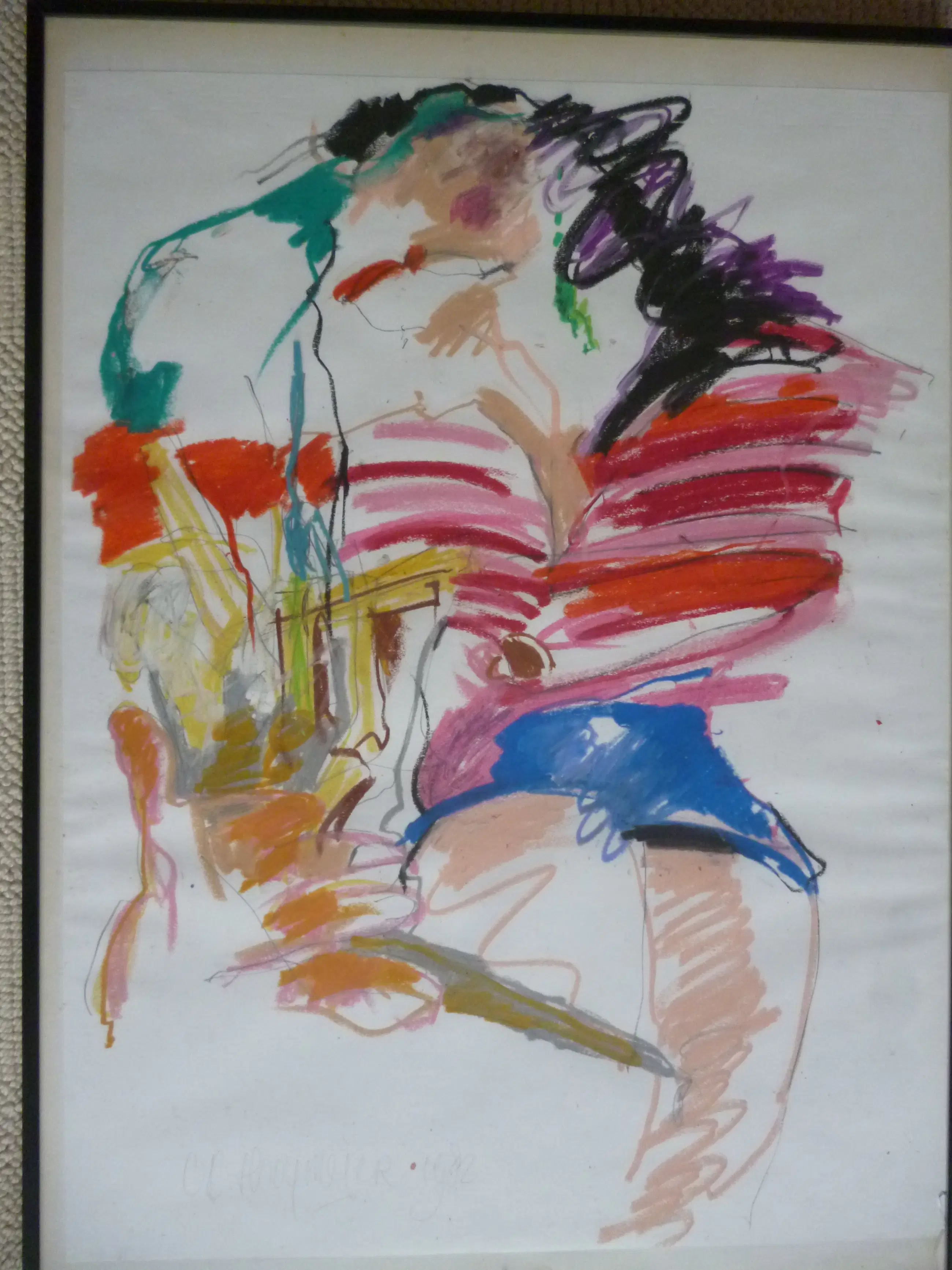 Pastel in spontane tekenstijl, geabstraheerde erotische voorstelling, Cobra-geïnspireerd.
