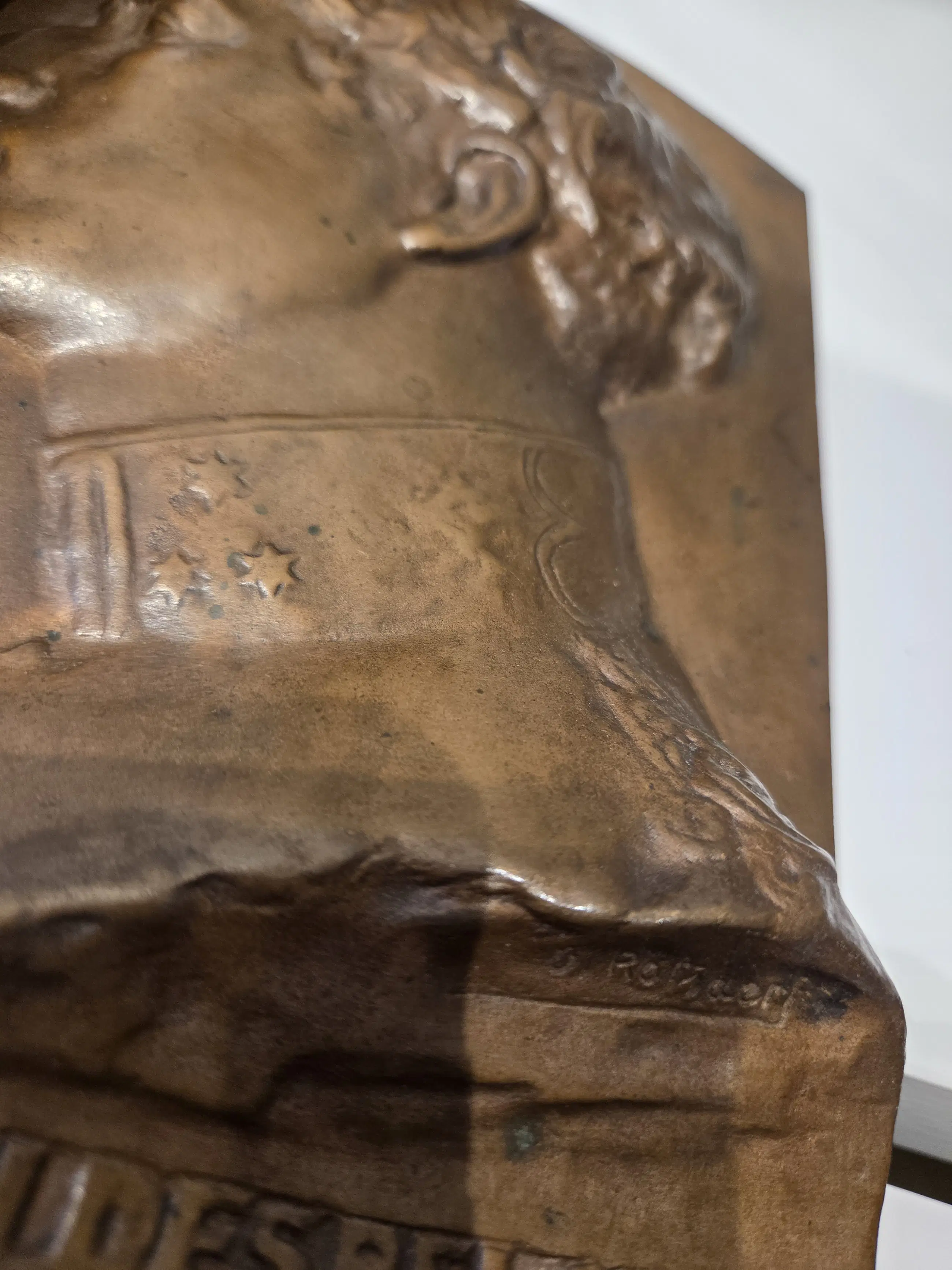 Materiaal: Brons (hoogstwaarschijnlijk gegoten) op een houten sokkel.