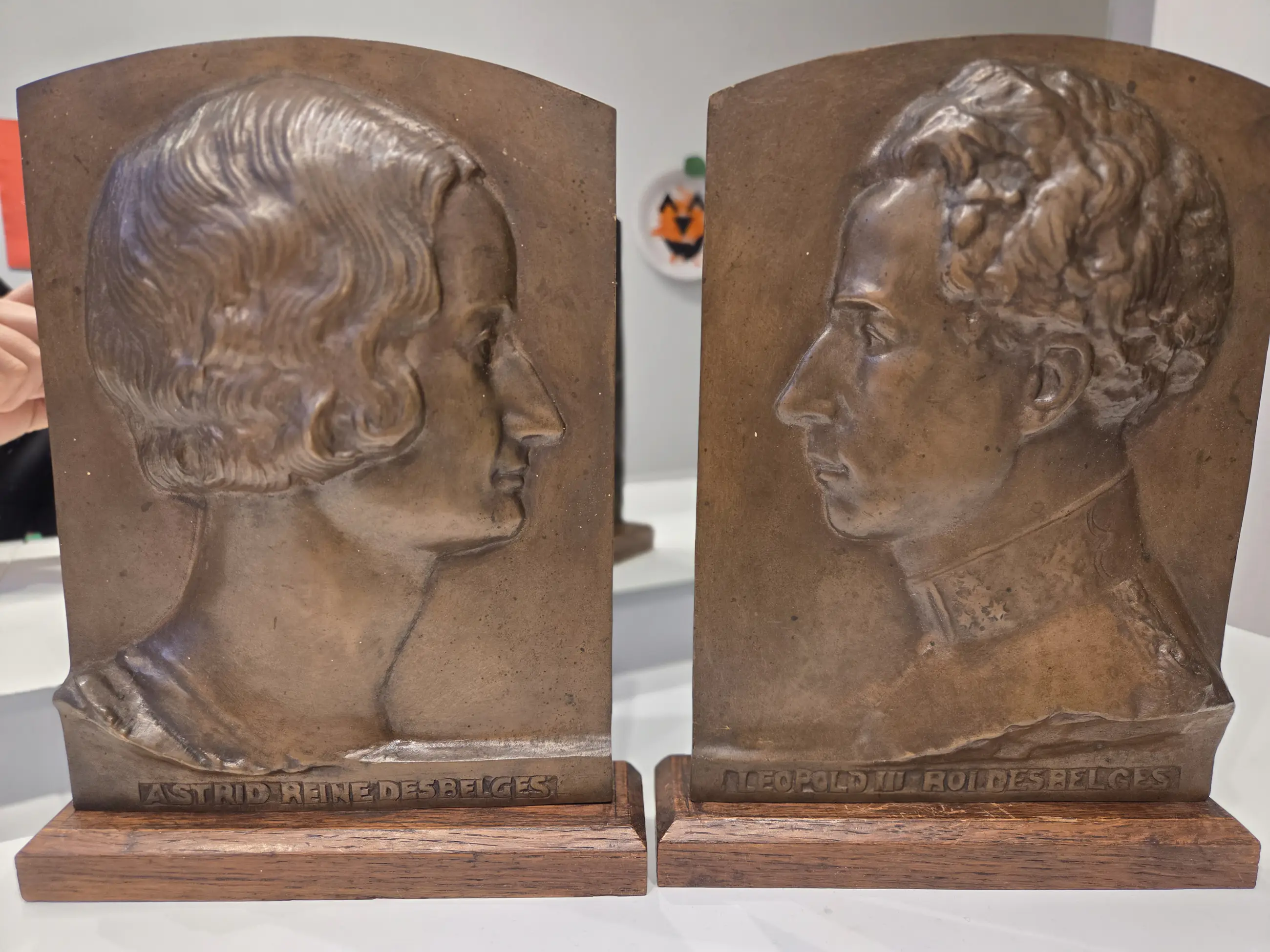 Een uniek paar bronzen portretten in reliëf, gemonteerd op houten voetstukken. De plaquettes tonen de profielen van het geliefde koningspaar uit de jaren '30.