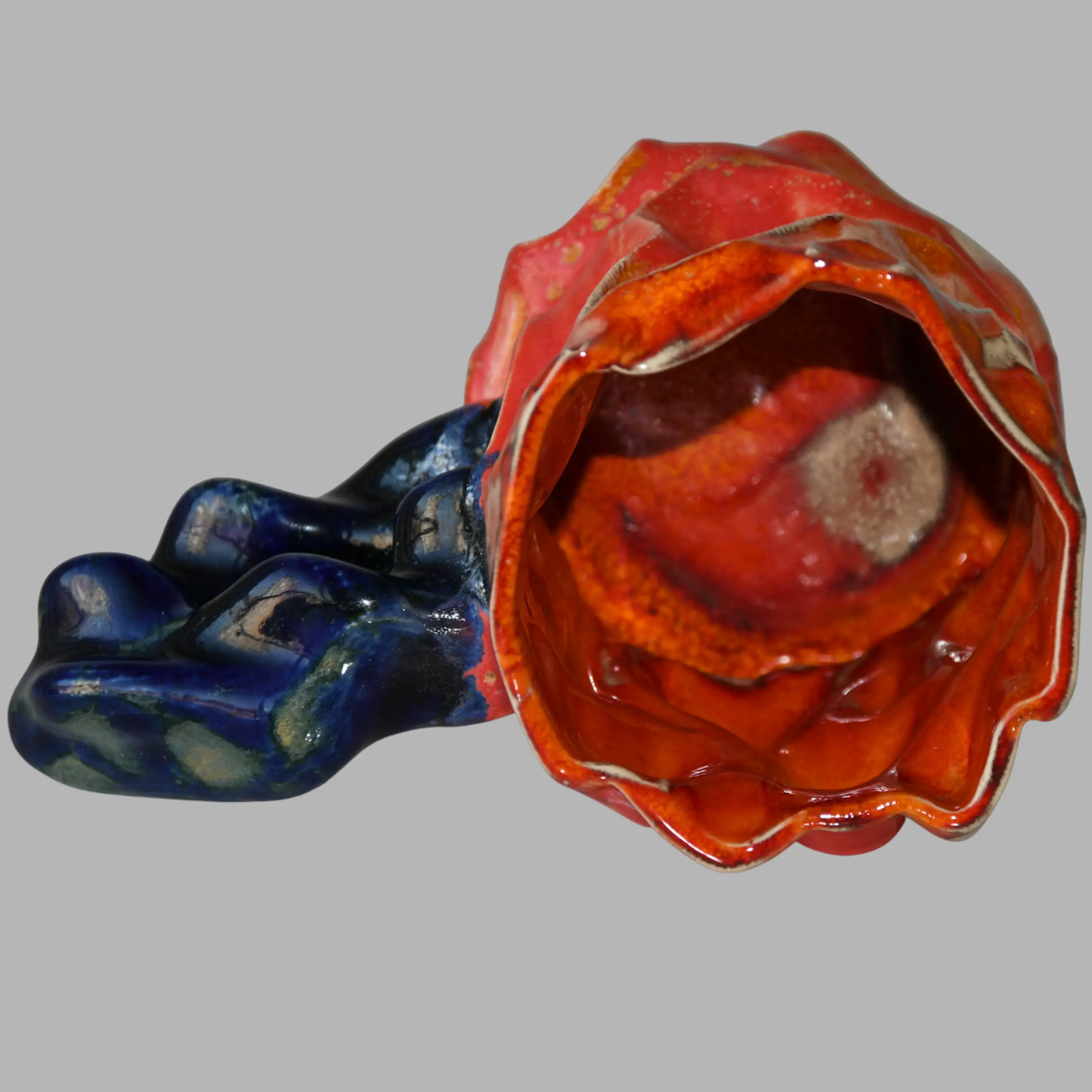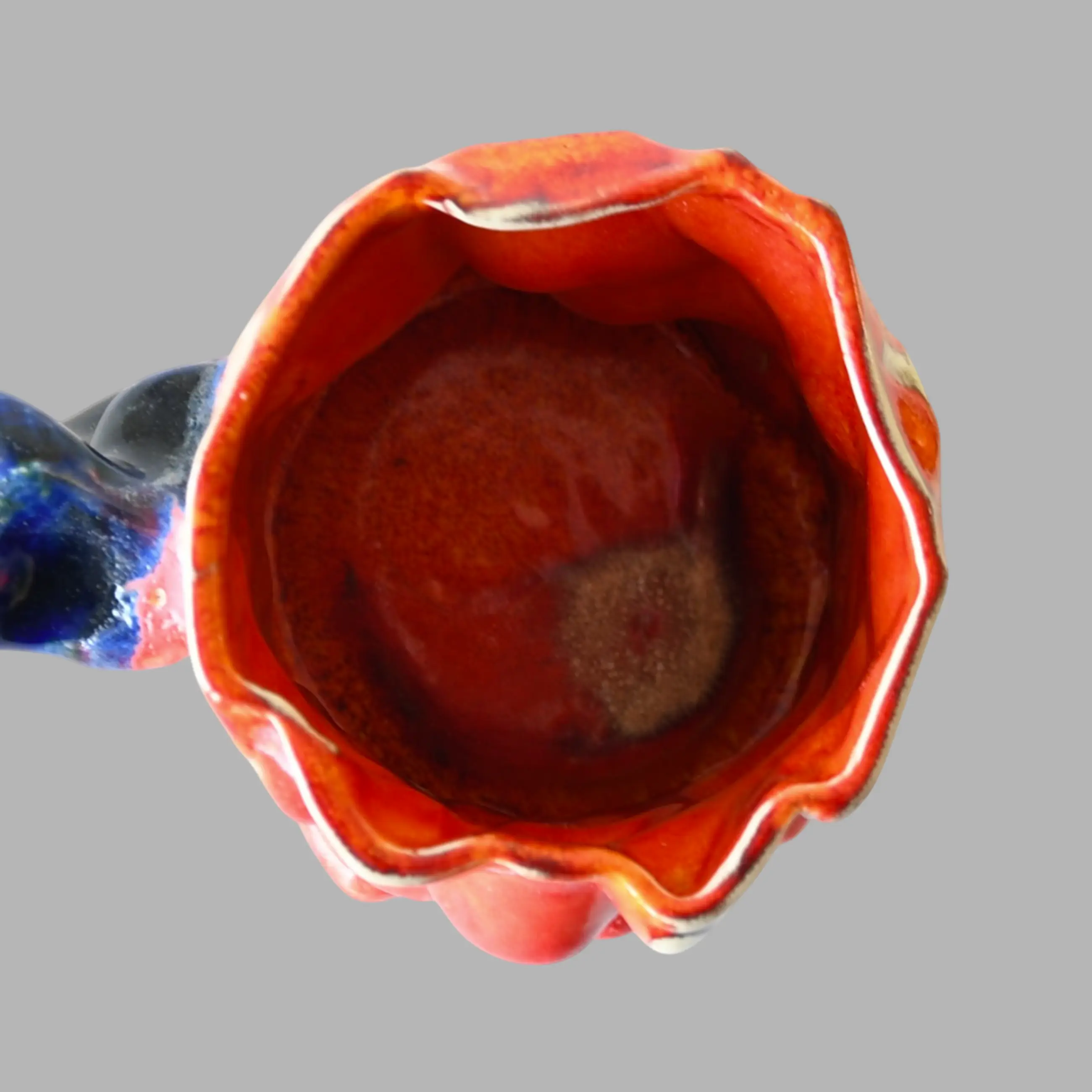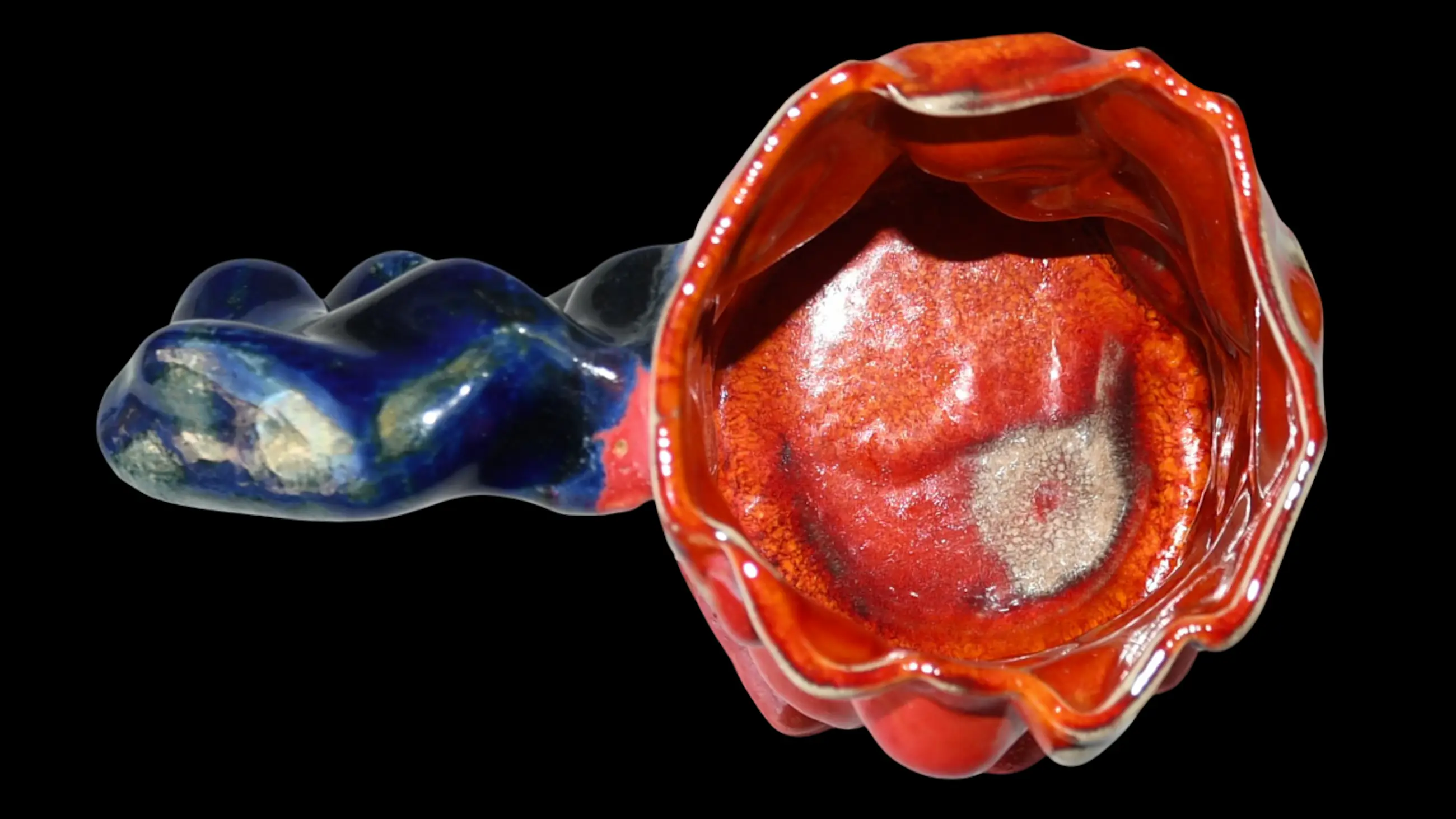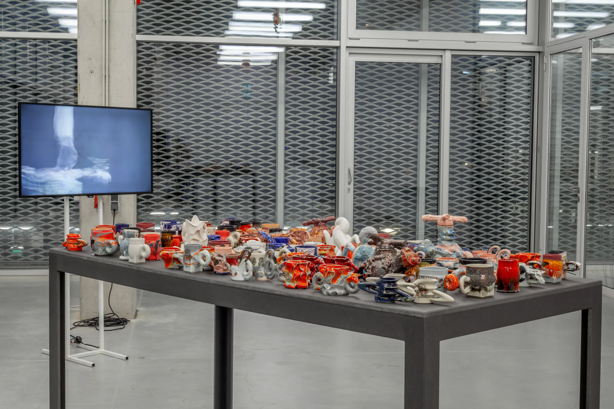 Deze sculpturale keramiek beker is van zijn eindejaars project Fellows Published 2021-2022 aan de Gerrit Rietveld Academie in Amsterdam. Zie de foto met meerdere keramiek objecten op een grote tafel.