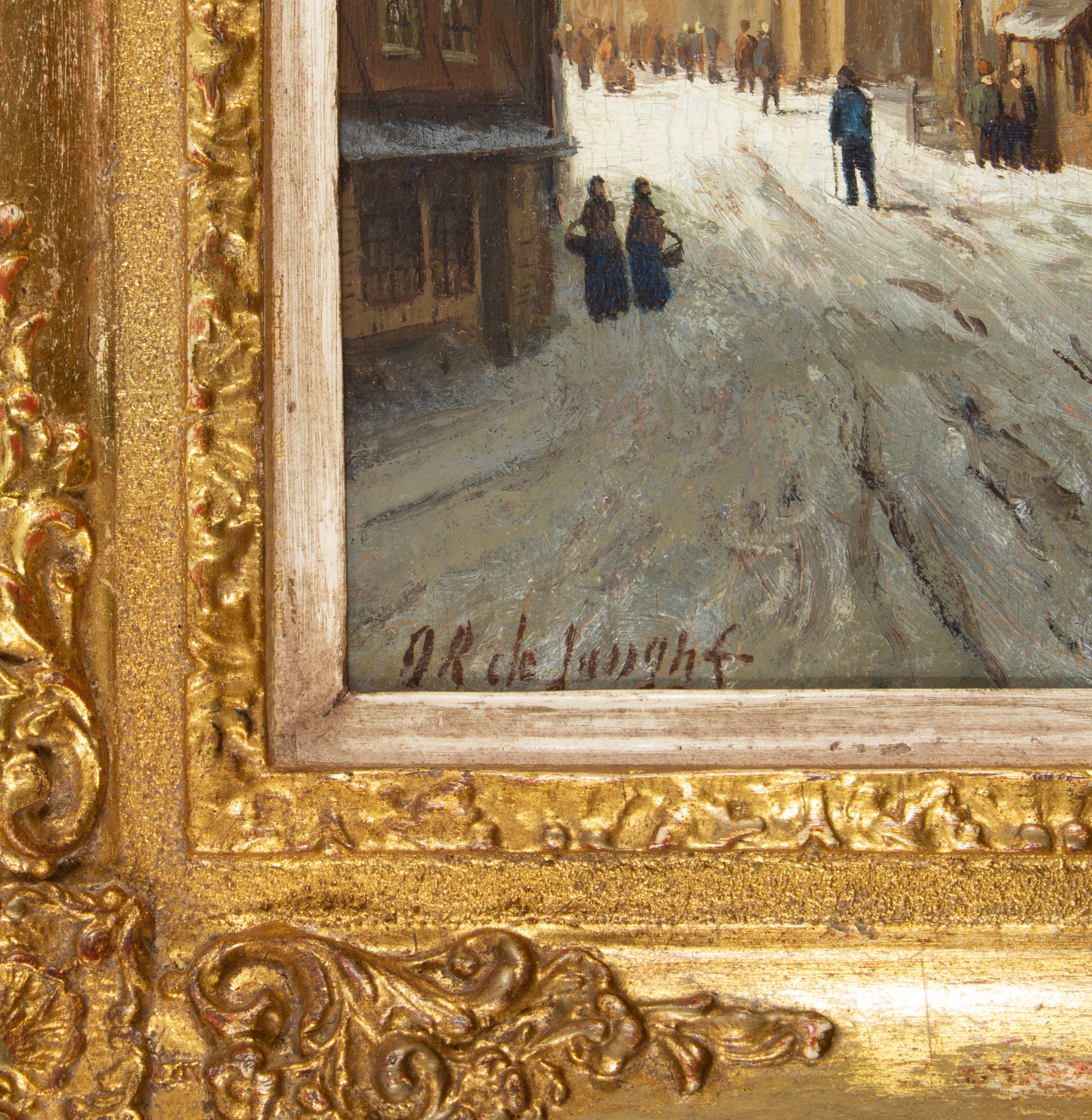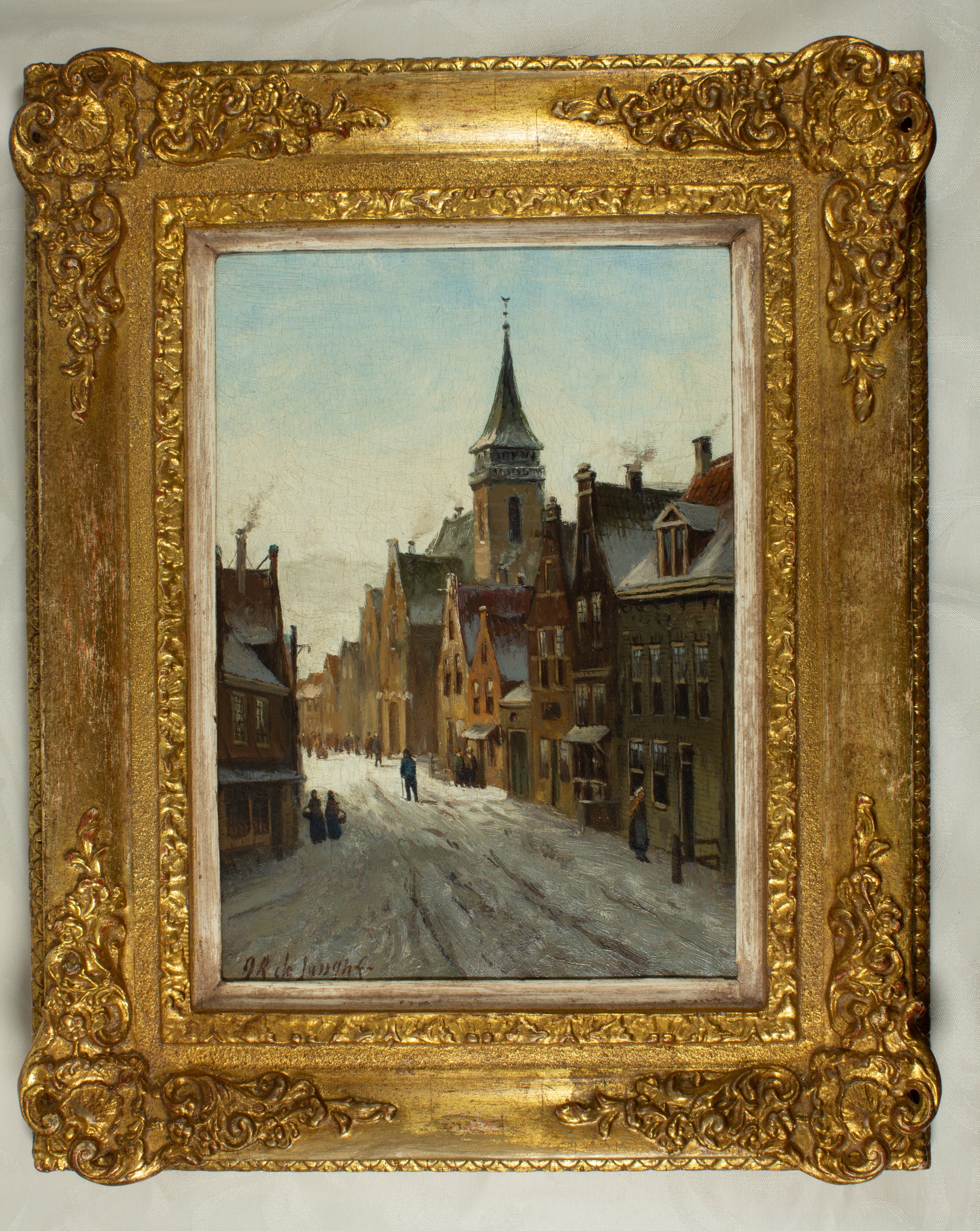 Oene Romkes de Jongh werd op 6 april 1812 in Makkum geboren. Hij overleed op 1 juli 1896 te Amsterdam. Hij woonde en werkte in Amsterdam tot 1884 en in Nieuwer-Amstel tot 1896. Oene Romkes de Jongh schilderde vooral stadsgezichten, waaronder die van Amsterdam en de Zuiderzeehavens. Bekend vanwege zijn winterse stadsgezichten. Daarnaast schilderde hij een enkel landschap, veelal met een boerderij aan een vaart.