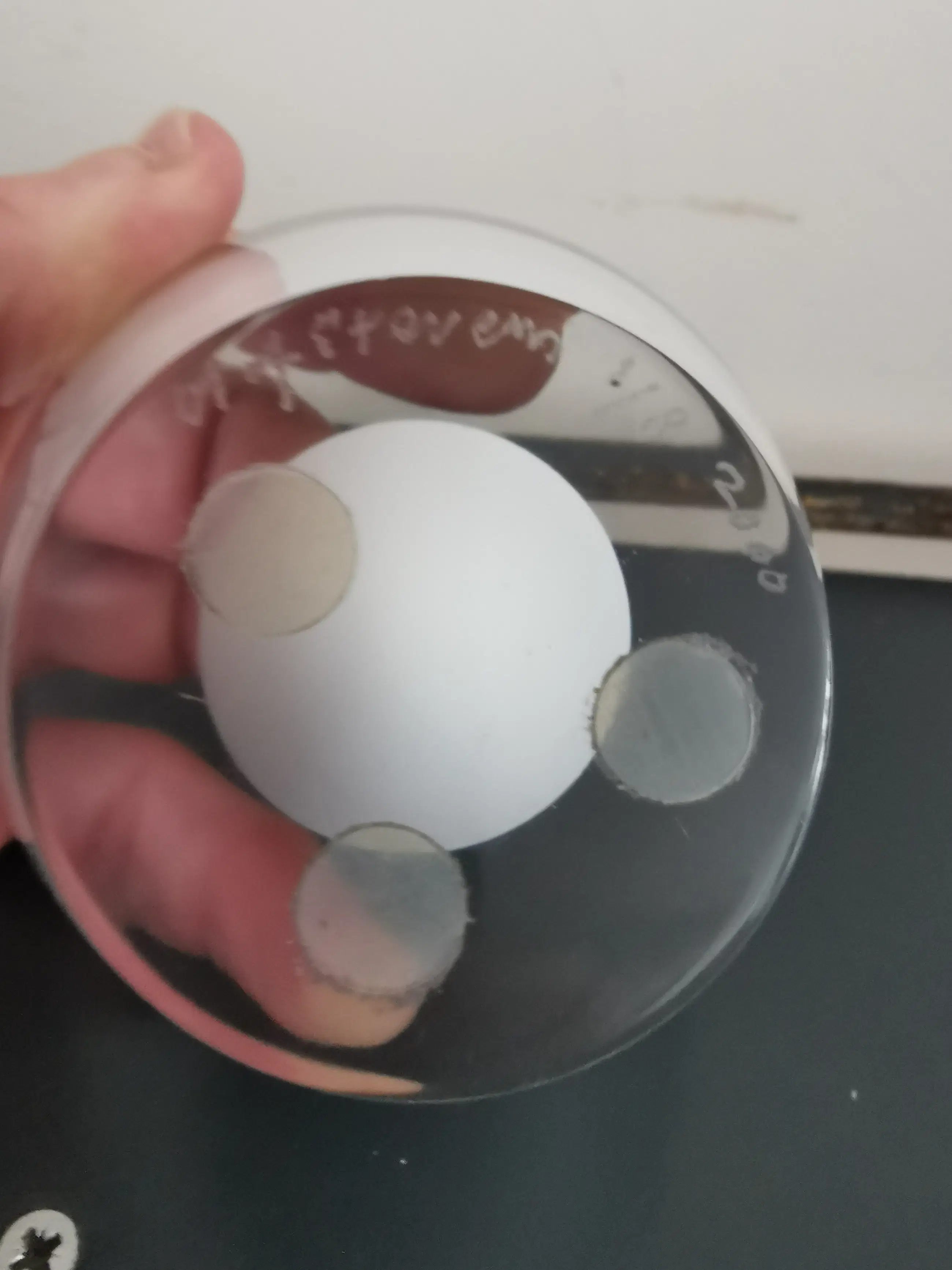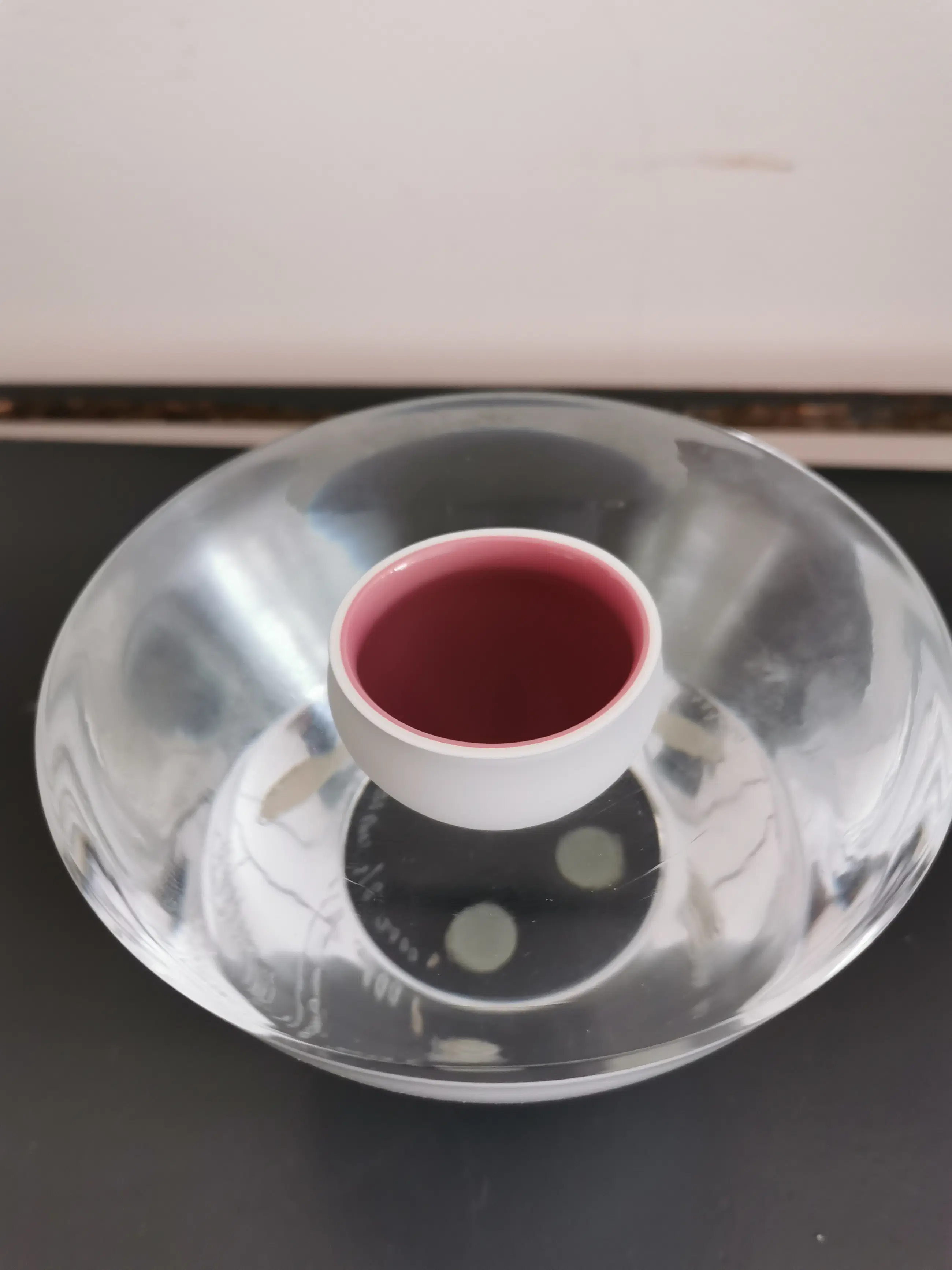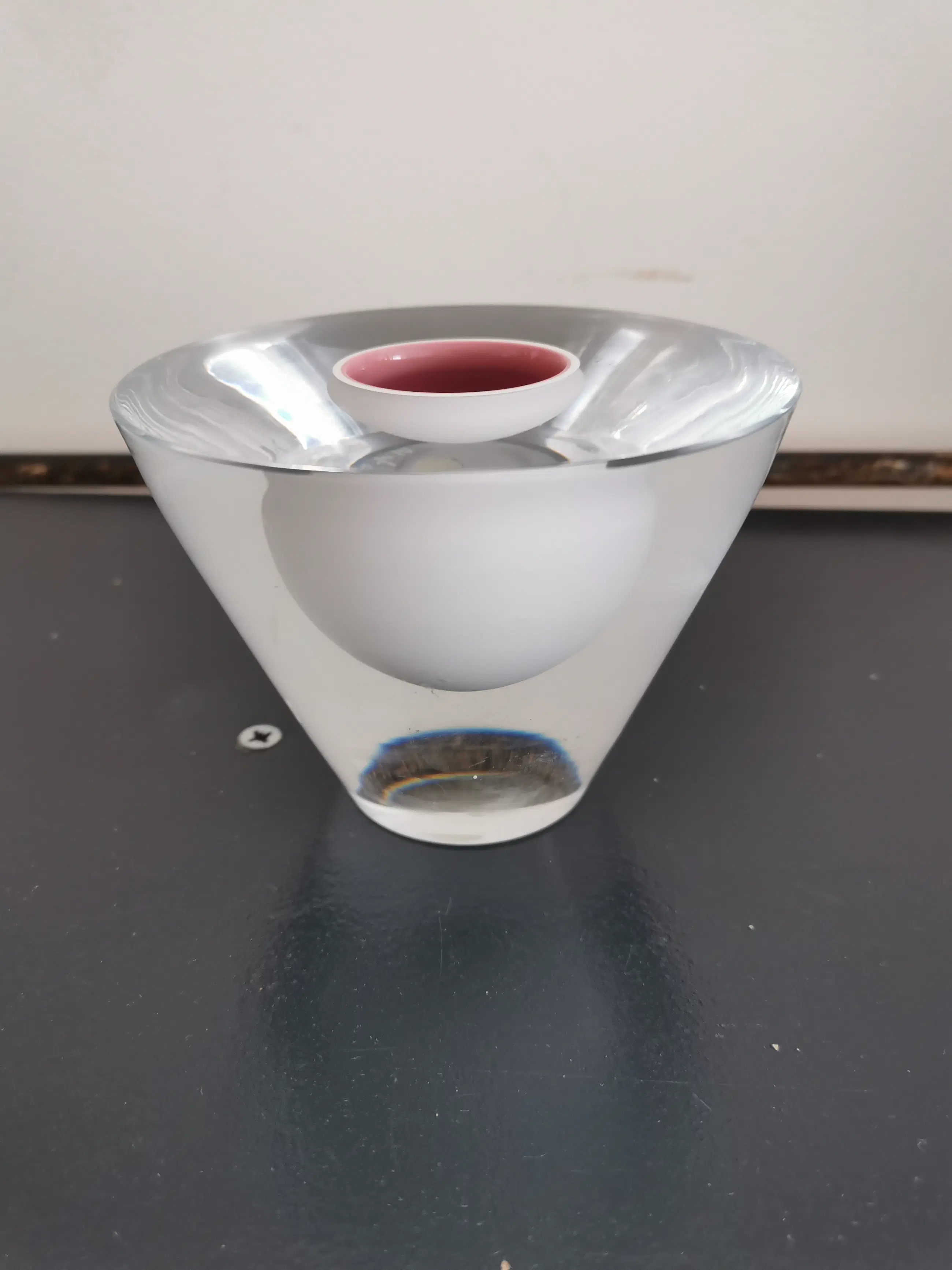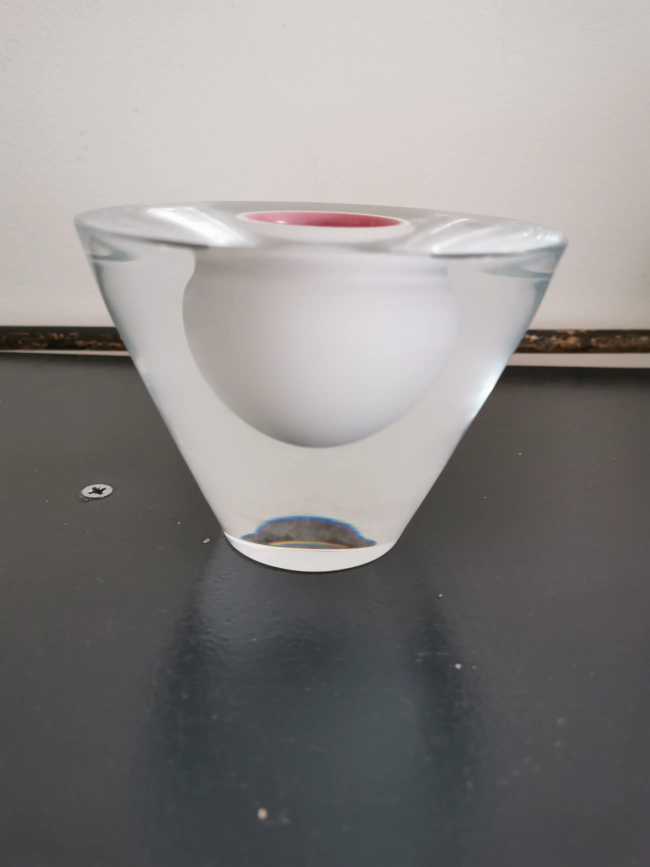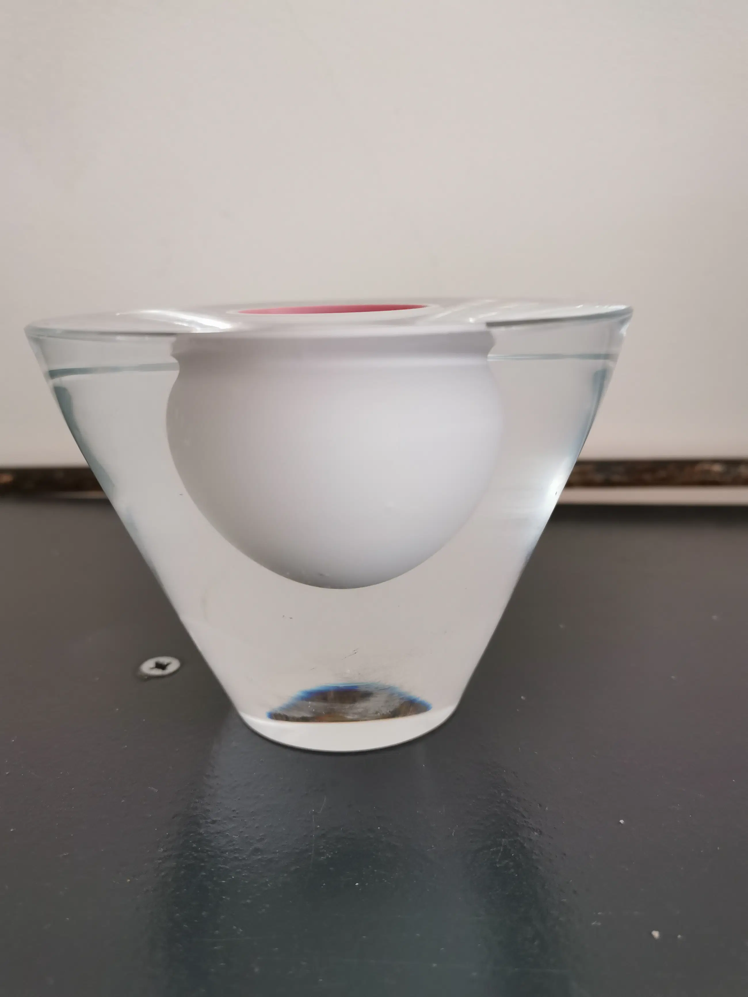 Prachtig gedetailleerd glas werk gemaakt volgens de oude graal techniek door de bekende maker Hugo Stevens voor leerdam 1 uit de serie van 8 gemaakt in het jaar 2000, heldere kristallen basis met een witte bol daarin en de kern is rosé.
