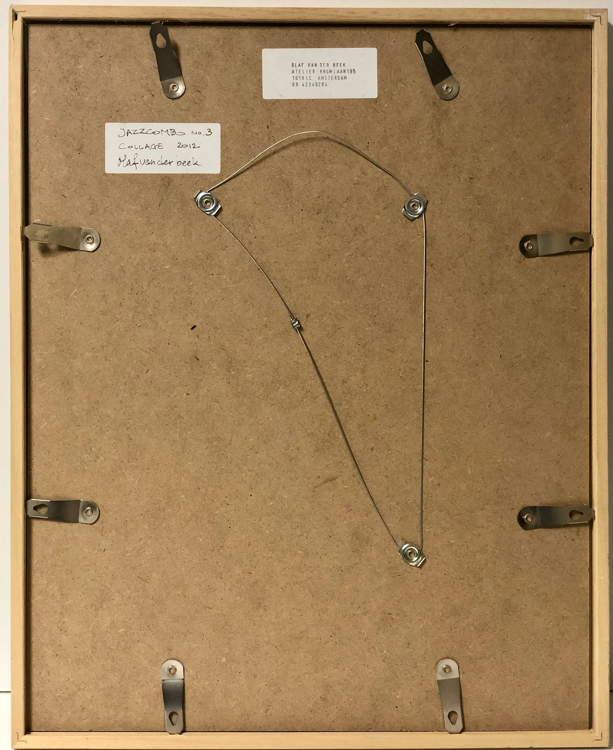 De collage heeft de titel ‘Jazzcombo nr 3’ en is op het werk gesigneerd en gedateerd. Op de achterzijde de titel en de gegevens van de kunstenaar.