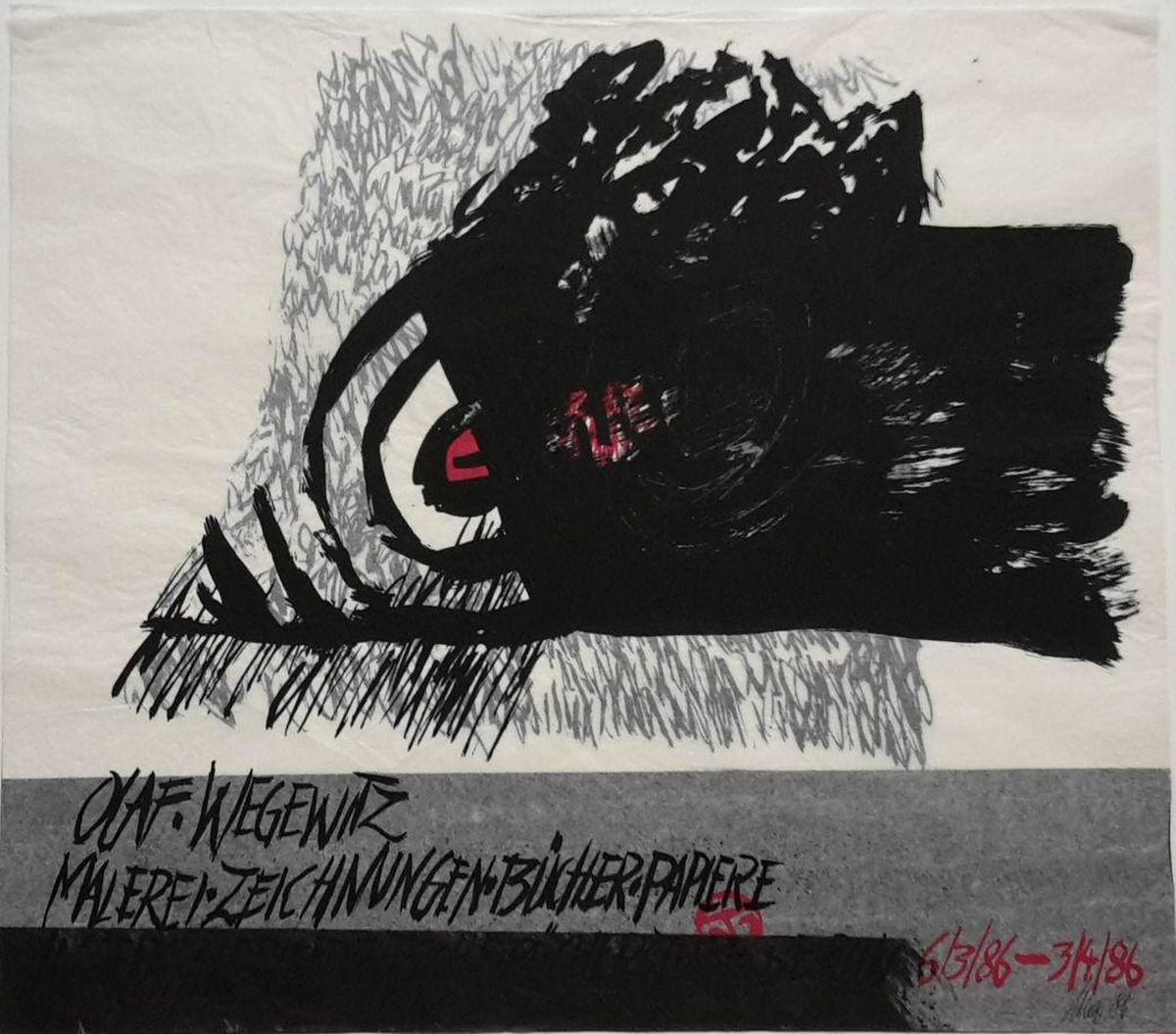 Siebdruck (2 Druckgänge) eines Posterentwurf zur Ausstellung Berlin 1986 auf dünnes durchsichtiges Papier. Im zweiter Druckgang ist ein Teil der Abbildung und der Name der Ausstellungsgalerie vom Künstler mit Schwartz überzogen (dennoch sichtbar beim Gegenlicht).