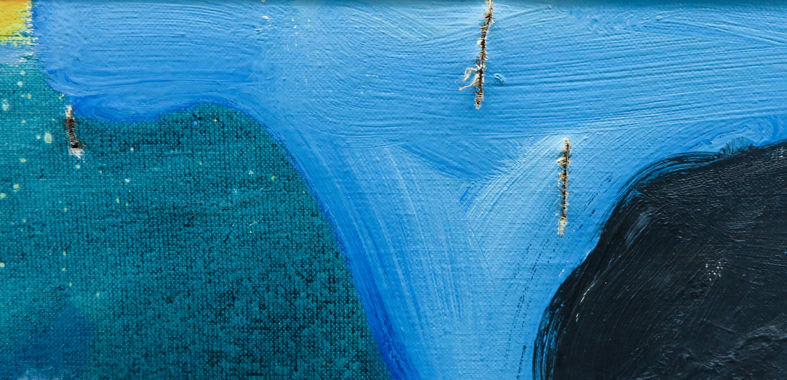 Meerdere scheurtjes in het doek, zowel in de gele en blauwe vlakken boven, als in het rode vlak linksonder. Tevens rechts een deuk in het doek.