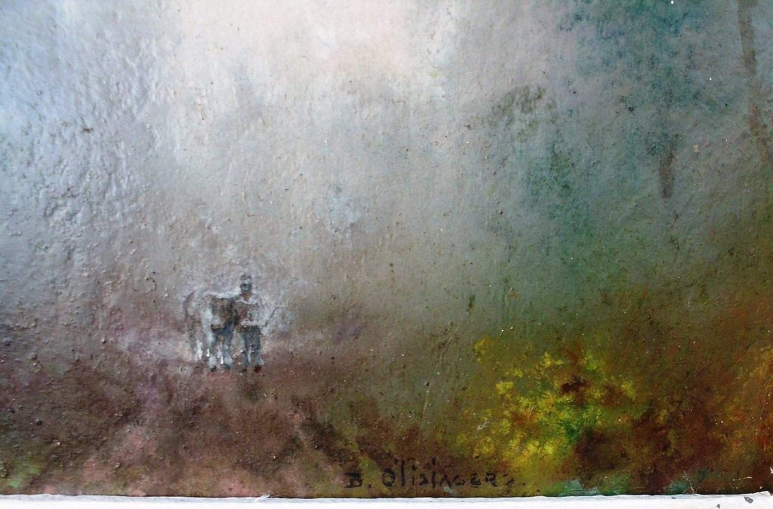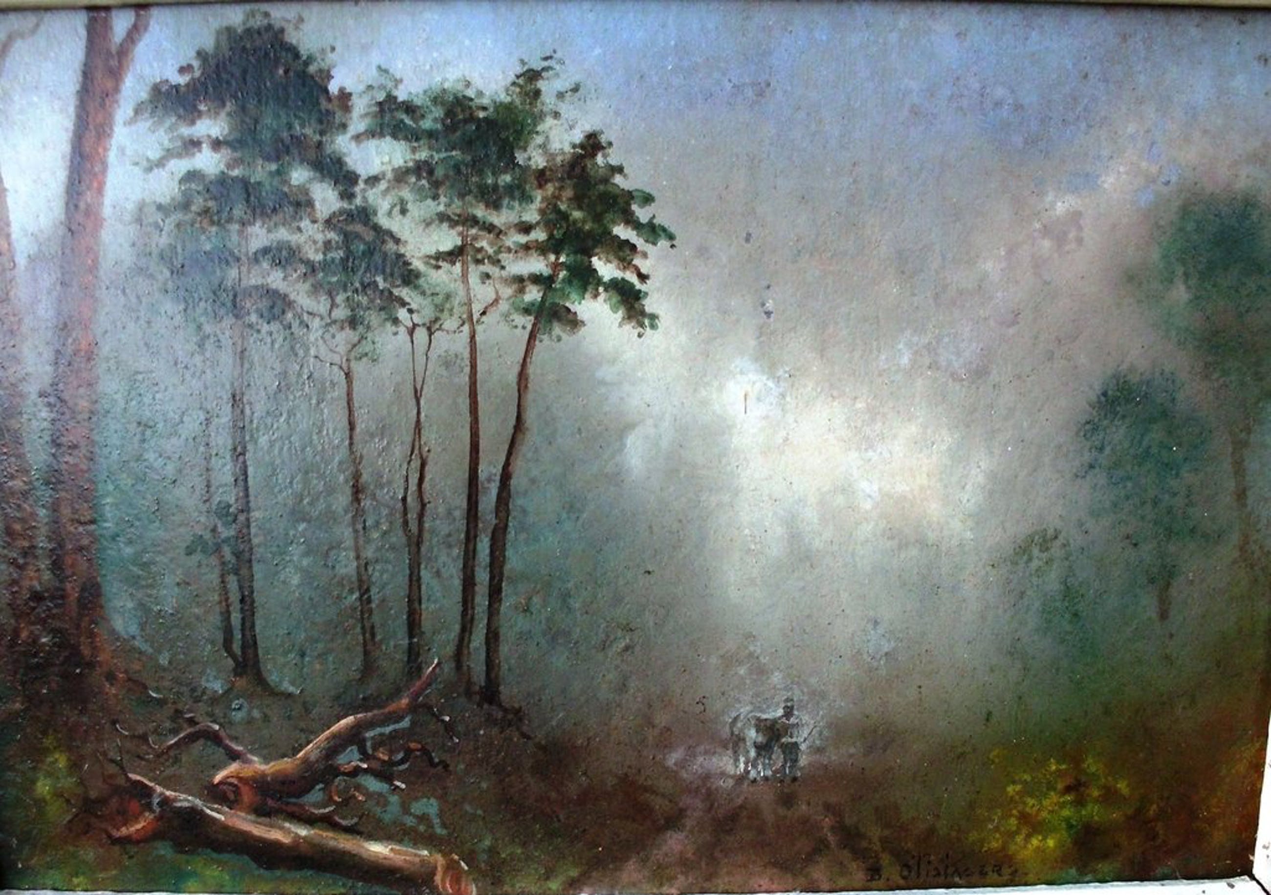 Bosggezicht met houtvester ne paard aan het werk.Gesigneerd r.o.