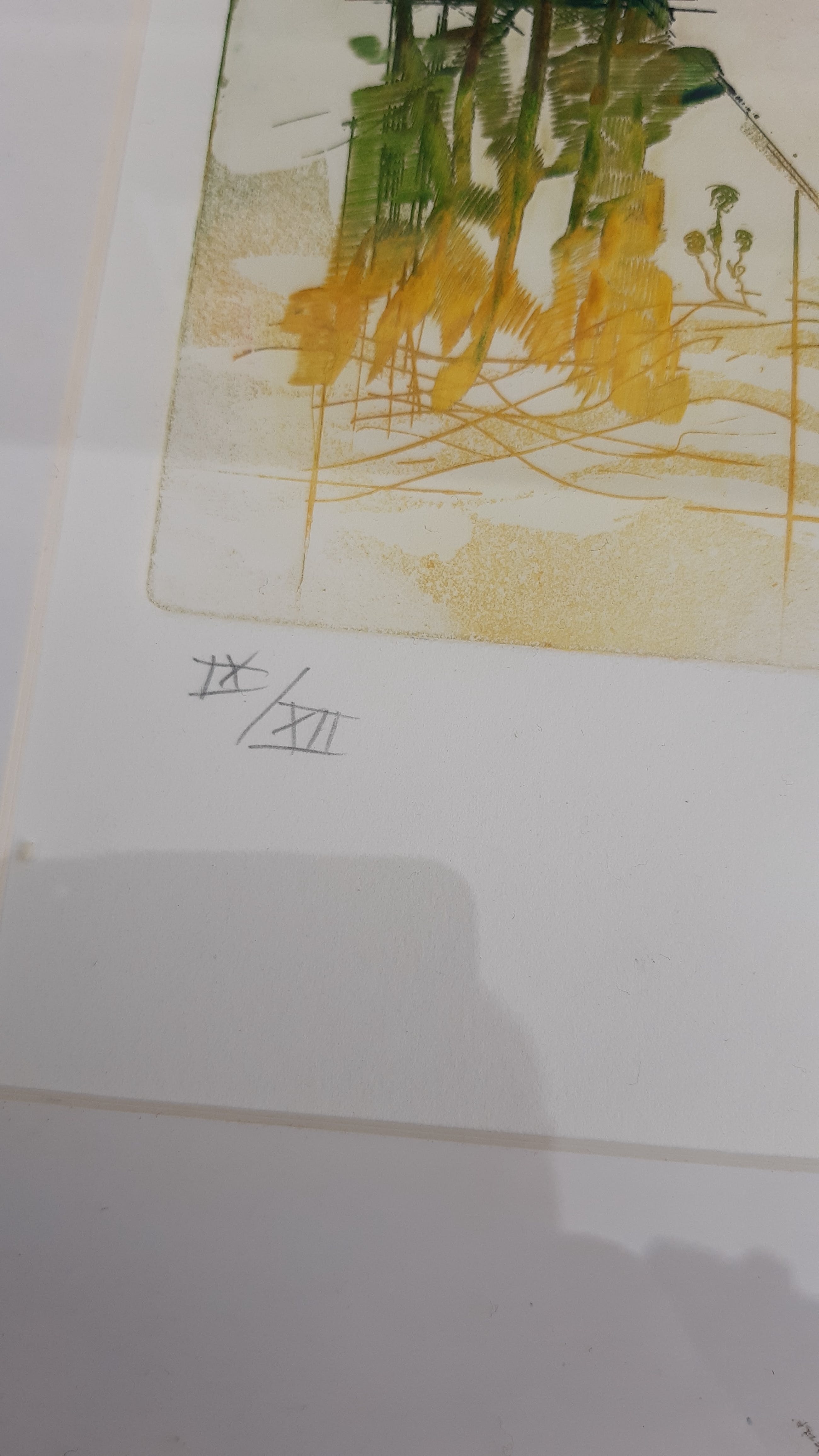 Mooi abstract expressief werk (kleurenets) van Olivier Beijn. Beijn bewerkt zijn etsplaten niet op de klassiek manier, maar gaat ze ten lijf met schuur- en slijpmachines. Komt in een eenvoudige kunststof lijst