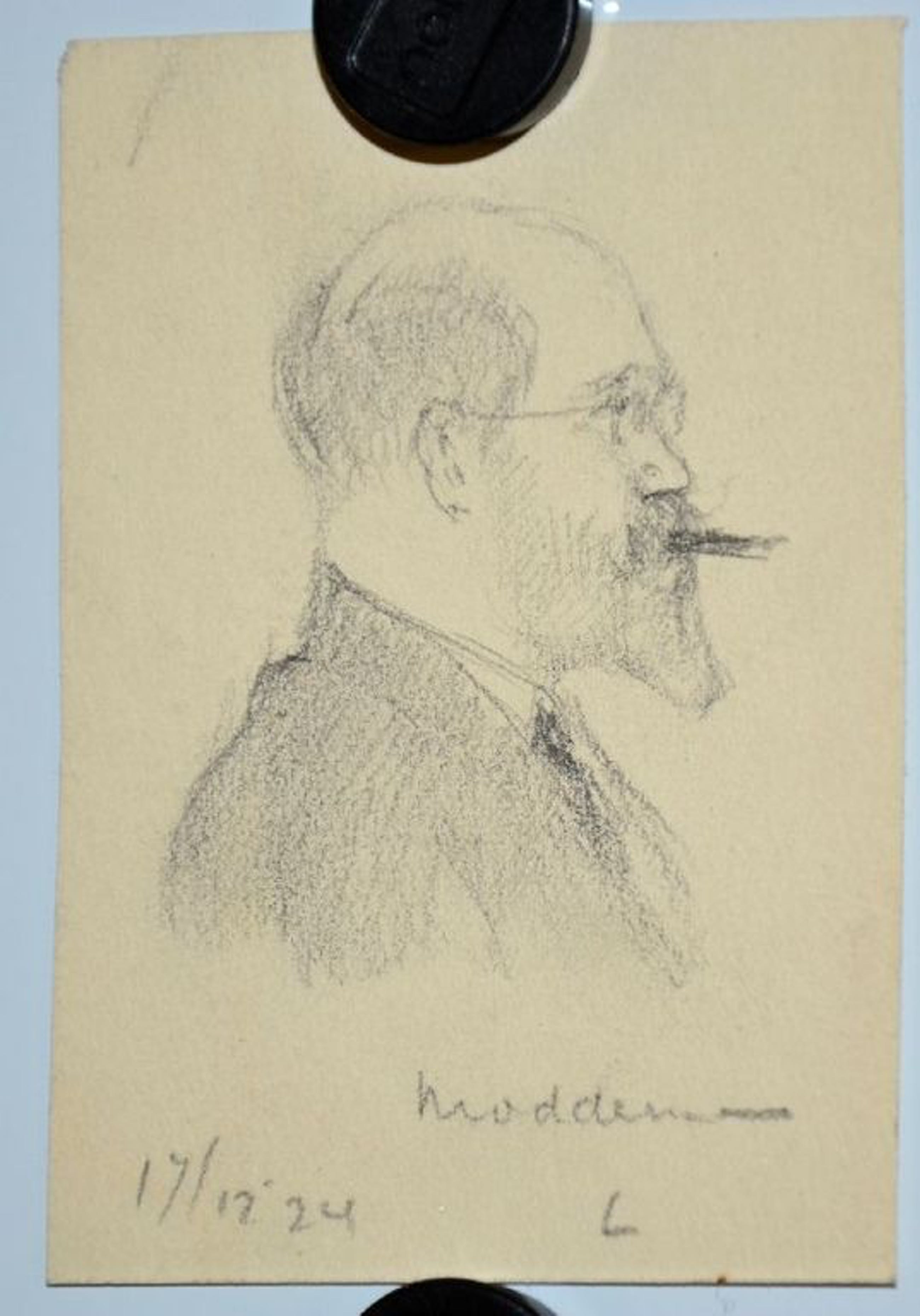 Beide werken zijn gedateerd 25/6/24 en 17/12/24 (blad: 10 cm x 8 cm en 9 cm x 6 cm) Op 1 van de 2 tekeningen staat nog met potlood: Modderman (waarschijnlijk de afgebeelde persoon)