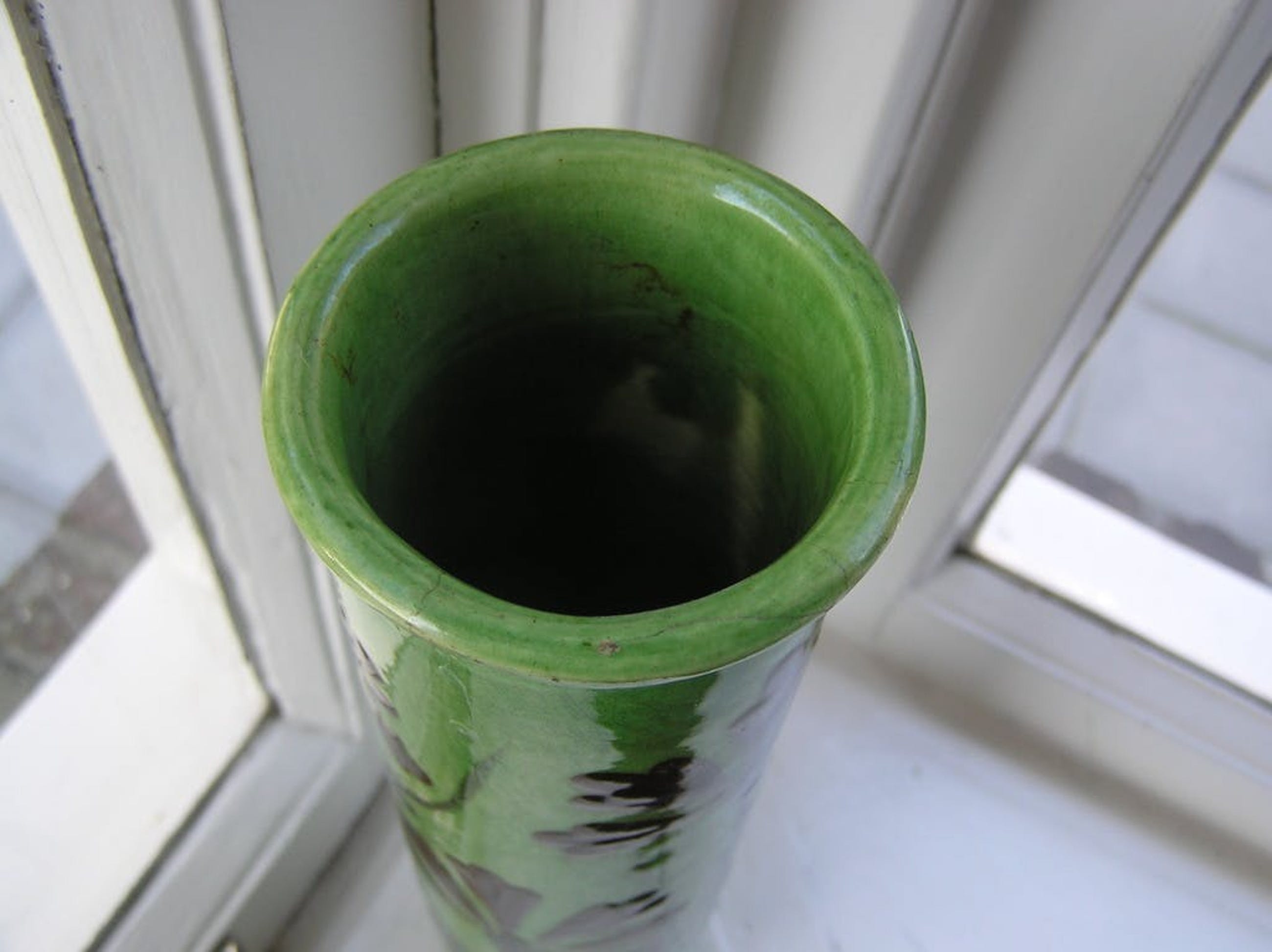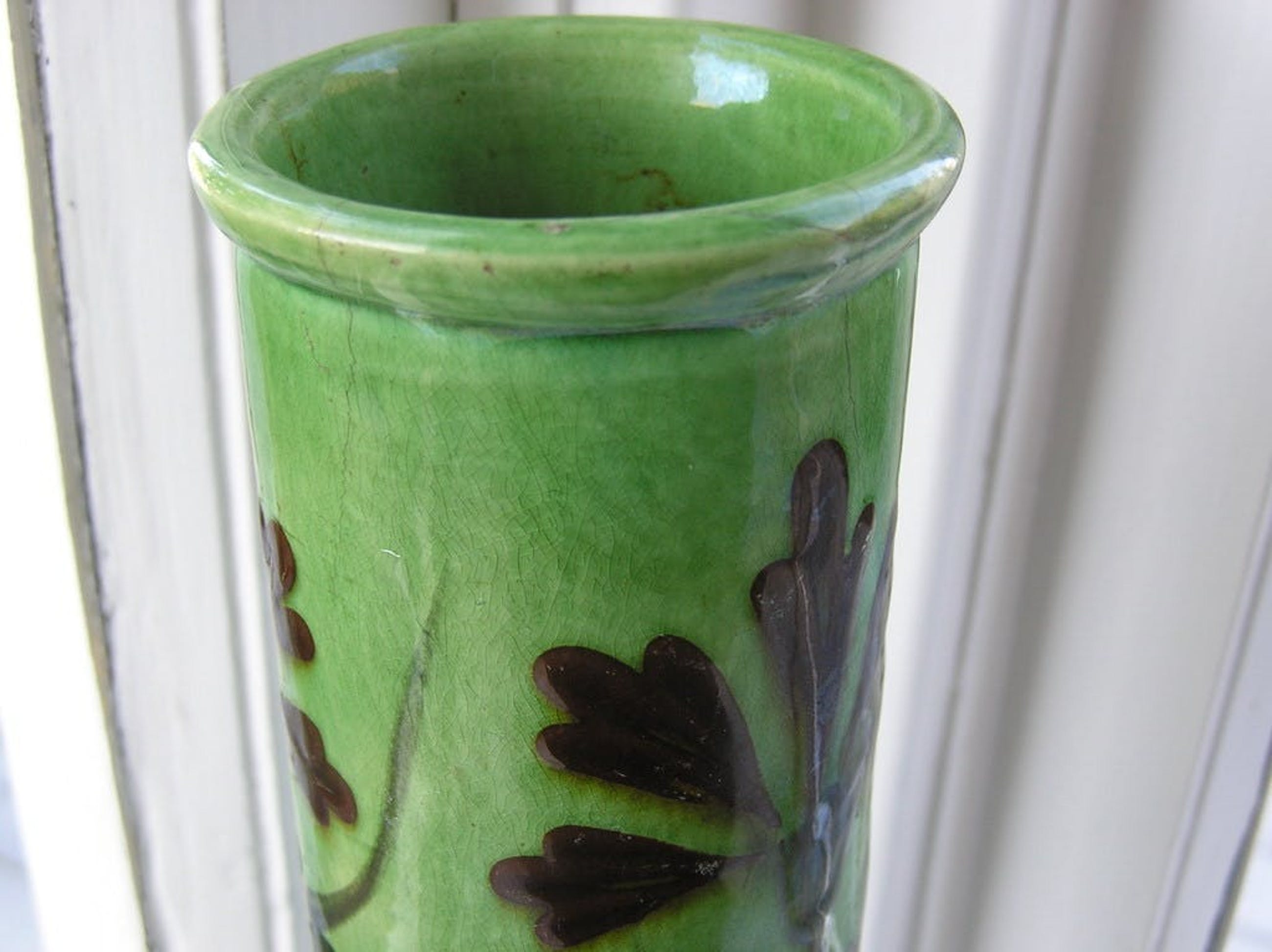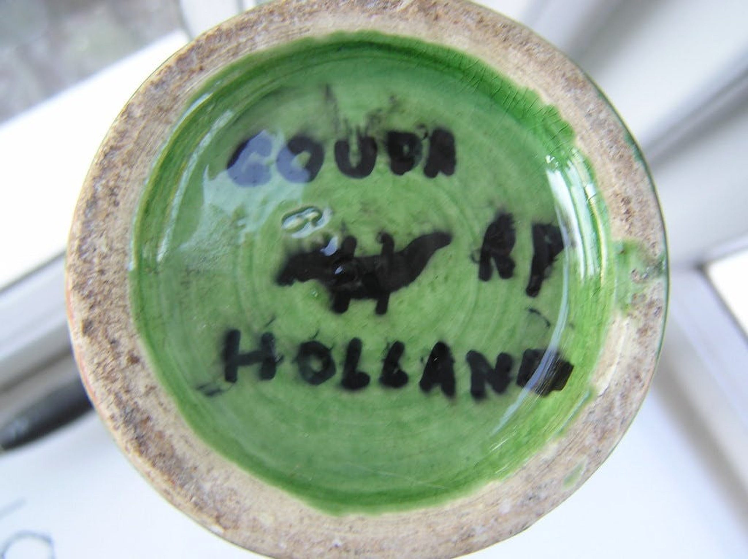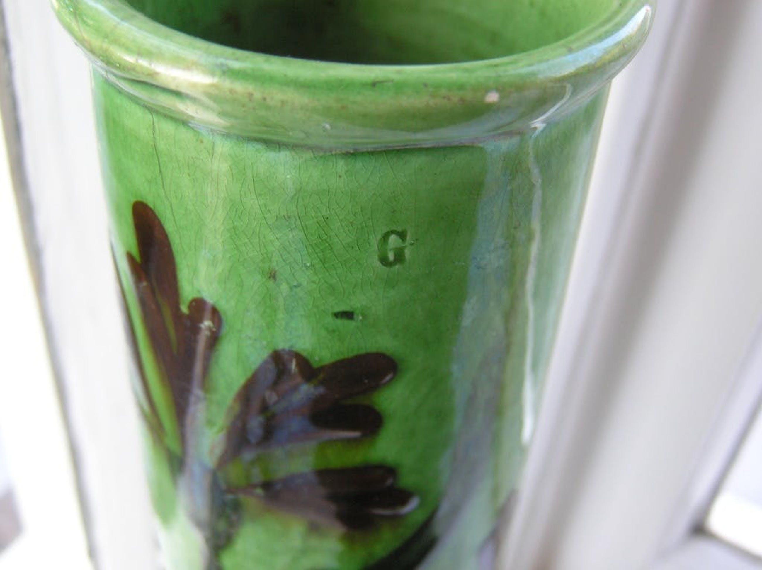 Art Nouveau (1900-1928) glansplatelen groene cilindervaas met een decor van distels. Hoogte 28 cm, diameter 20 cm. Bovenkant rand twee haarlijntjes en soms wat gecraqueleerd glazuur. Op de onderkant gemerk met penseel; Gouda, Holland en de letters RP = (Rembrandt Potterie)? De productie van de potterie Rembrandt is in 1925 voorgezet bij de Zuid-Holland in Gouda. Ingedrukt nummer 9 en een signatuur CH? Curieus op de zijkant is een G ingedrukt. van Gouda?