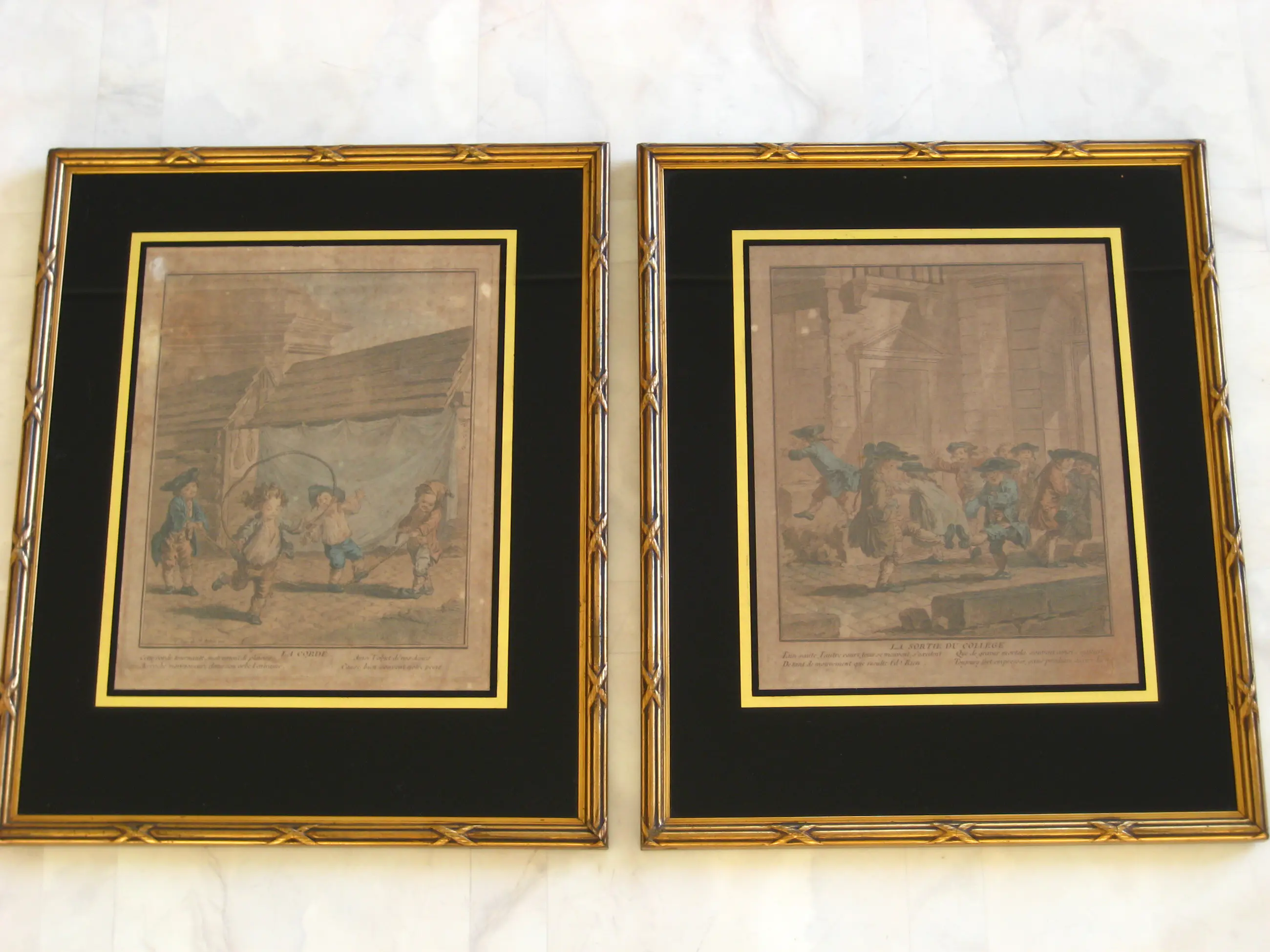 Twee antieke gravures.Klassiek ingelijst.Voorstellingen hebben ouderdomssporen.Afhalen of aangetekende, verzekerde verzending.