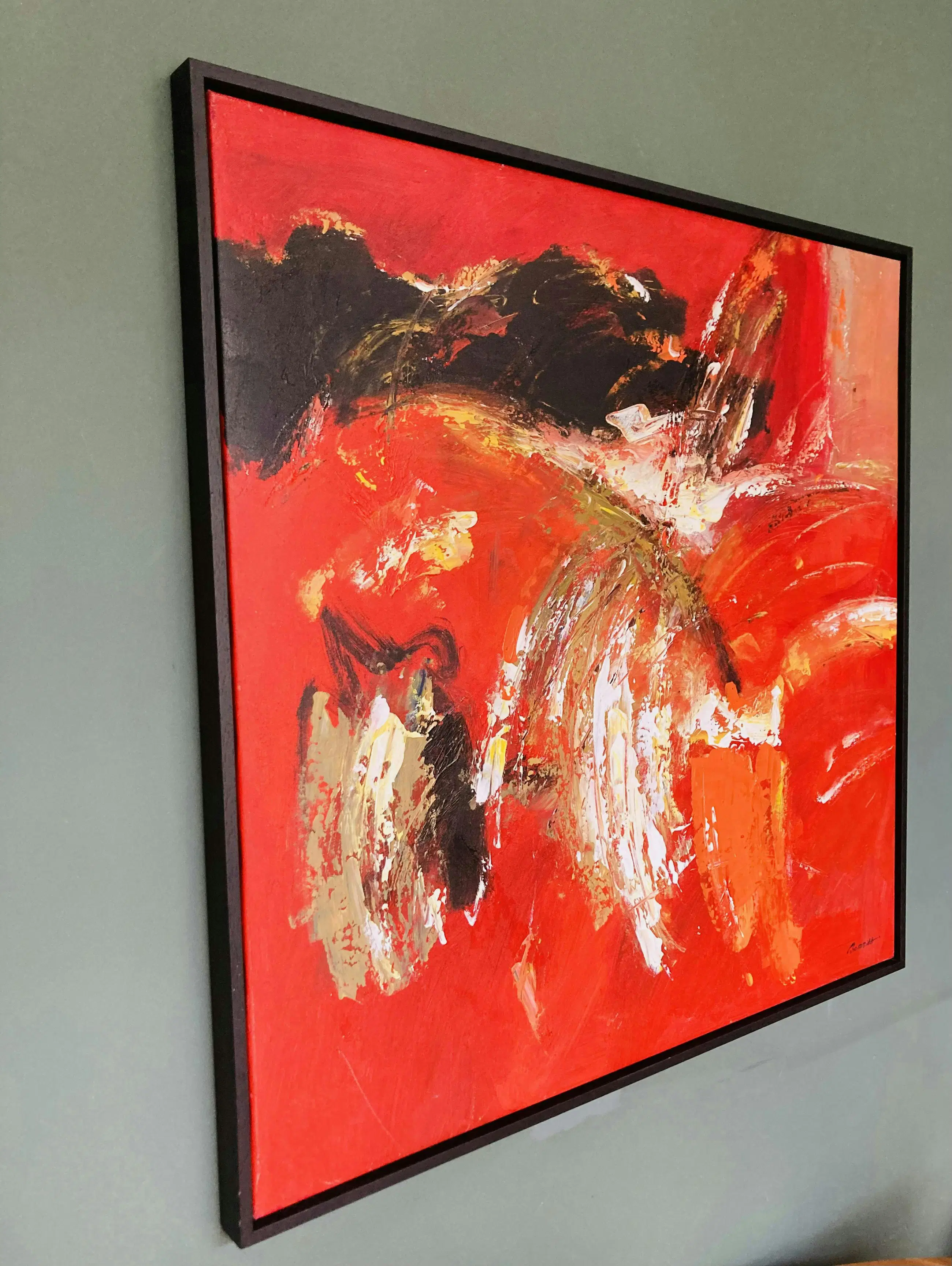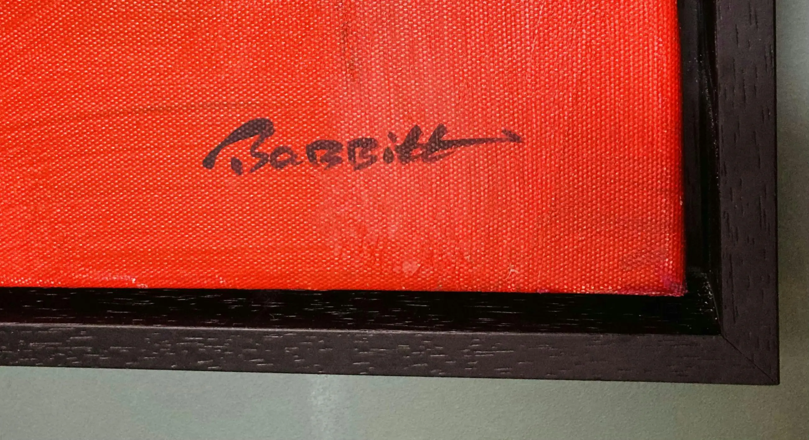 Prachtig groot (80x80) abstract werk gesigneerd met “Babbitt”. Er zijn meerdere kunstenaars met deze naam, helaas heb ik niet kunnen achterhalen welke Babbitt dit schilderij heeft gemaakt. Werk is recent ingelijst in een houten zwarte baklijst.