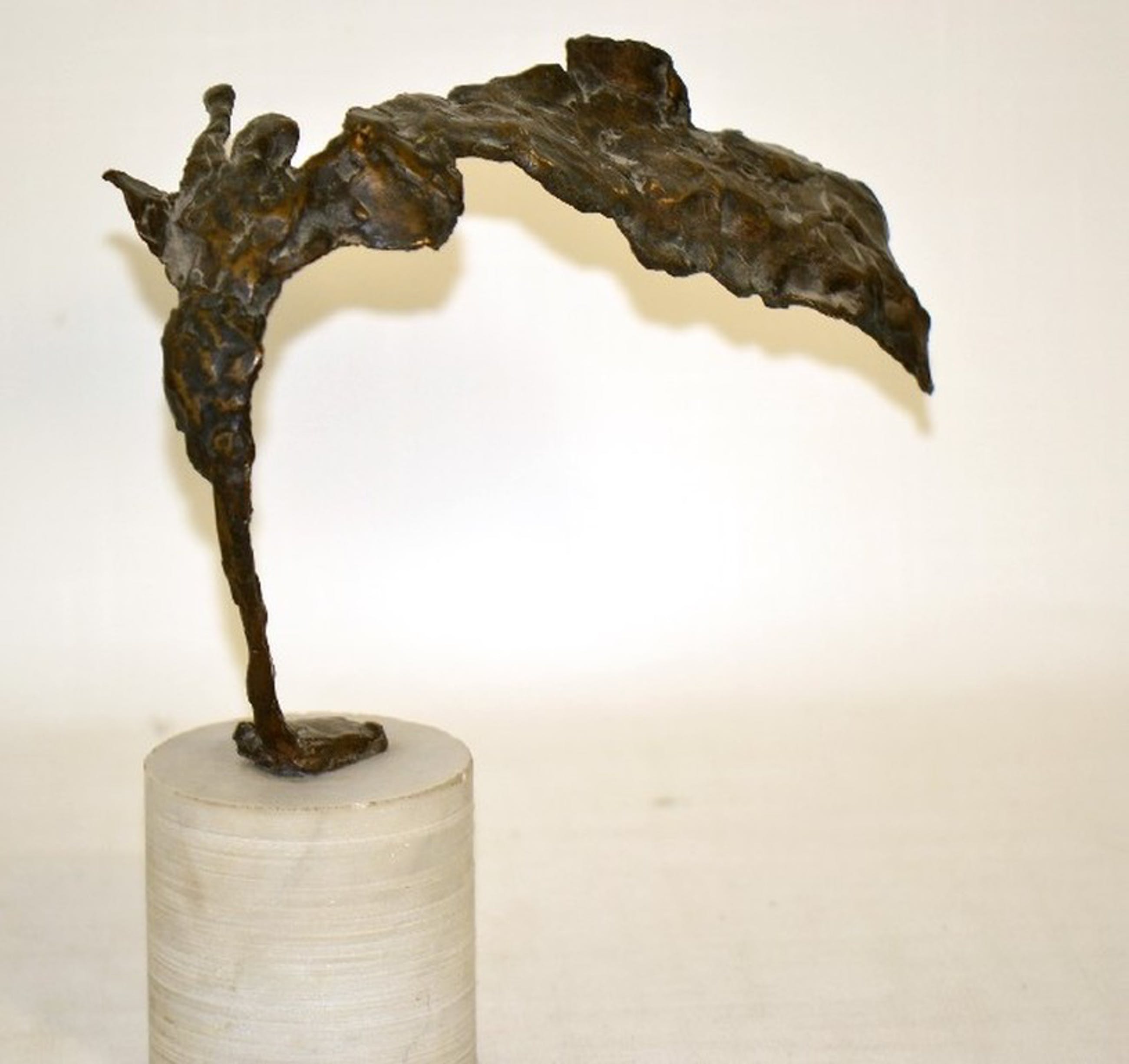 Mooie massief bronzen sculptuur op een wit marmeren sokkel. Ook dit beeld komt uit de particuliere collectie die wij momenteel veilen. Het sculptuur verbeeldt een engel met 1 vleugel. Ongetwijfeld aangekocht bij een goede galerie, maar helaas hebben wij niet kunnen vinden in de administratie en ook op het beeld geen signatuur kunnen vinden.
