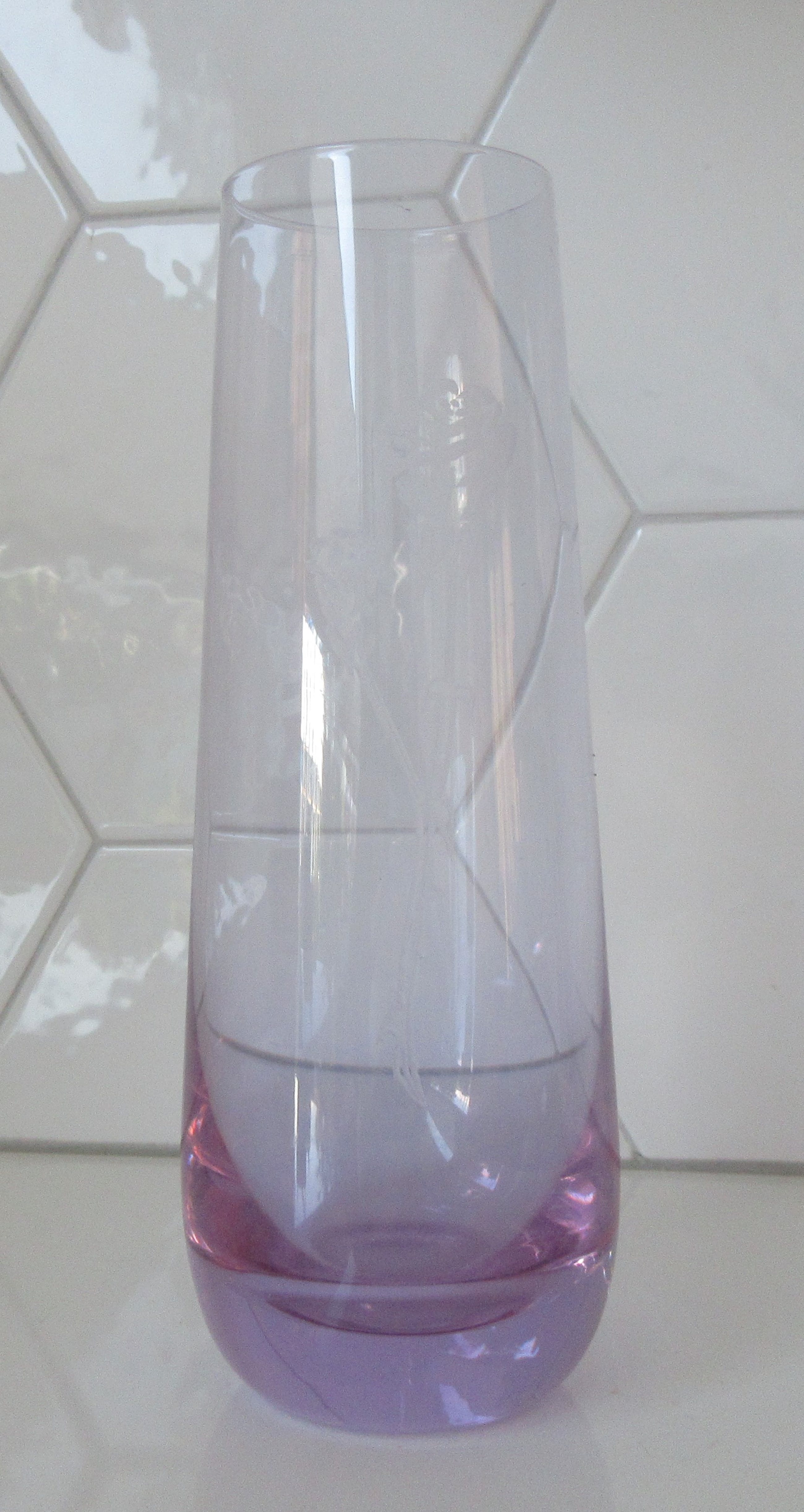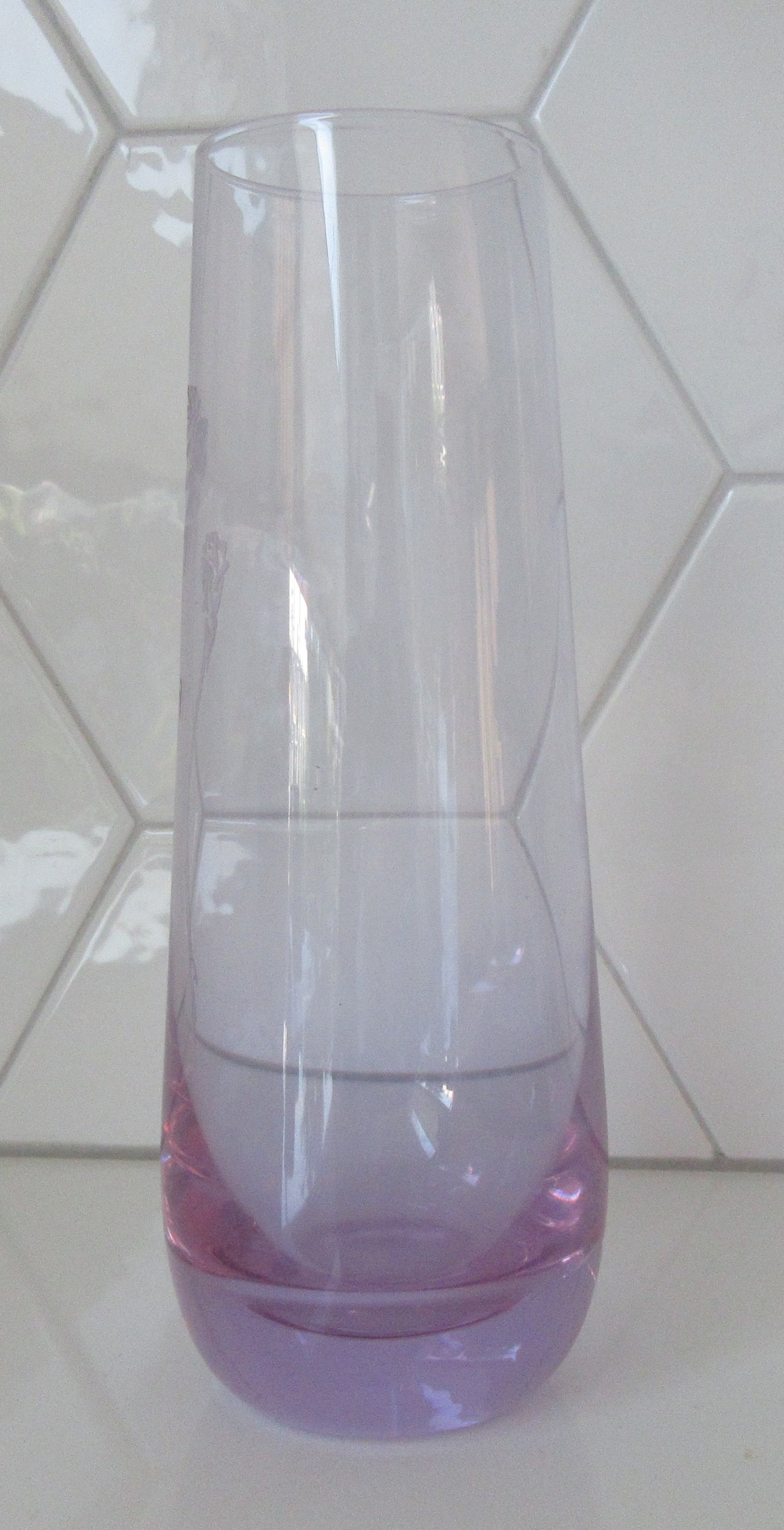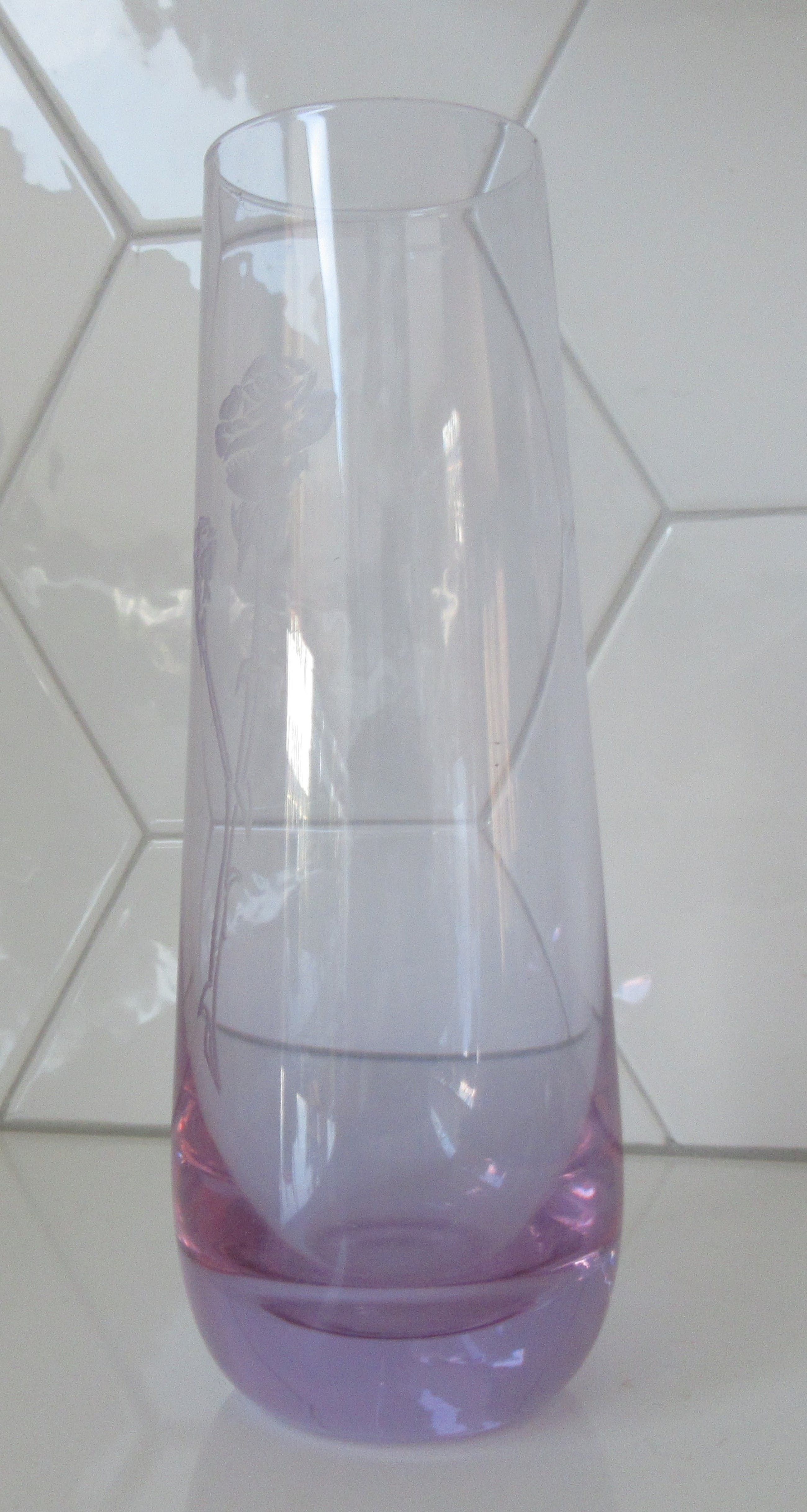 Lila Neodymium Alexandrite vaas met etsdecor, "Roses" door Caithness Glass Schotland. Geëtste decoratie van rozen. Het Neodymium glas kan verkleuren, de vaas kan er ook lichtblauw uitzien. Gesigneerd Joan en datum 23-4-86.