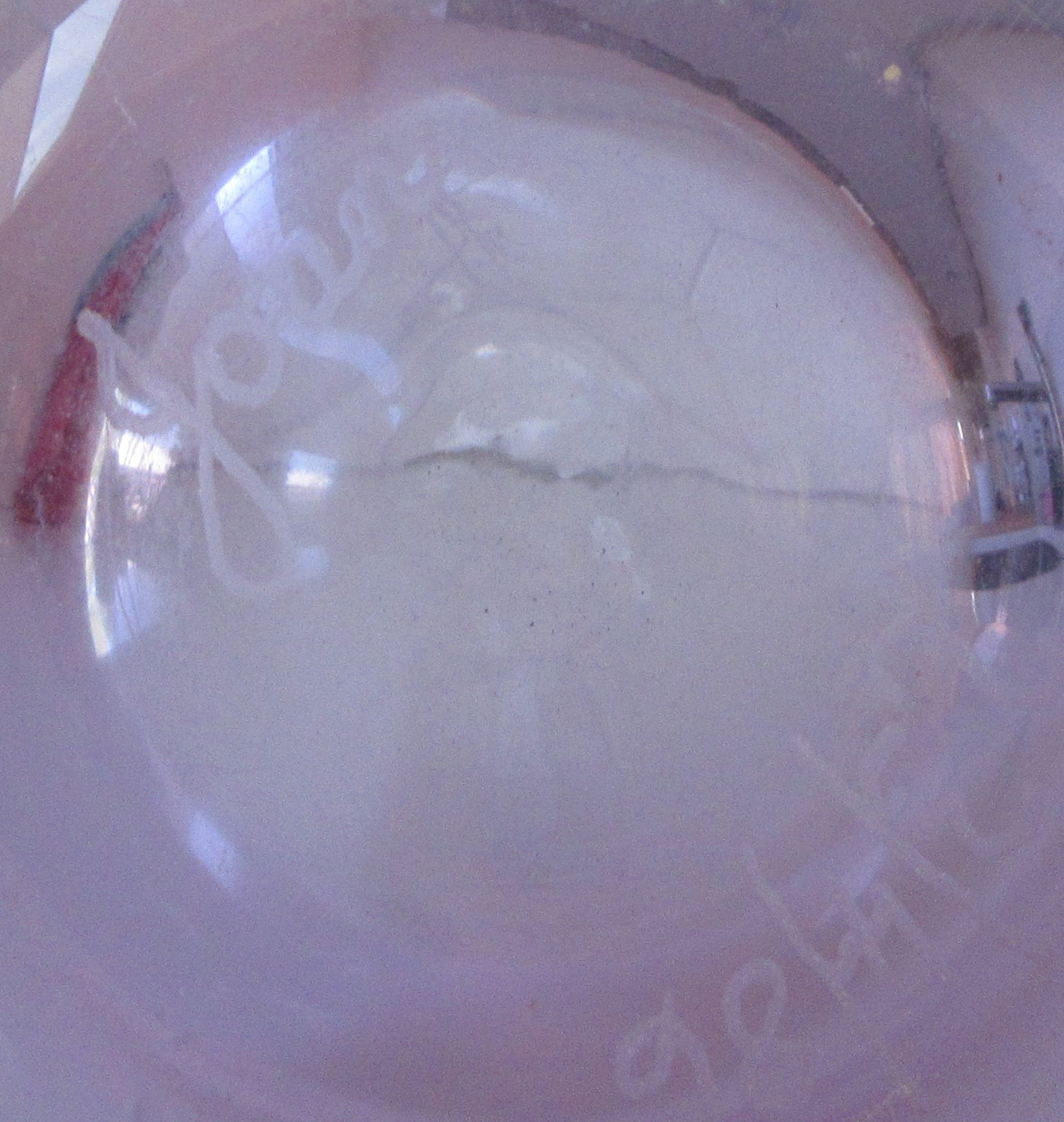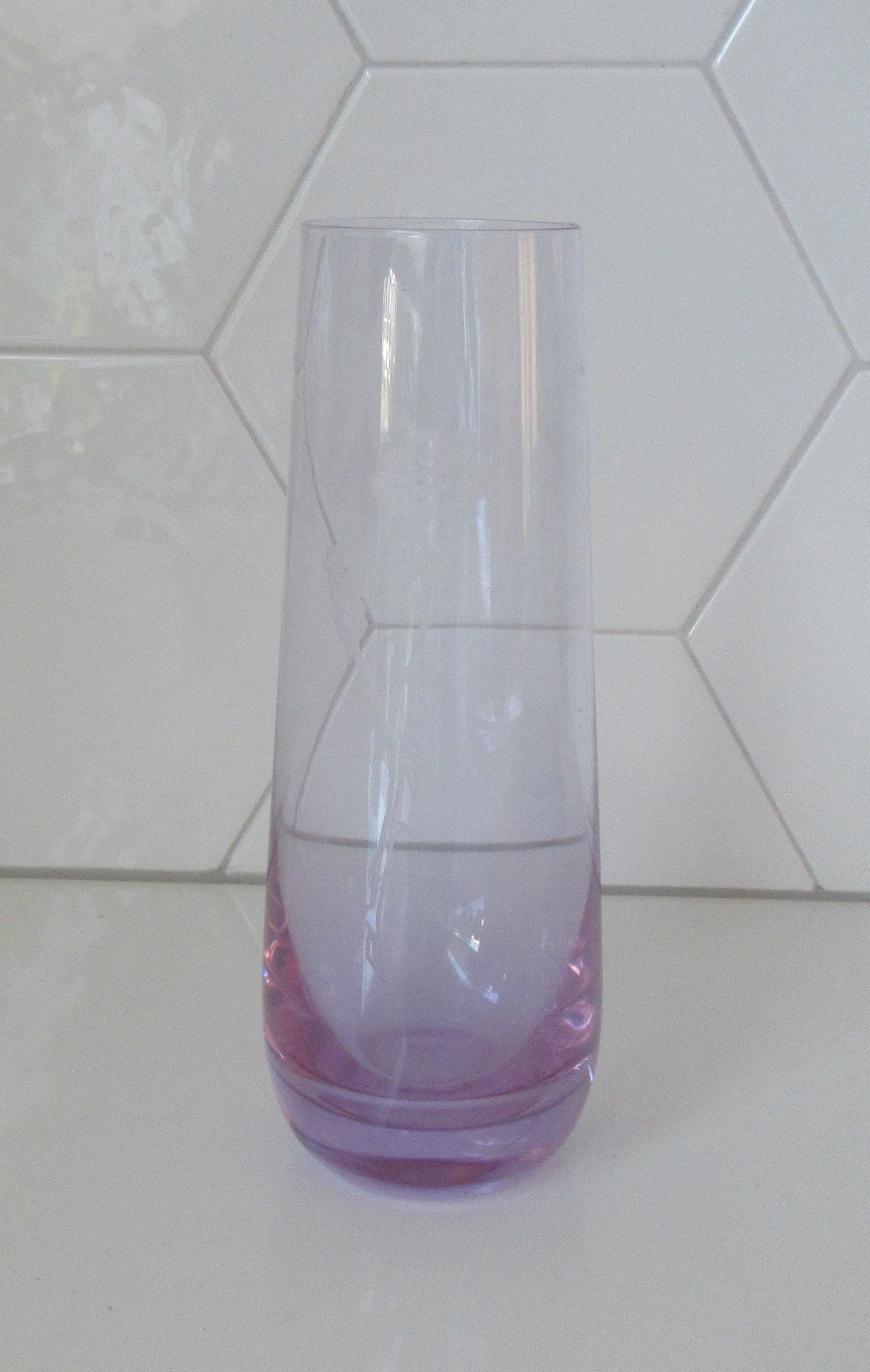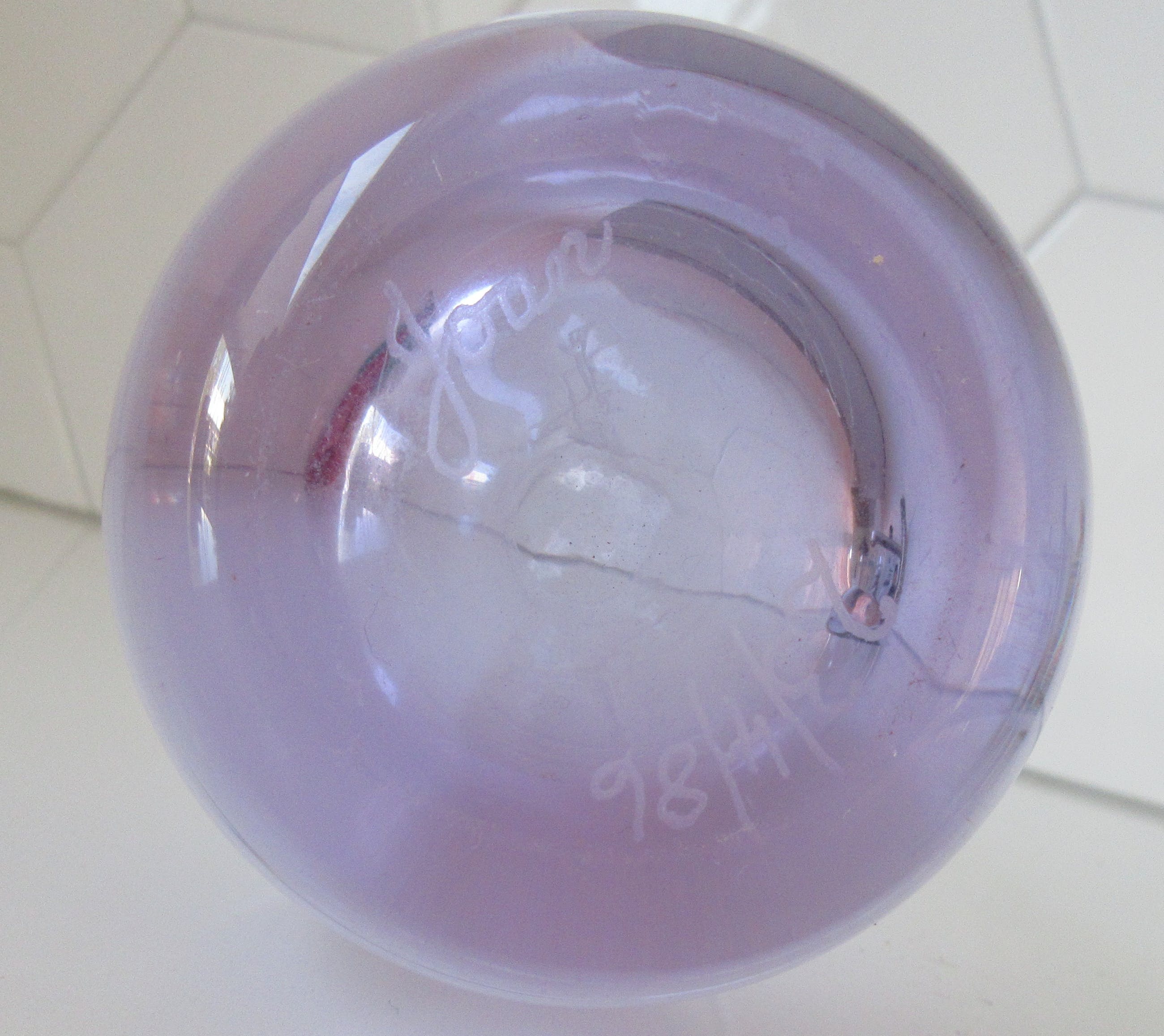 Lila Neodymium Alexandrite vaas met etsdecor, "Roses" door Caithness Glass Schotland. Geëtste decoratie van rozen. Het Neodymium glas kan verkleuren, de vaas kan er ook lichtblauw uitzien. Gesigneerd Joan en datum 23-4-86.